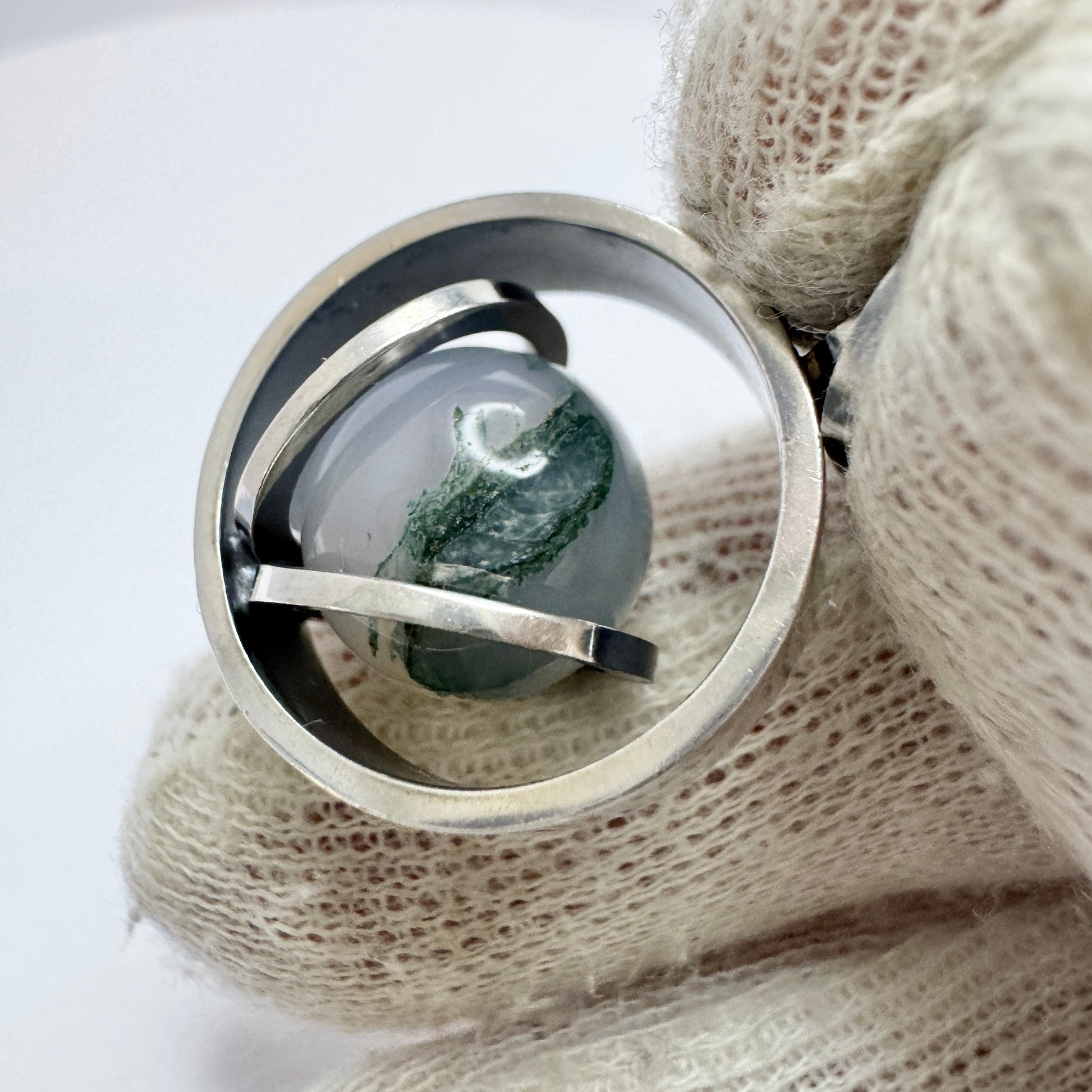 Wonderful and much sought after vintage solid silver kinetic caged moss agate pendant. Hallmarked for renowned Elis Kauppi, Kupittaan Kulta Finland year 1966.