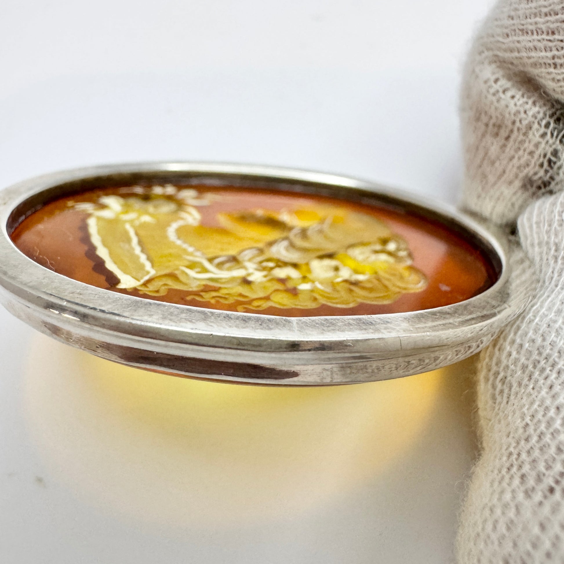 Beautiful vintage sterling silver amber intaglio pendant. Hallmarked for Gdansk Poland, unidentified makers mark.