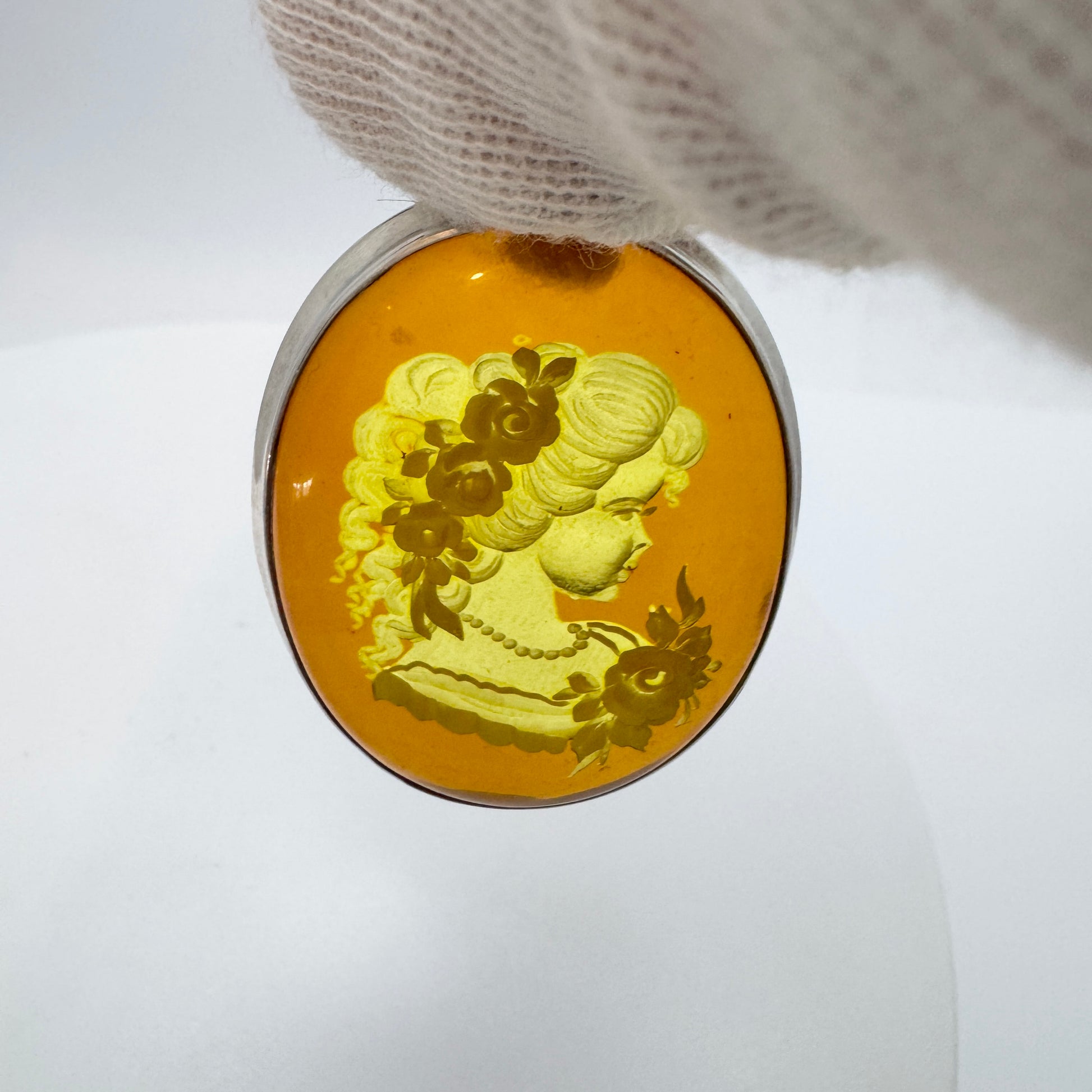 Gdansk Poland. Vintage Sterling Silver Carved Amber Intaglio Pendant.