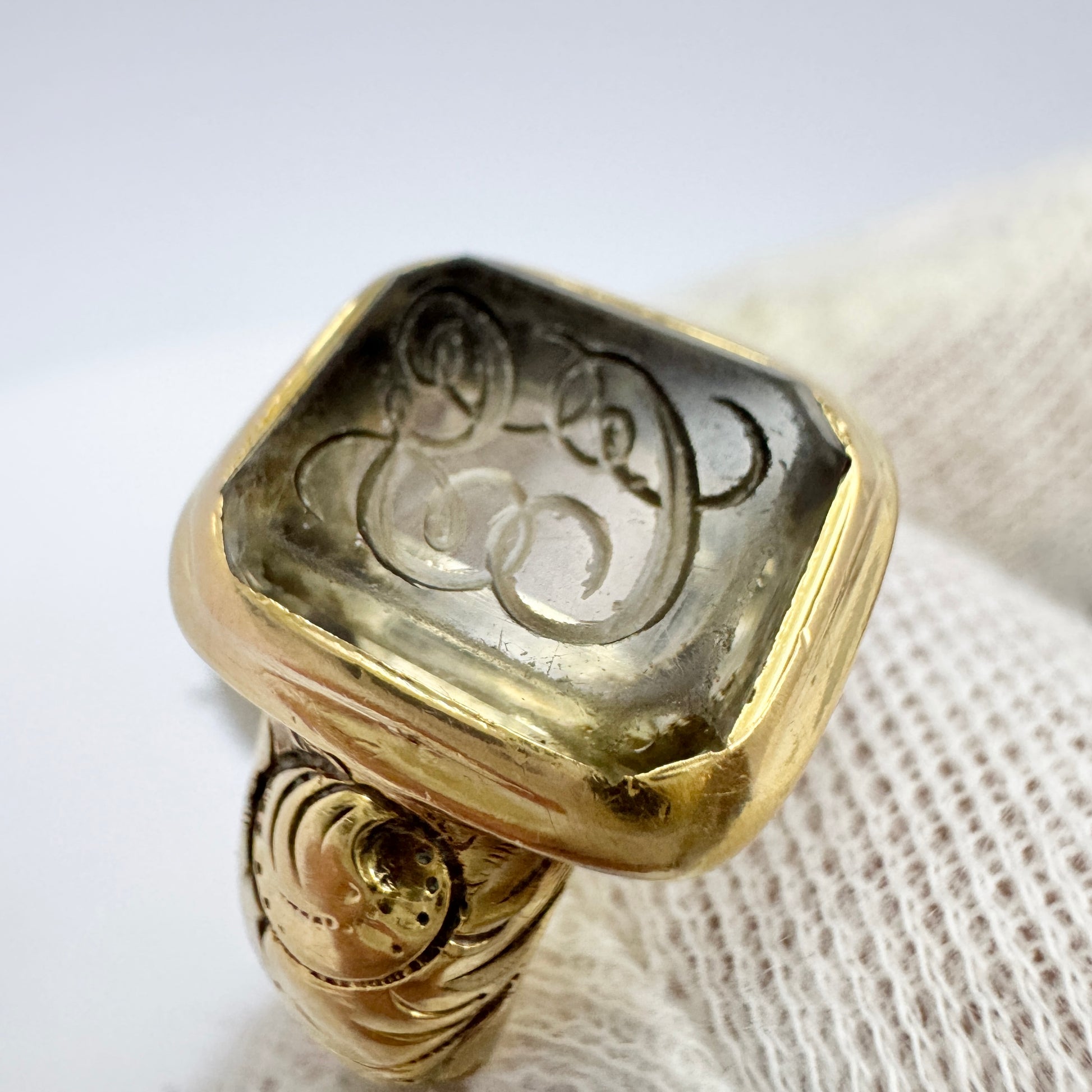 Very charming antique Victorian 18k gold rock crystal signet ring.Hallmarked for royal warrant holder Gustav Möllenborg, Stockholm, Sweden year 1877.