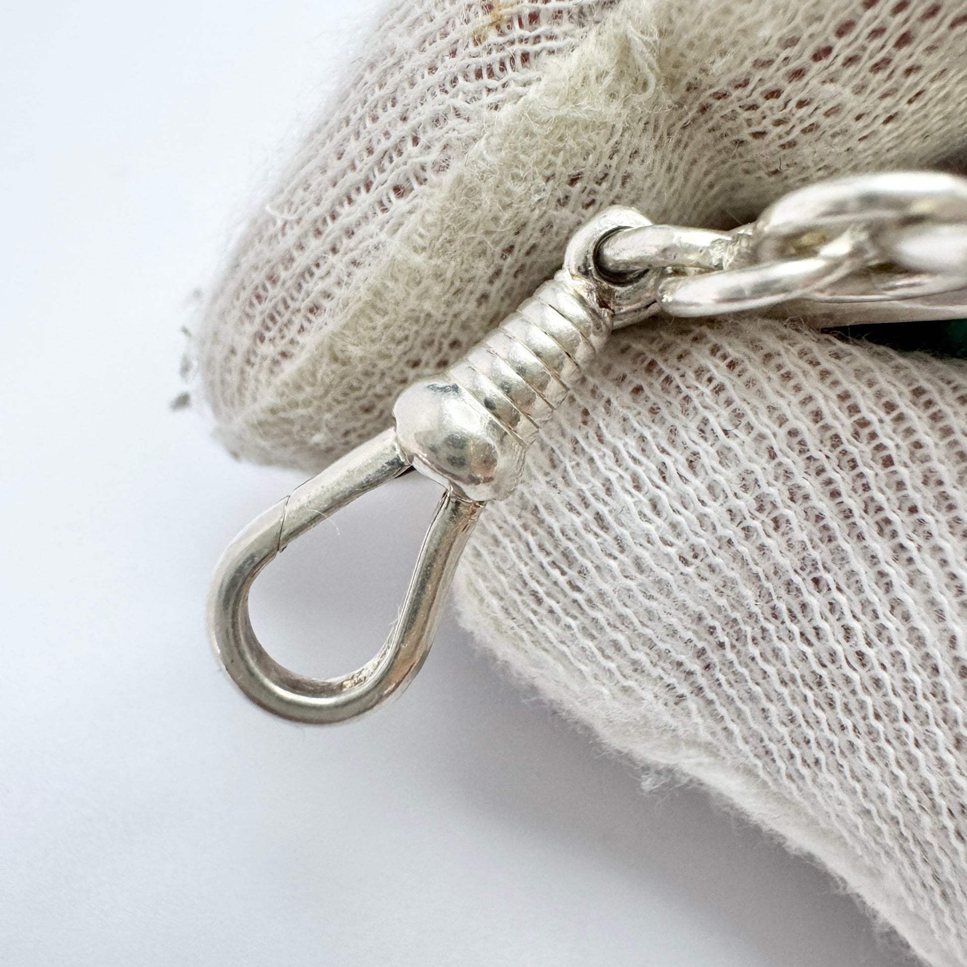 Beautiful and large vintage sterling silver malachite pendant. The bale is a dog clip. Not sure if this is a necklace pendant or Albert chain / chatelaine pendant. Apparently unmarked. Dog clip is soldered in place and period with the pendant. Decoration rings are hand soldered. The piece got some age.