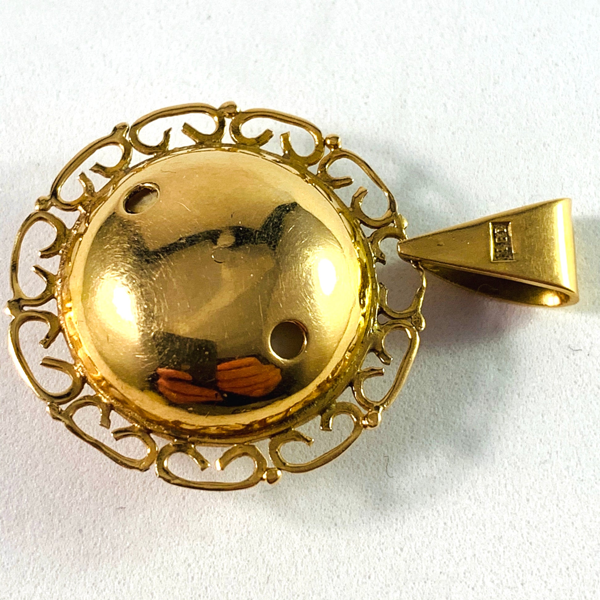 Wonderful mid century 18k gold white / angel skin coral pendant. Marked for Swedish import, 18k gold. Most likely made in Italy c 1950.