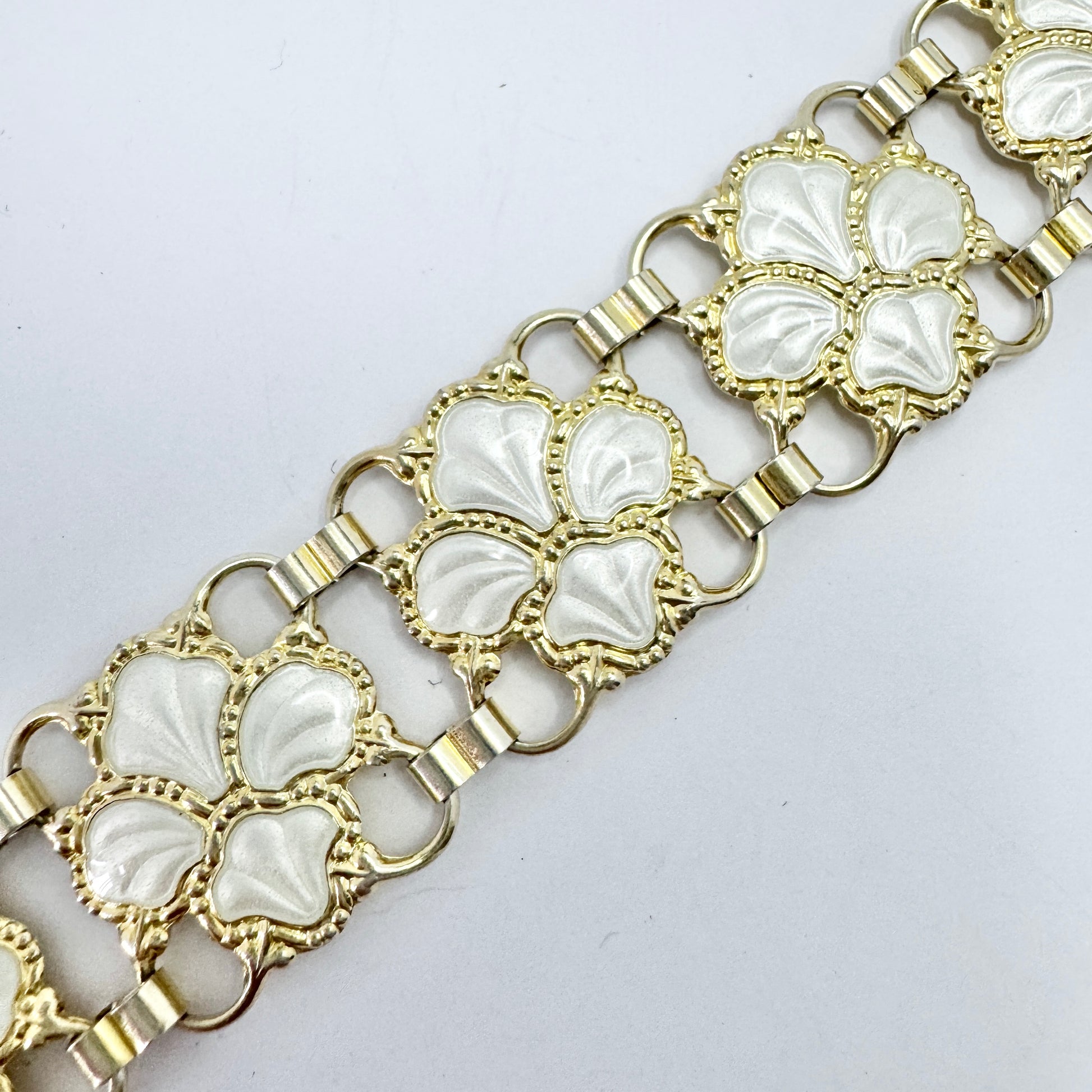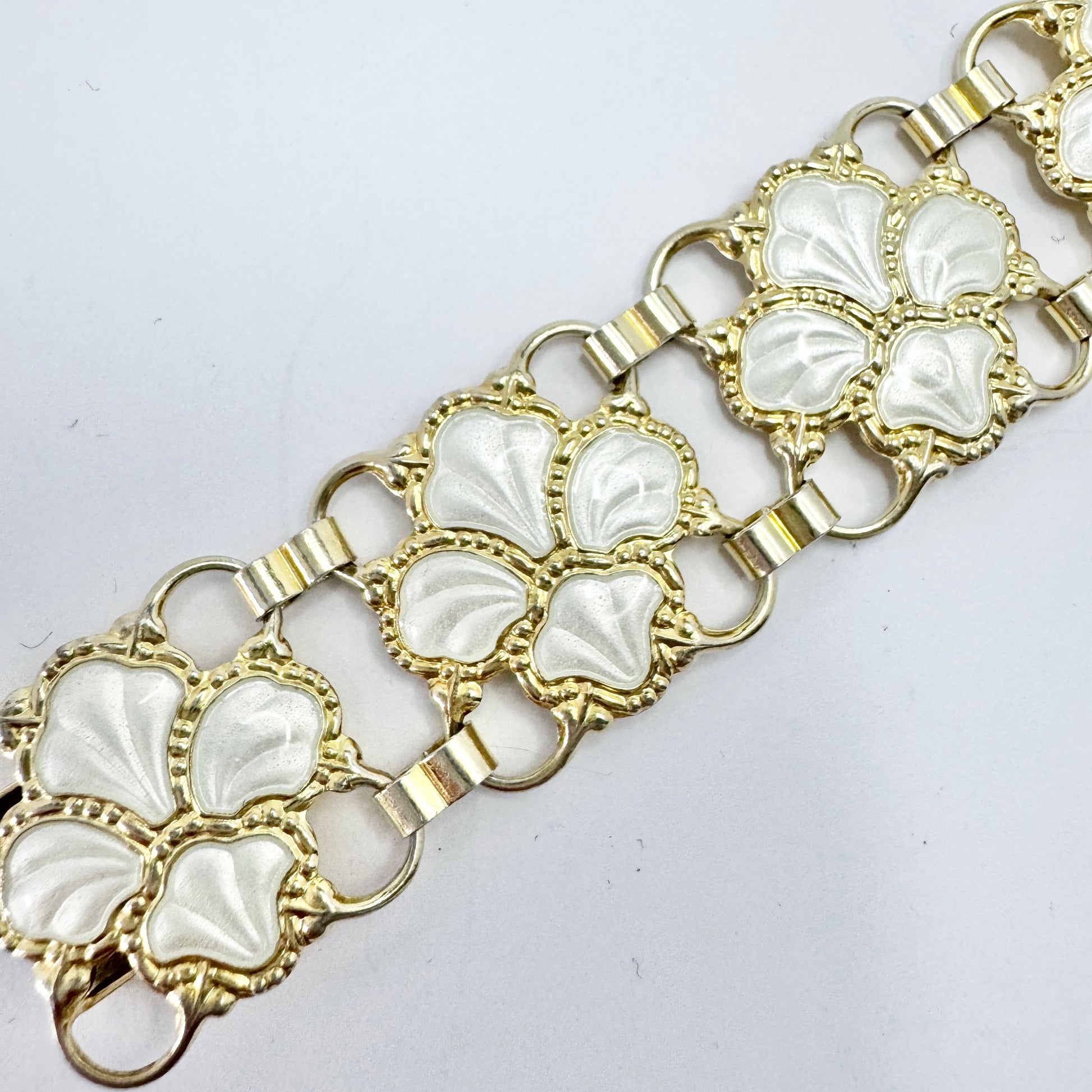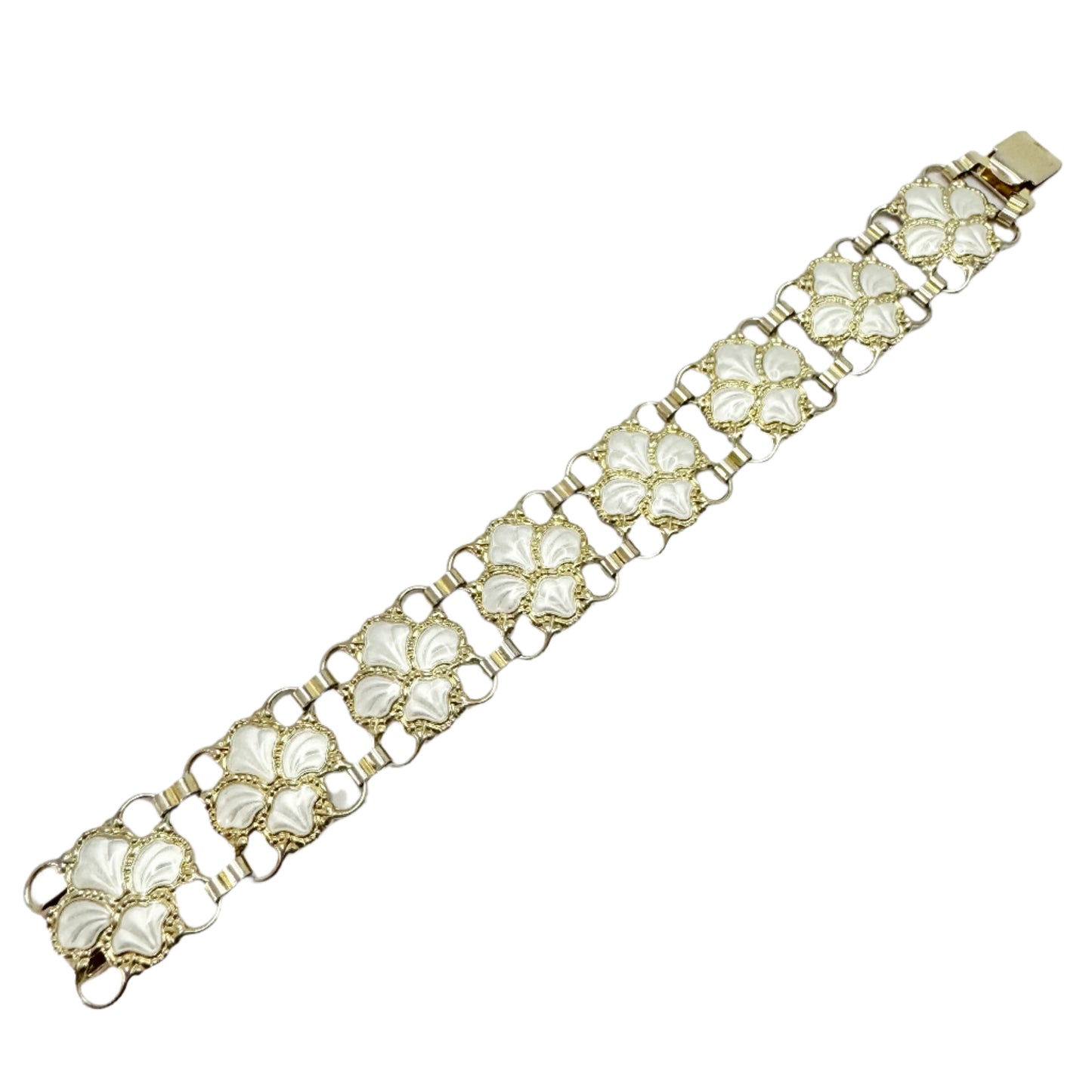Wonderful vintage gold gilt sterling silver white enamel bracelet. Norwegian hallmarks ca 1950s, indistinct makers mark, possibly David-Andersen.