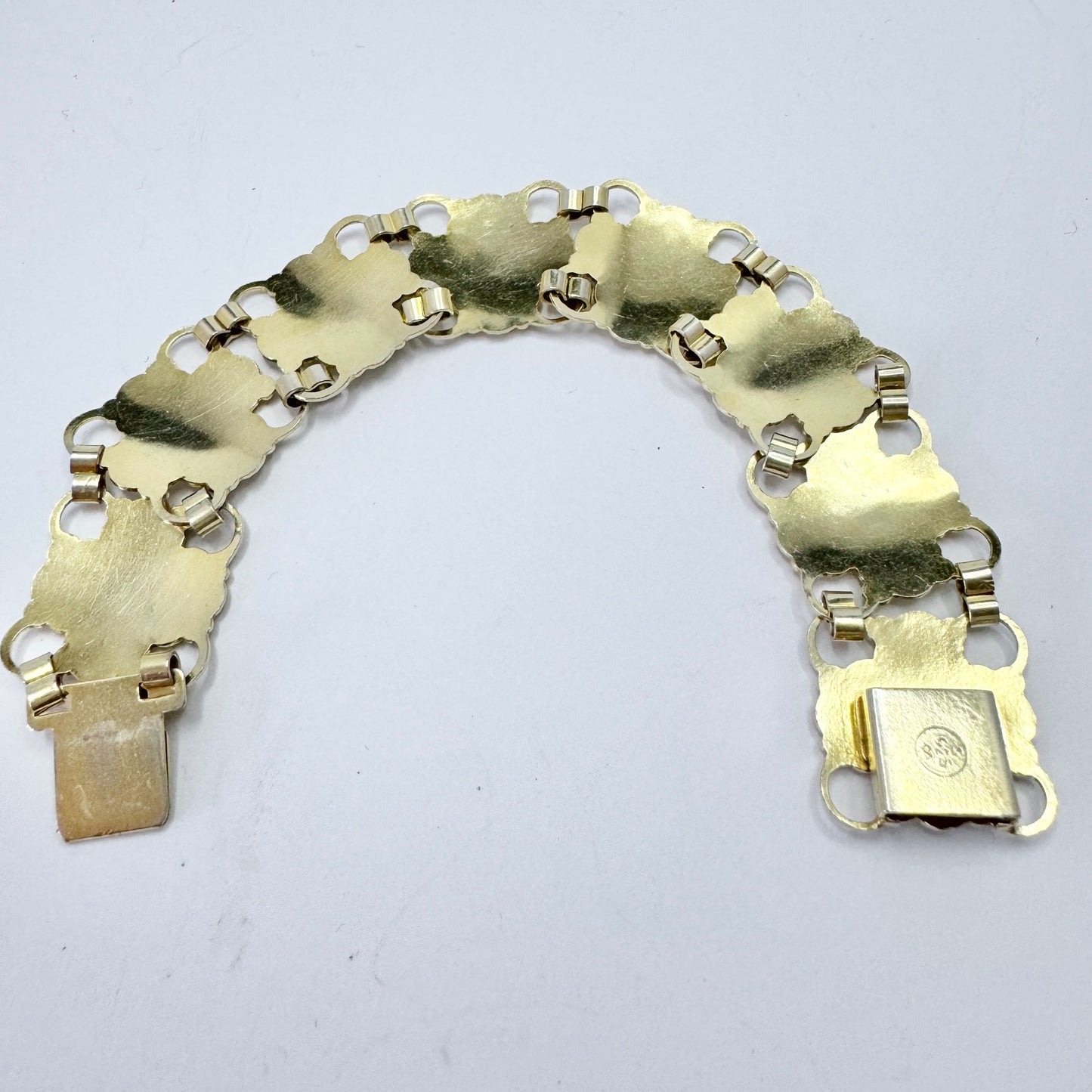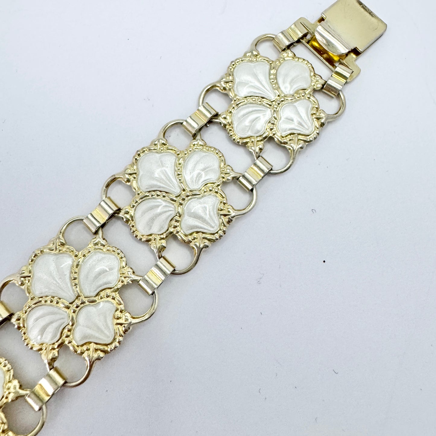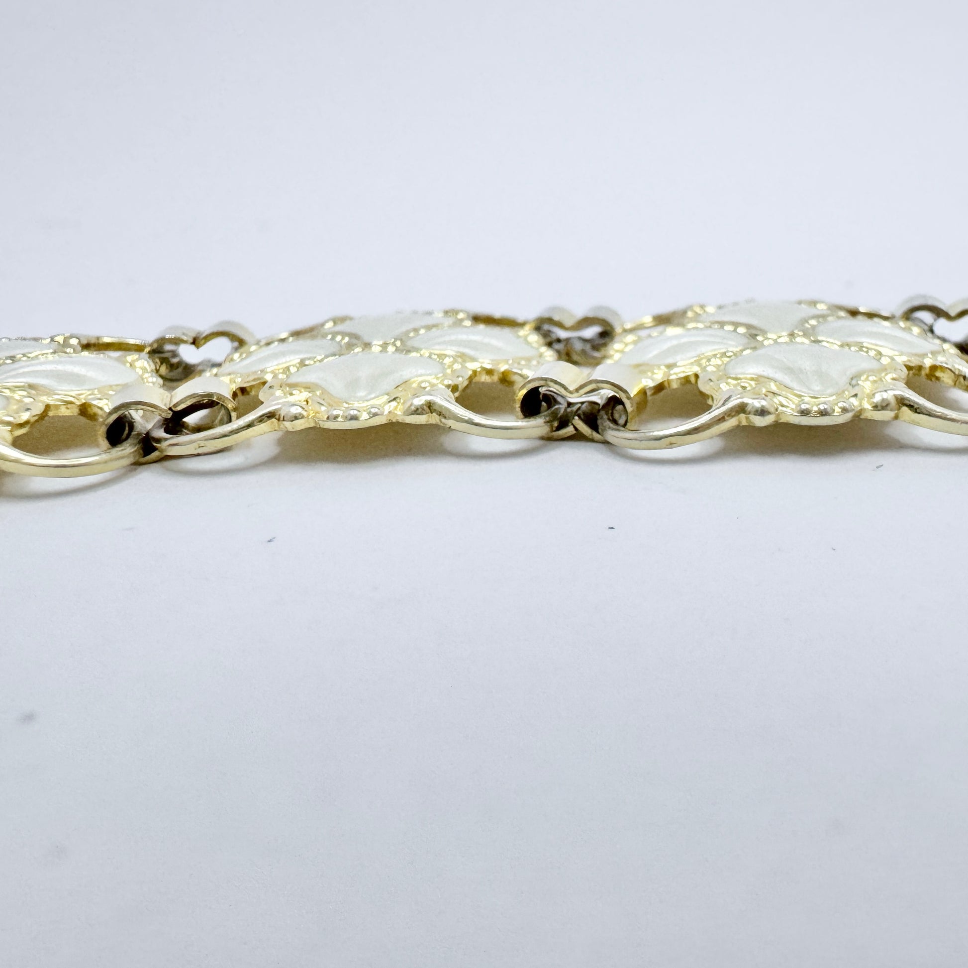 Wonderful vintage gold gilt sterling silver white enamel bracelet. Norwegian hallmarks ca 1950s, indistinct makers mark, possibly David-Andersen.