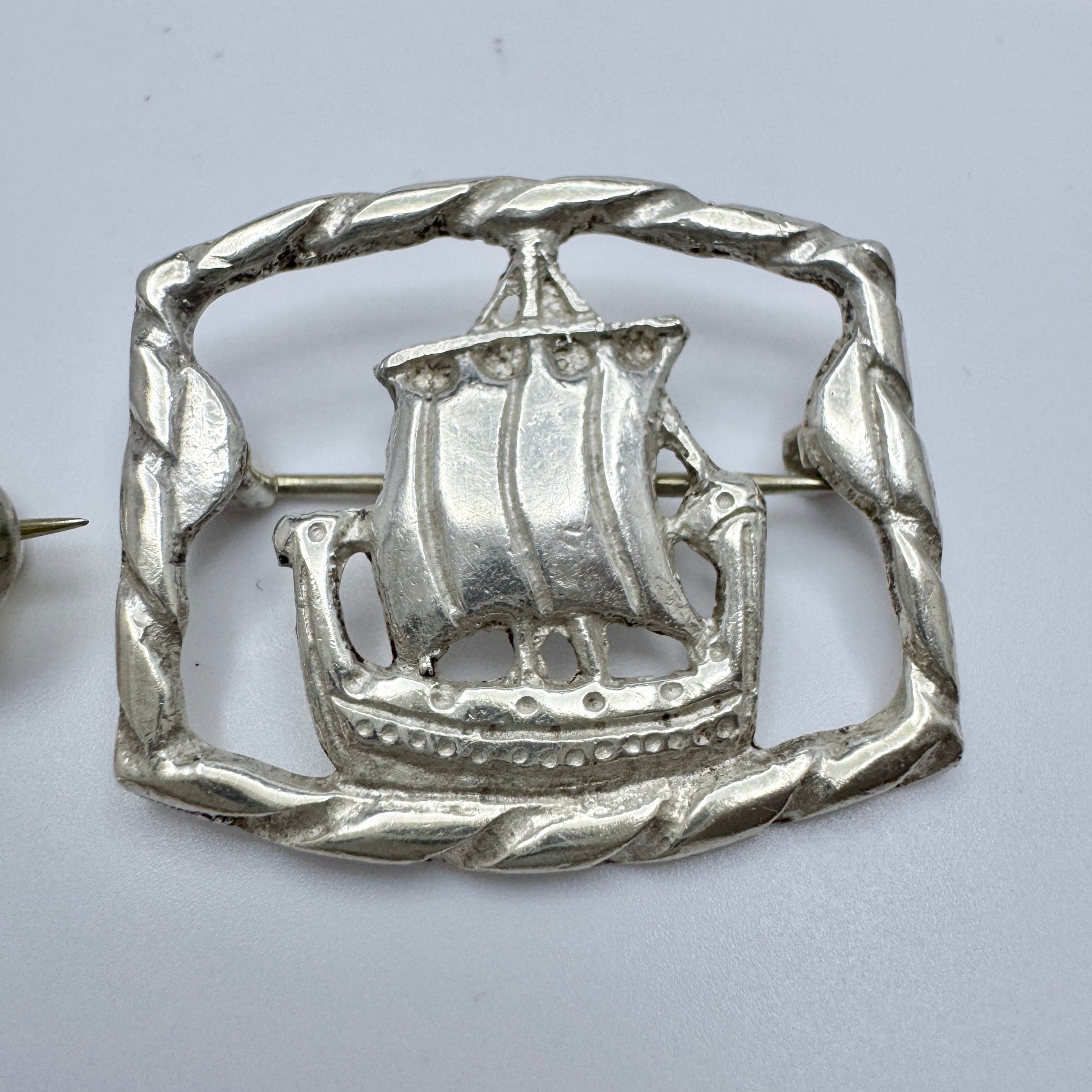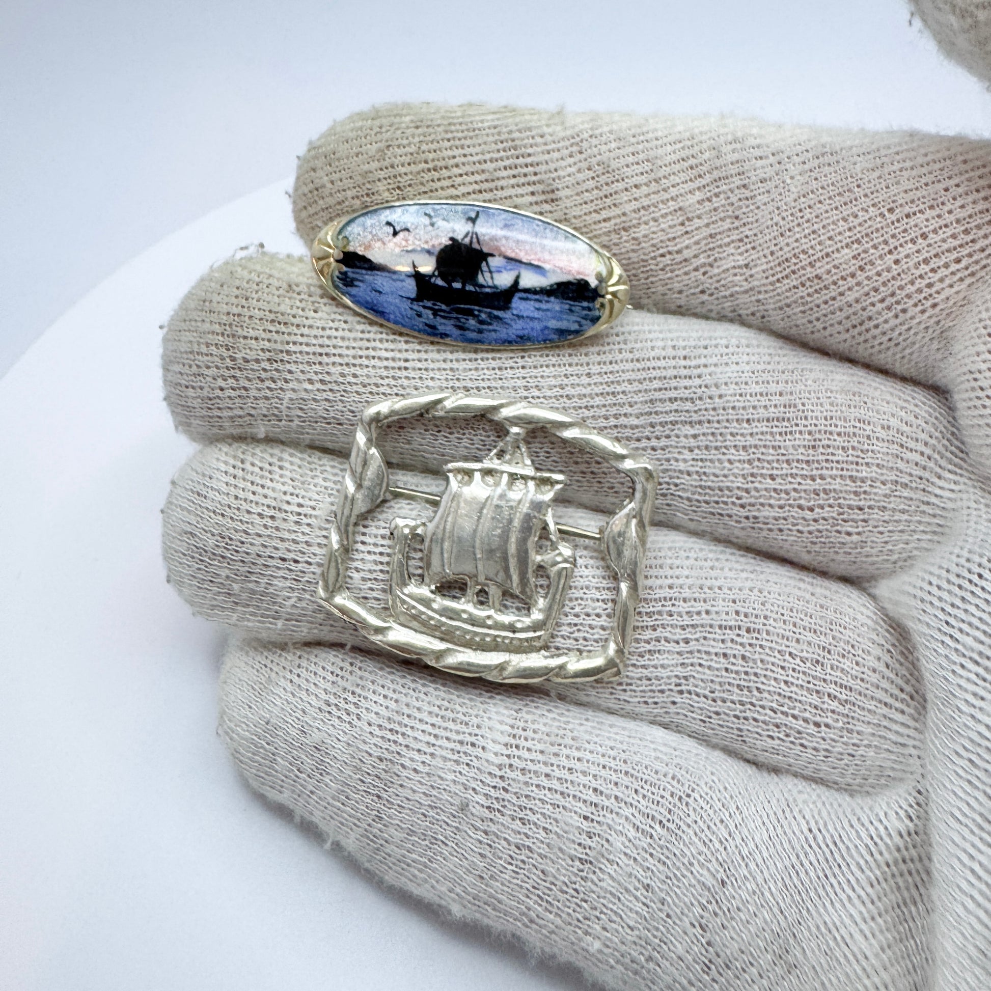 Two Vintage Scandinavian Solid Silver Viking Ship Brooches.