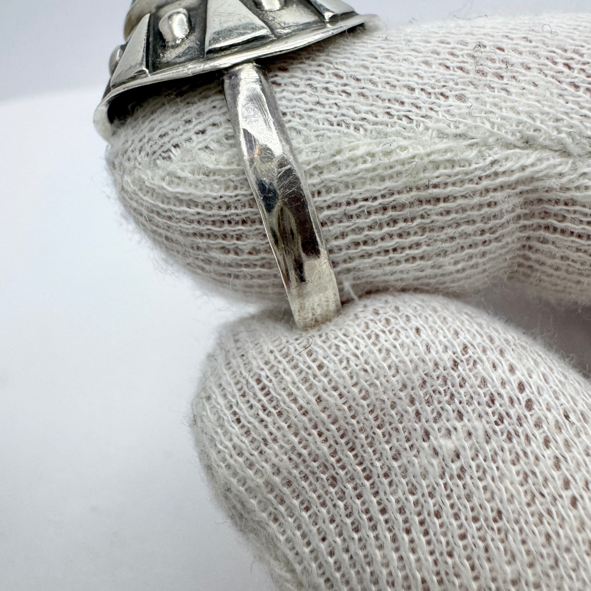 Wonderful vintage mid century modern solid silver chrysoprase ring. Hallmarked for 835 silver and Swedish import marks. Continental Europe ca 1950s. Hand hammered band.