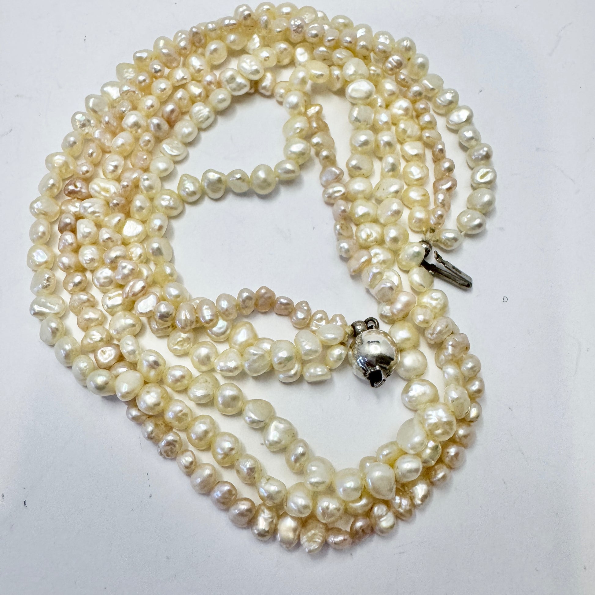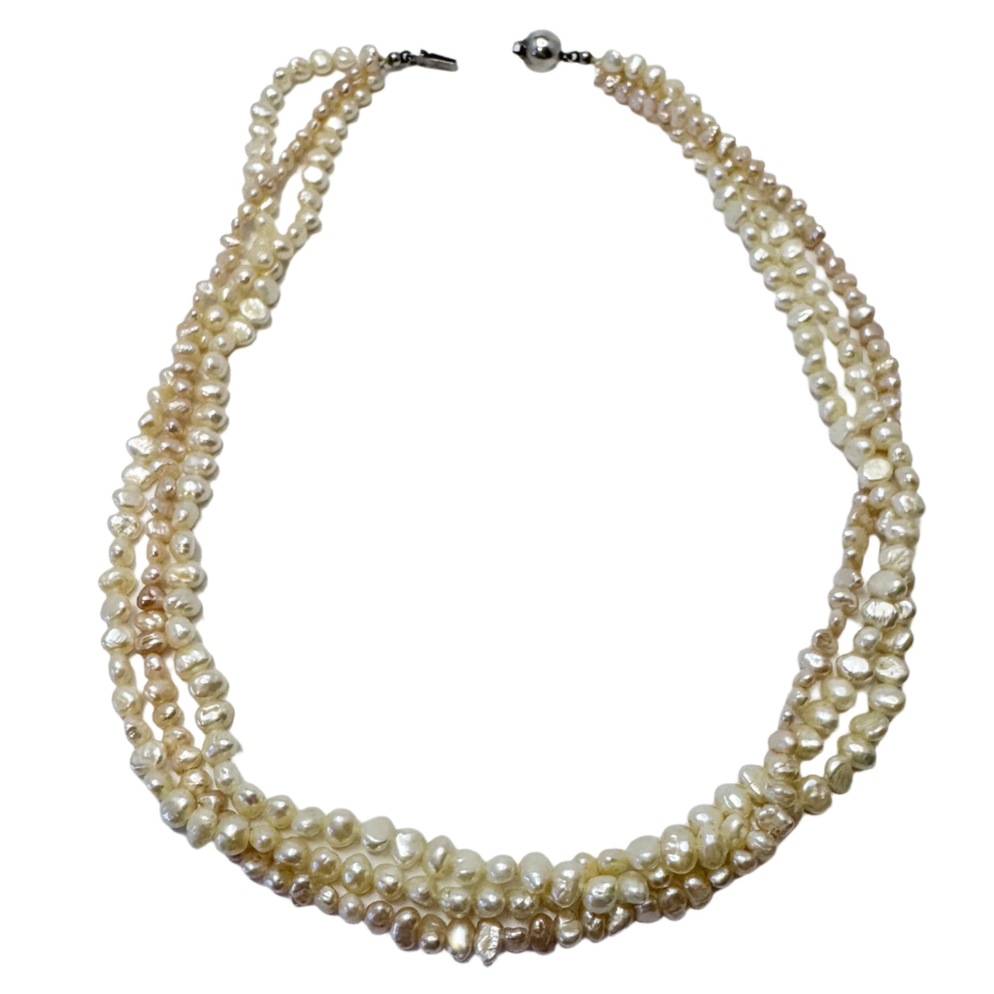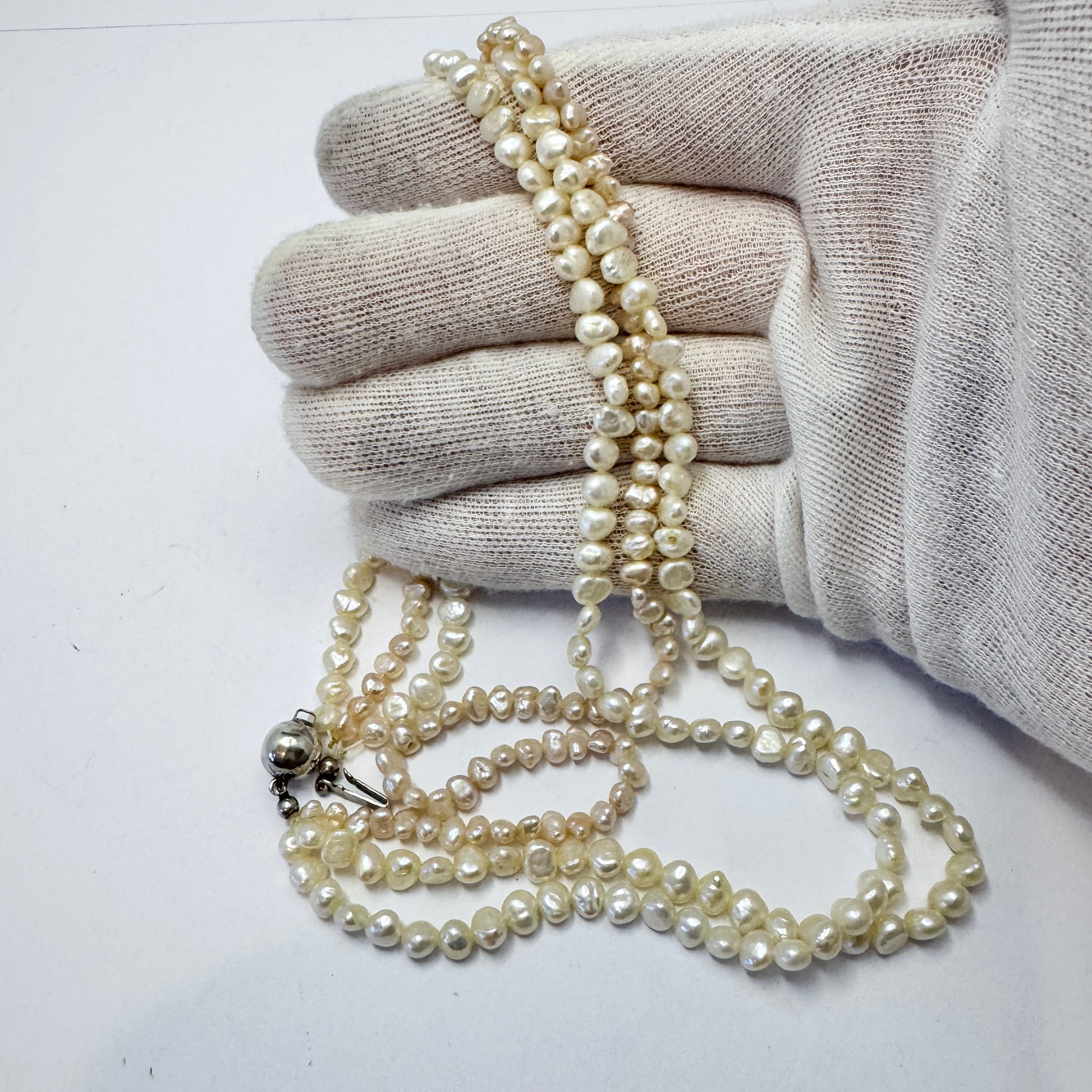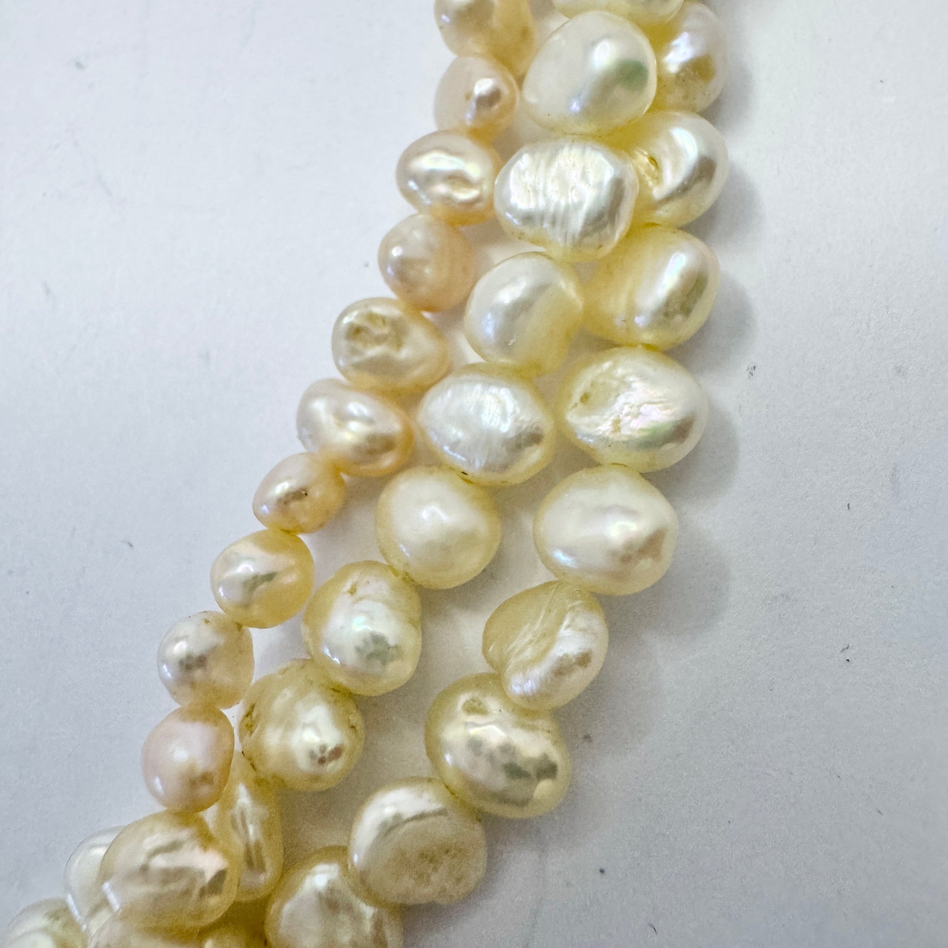 Vintage 3 Strand Cultured Biwa Pearl Necklace Sterling Silver Clasp.