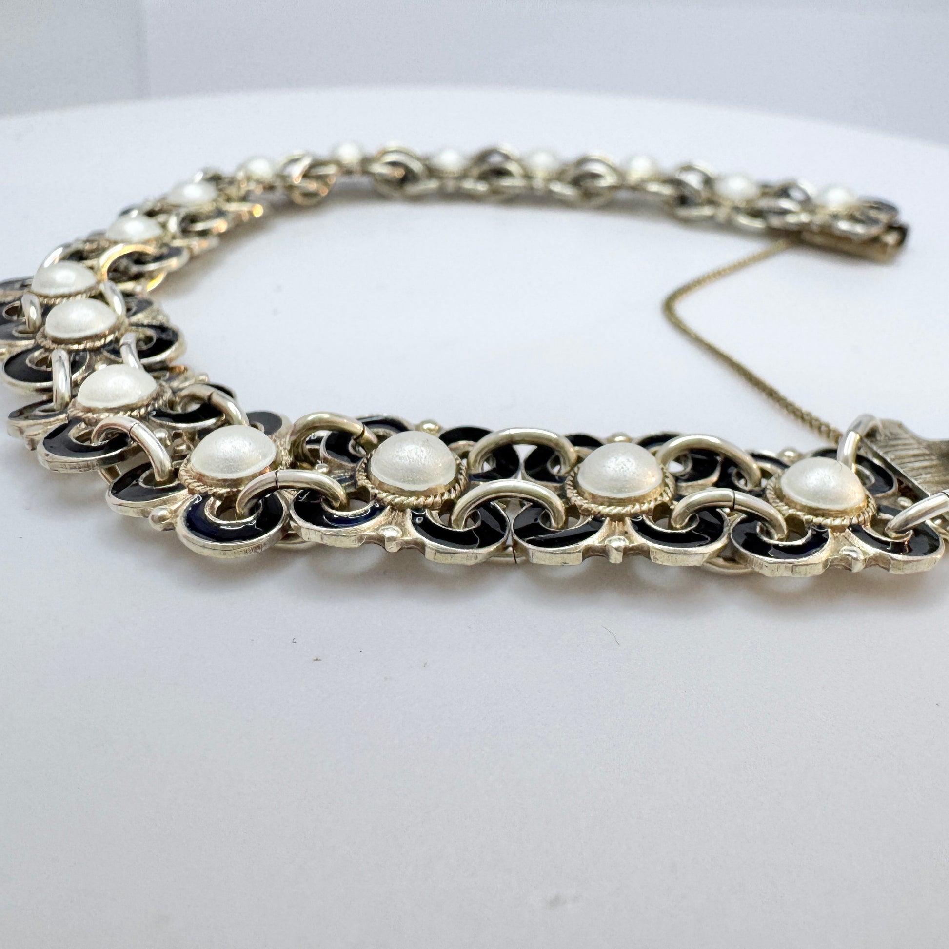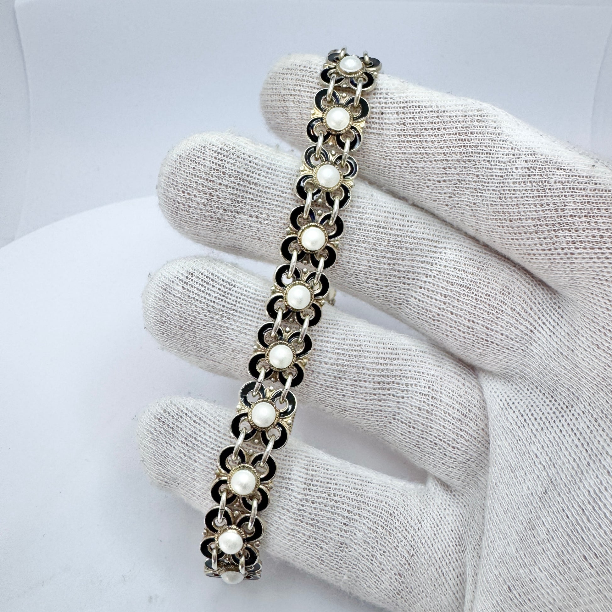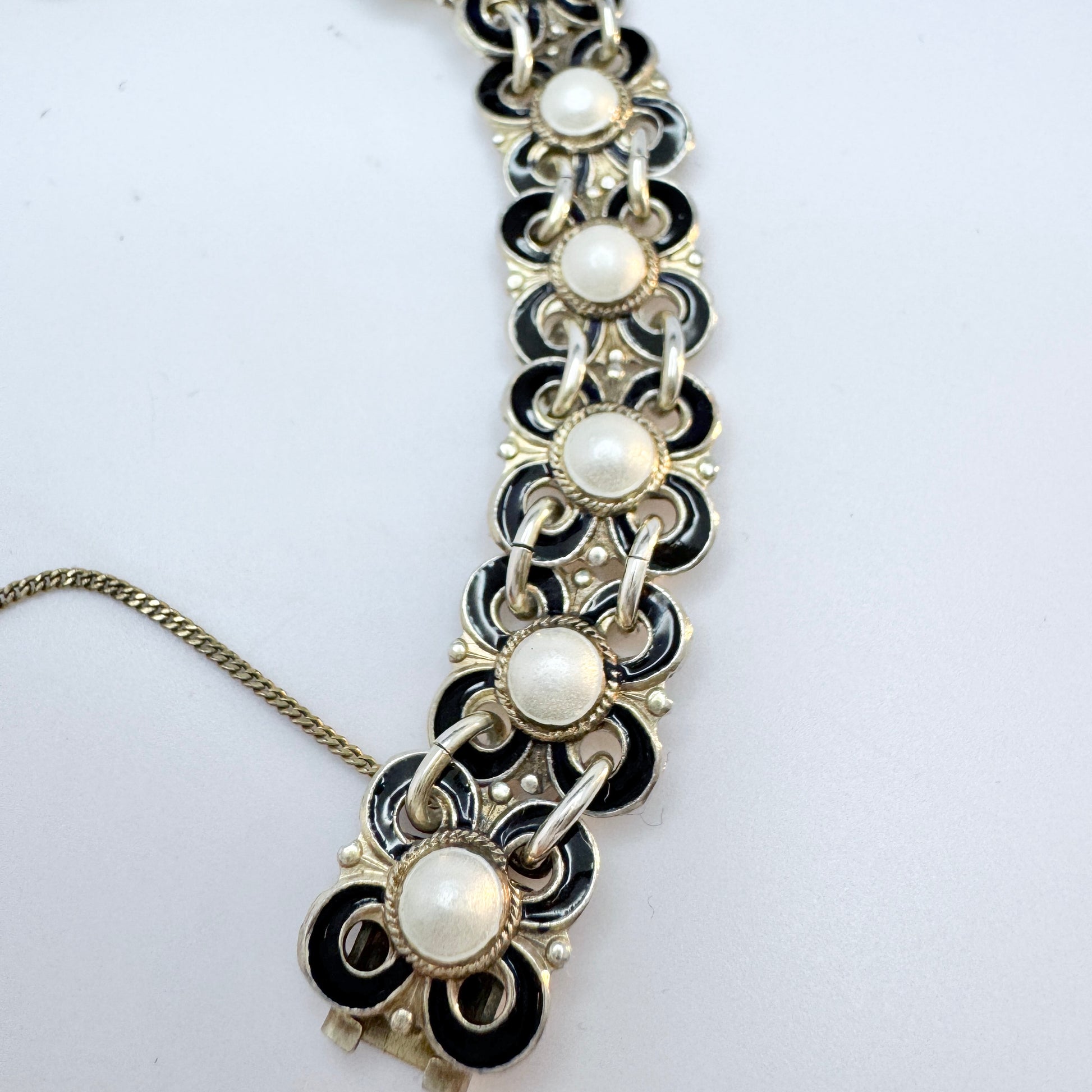 Wonderful and sought after vintage sterling silver black and white enamel bracelet. Hallmarked for Willy Winnaess for David-Andersen, Norway 1950s.