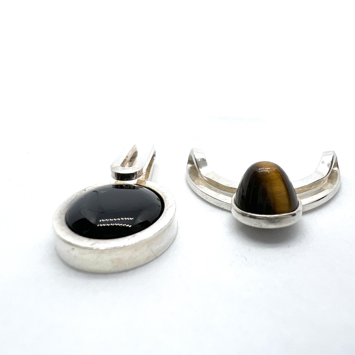 Charming and sought after vintage silver tiger's eye and onyx small pendant. Both hallmarked for Elis Kauppi, Kupittaan Kulta c 1960s.