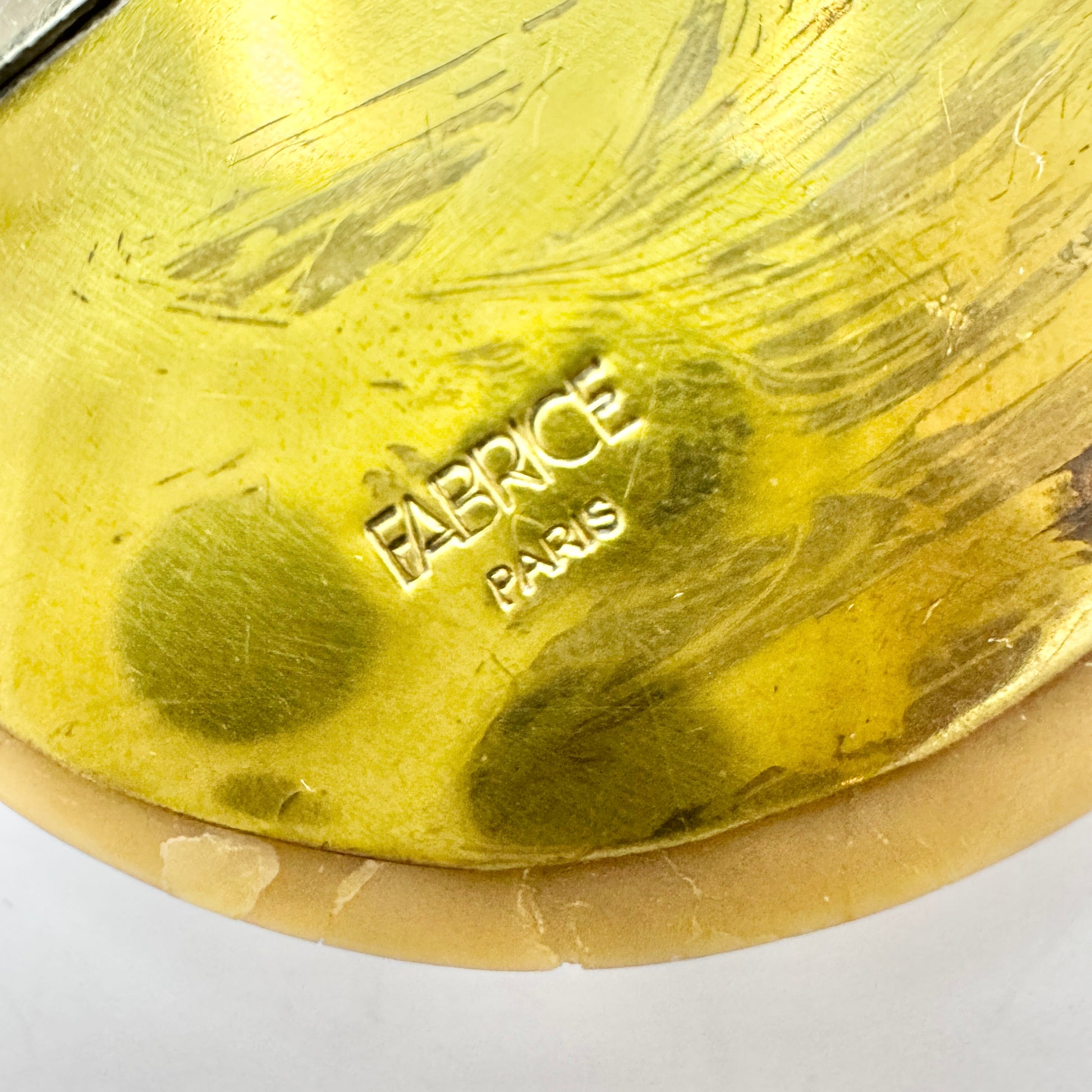 Beautiful and large vintage gilt metal and mother of pearl brooch. Marked for Fabrice, Paris, vintage.