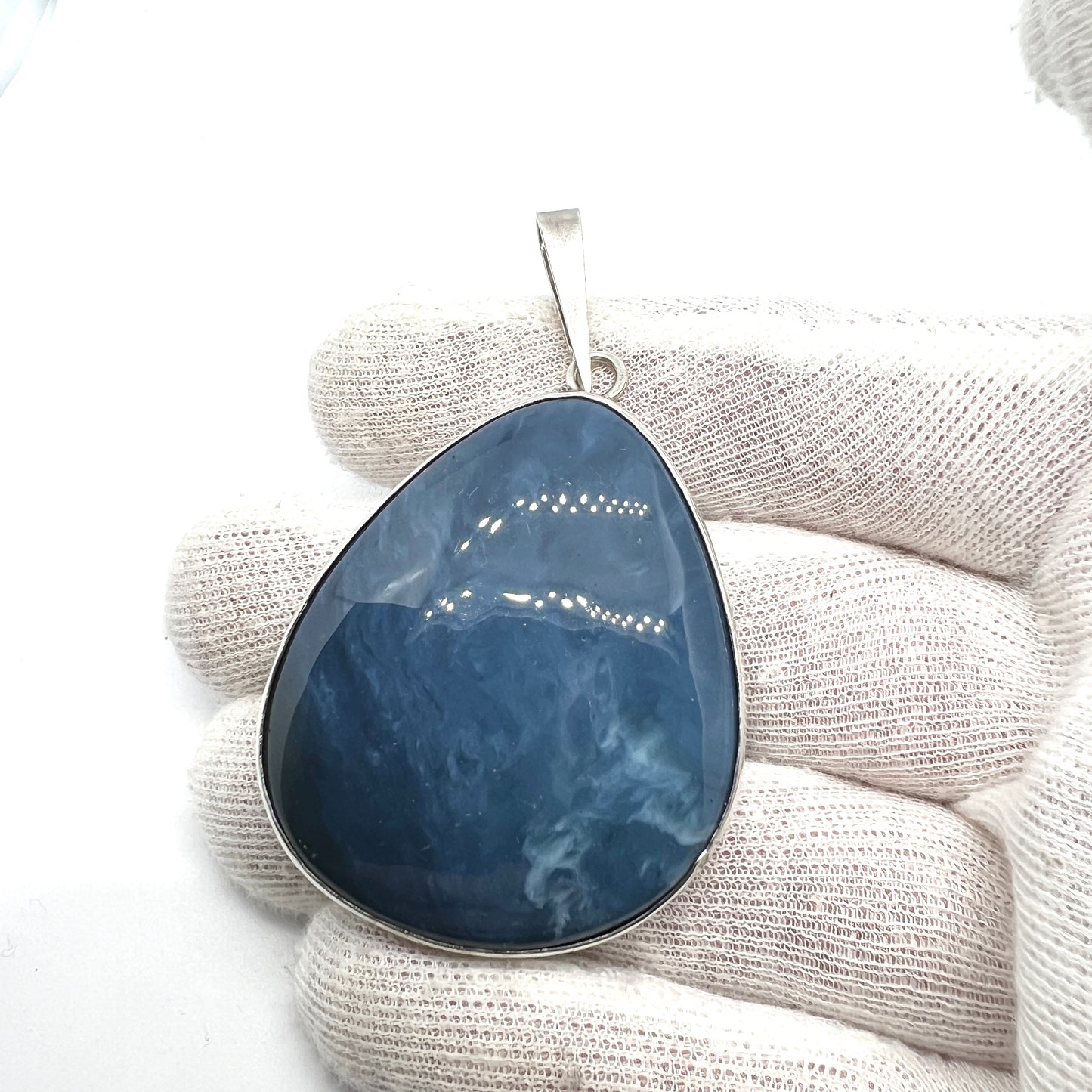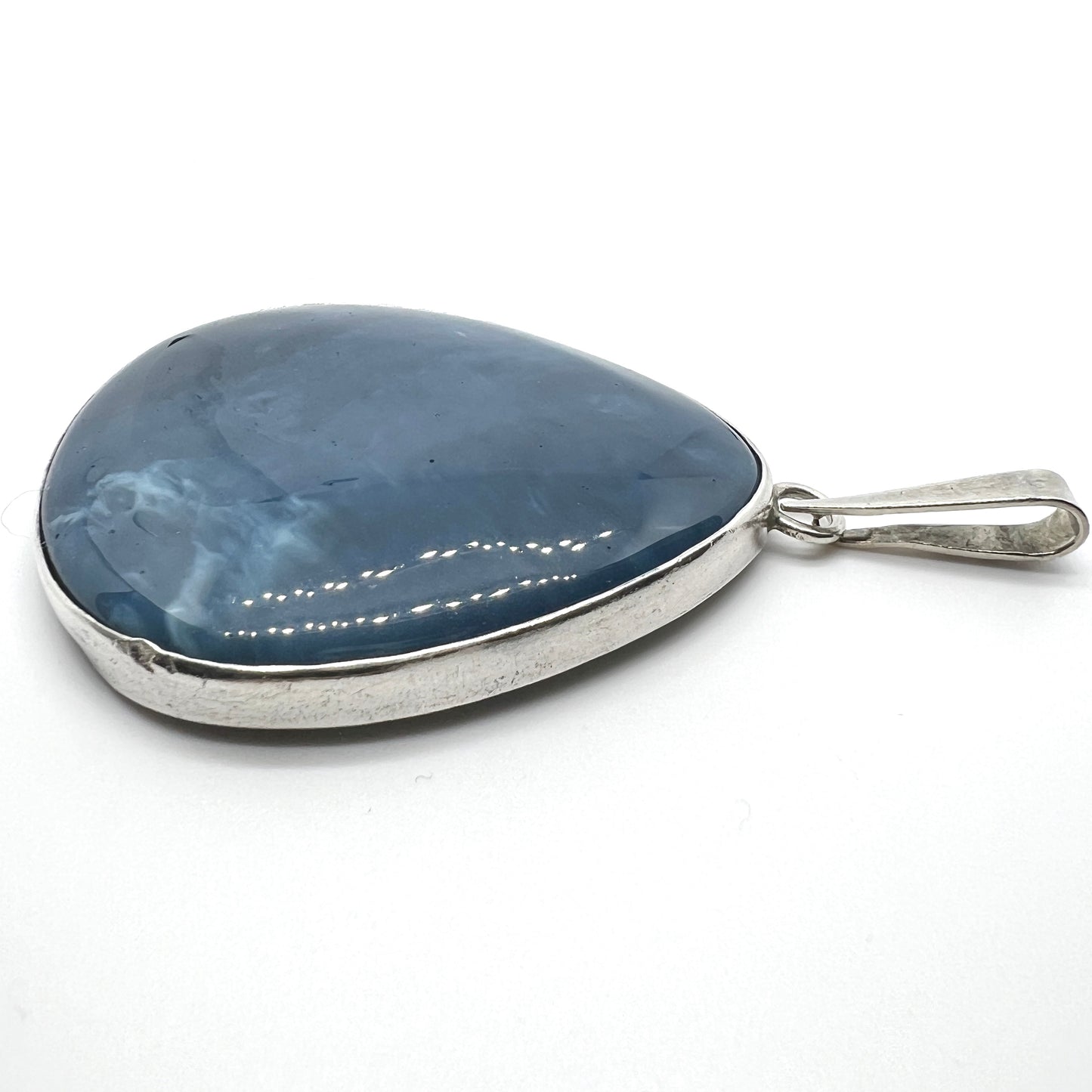 "The blue stone from "Bergslagen" in Sweden is unique. It emerges from a materia you only find in medieval foundry ruins. The colour shades are determined by remainders of the old rock. Each stone is cut and polished by hand. That's why the form of each stone differs from the rest and the reason why this jewel of yours is quite unique."