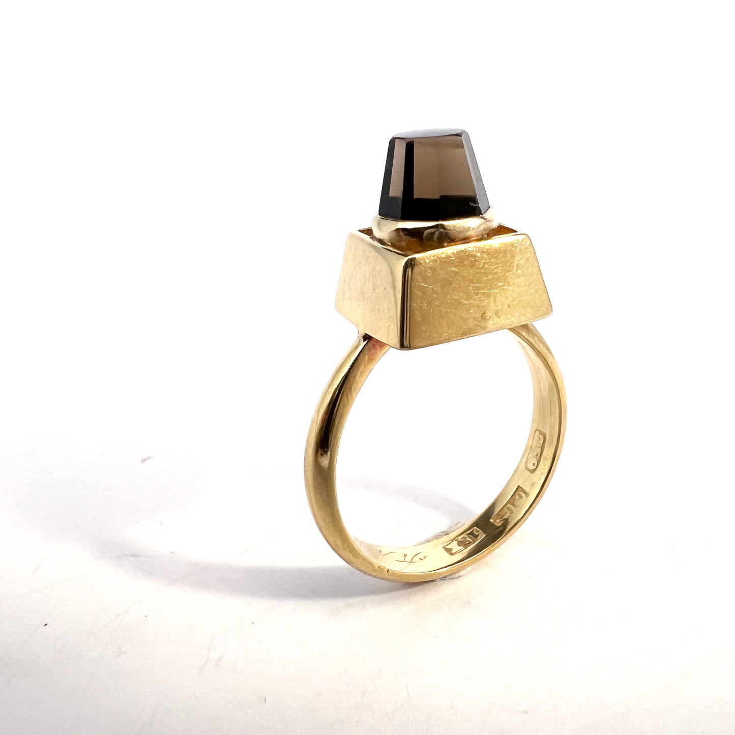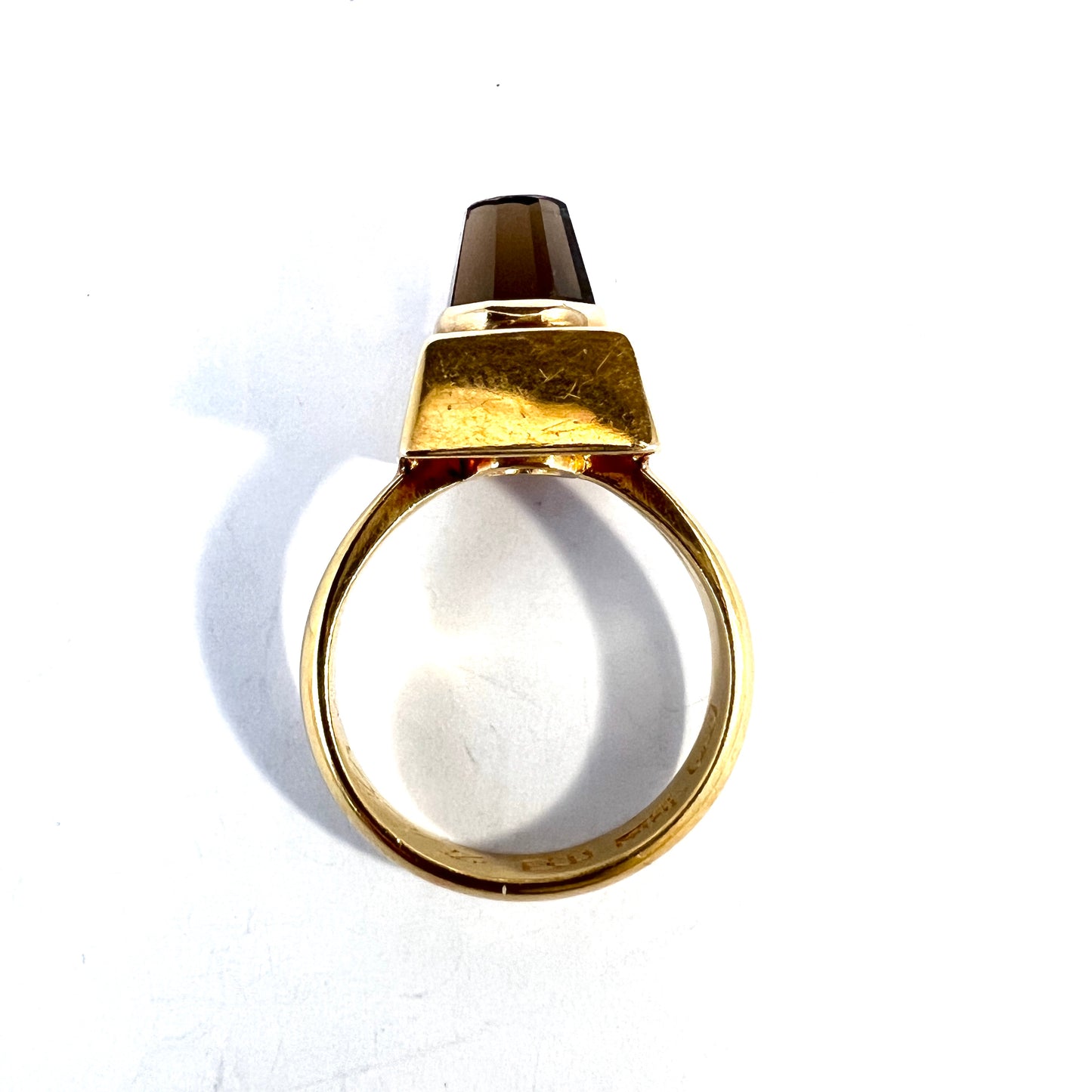 Wonderful vintage modernist 18k gold smoky quartz ring. Hallmarked for 18k gold ("750" and "18K") Unidentified and indistinct makers mark, possibly "CLS"