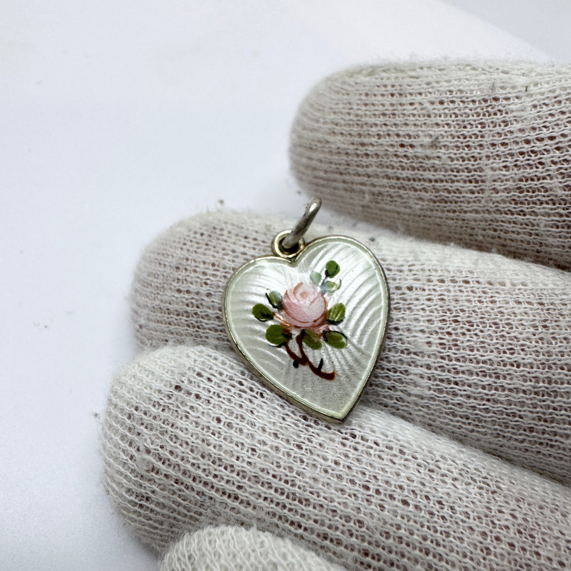 Ivar T Holt, Norway c 1950-60s. Vintage Sterling Silver Enamel Heart Rose Flower Pendant.