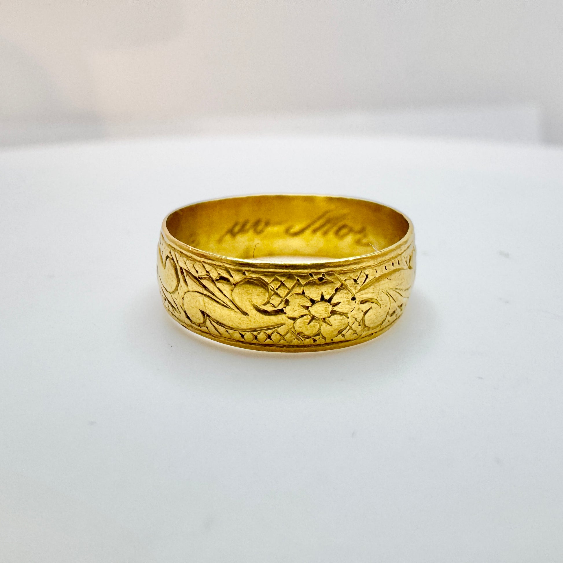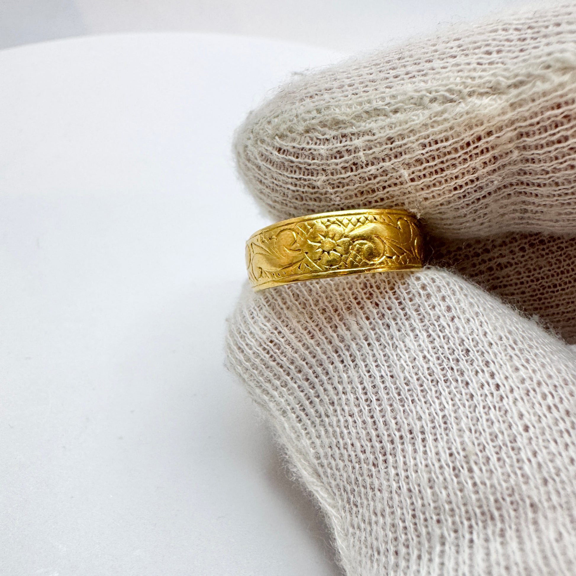 Wonderful and sought after antique 23k gold ring. Hallmarked for 23k gold, Sweden year 1902. Inside later engraving "Memory of Mother 1963" (in Swedish)