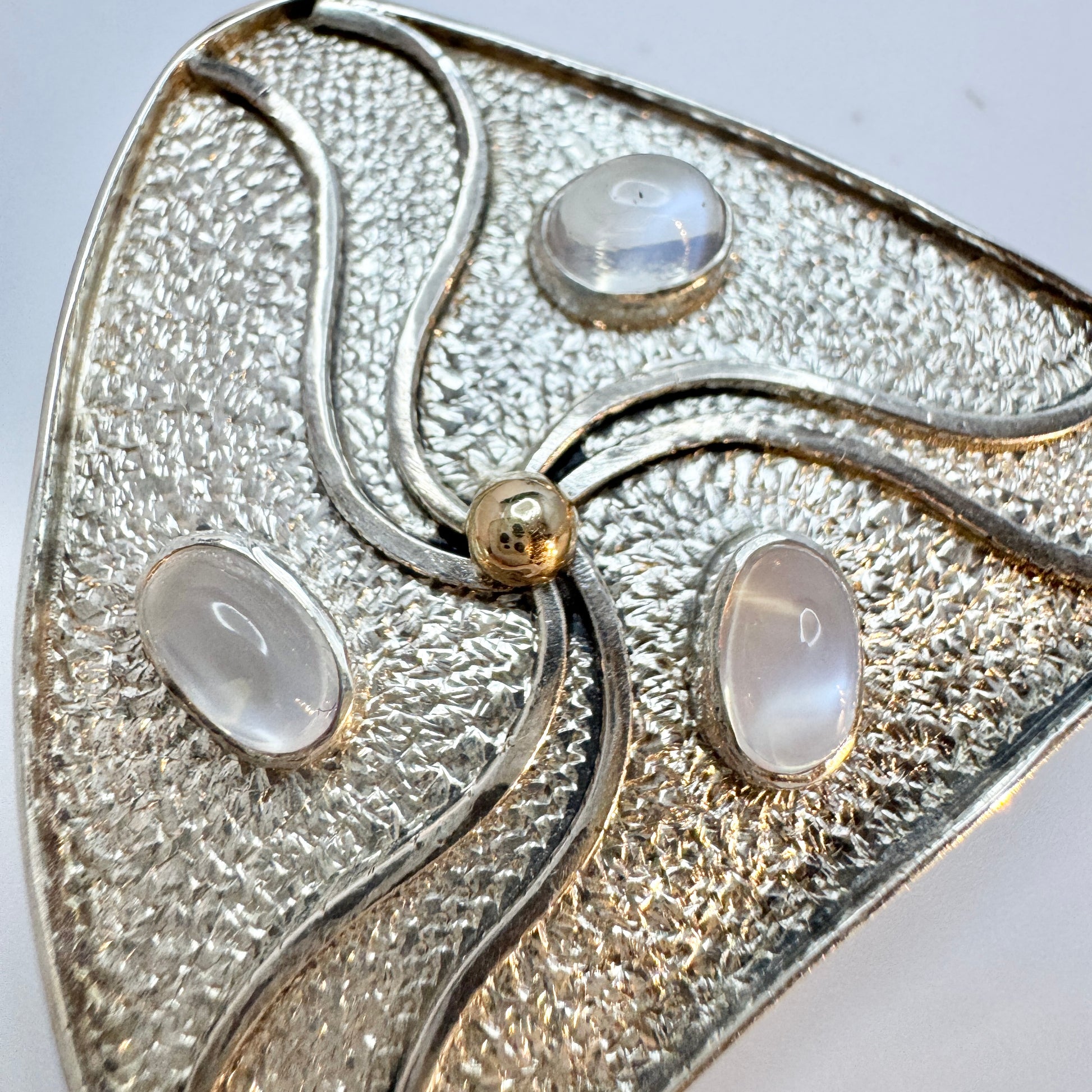 Wonderful and rare vintage sterling silver moonstone brooch. Hallmarked for maker BGH, Sweden year 1956. Gold or gilded detail in the center.