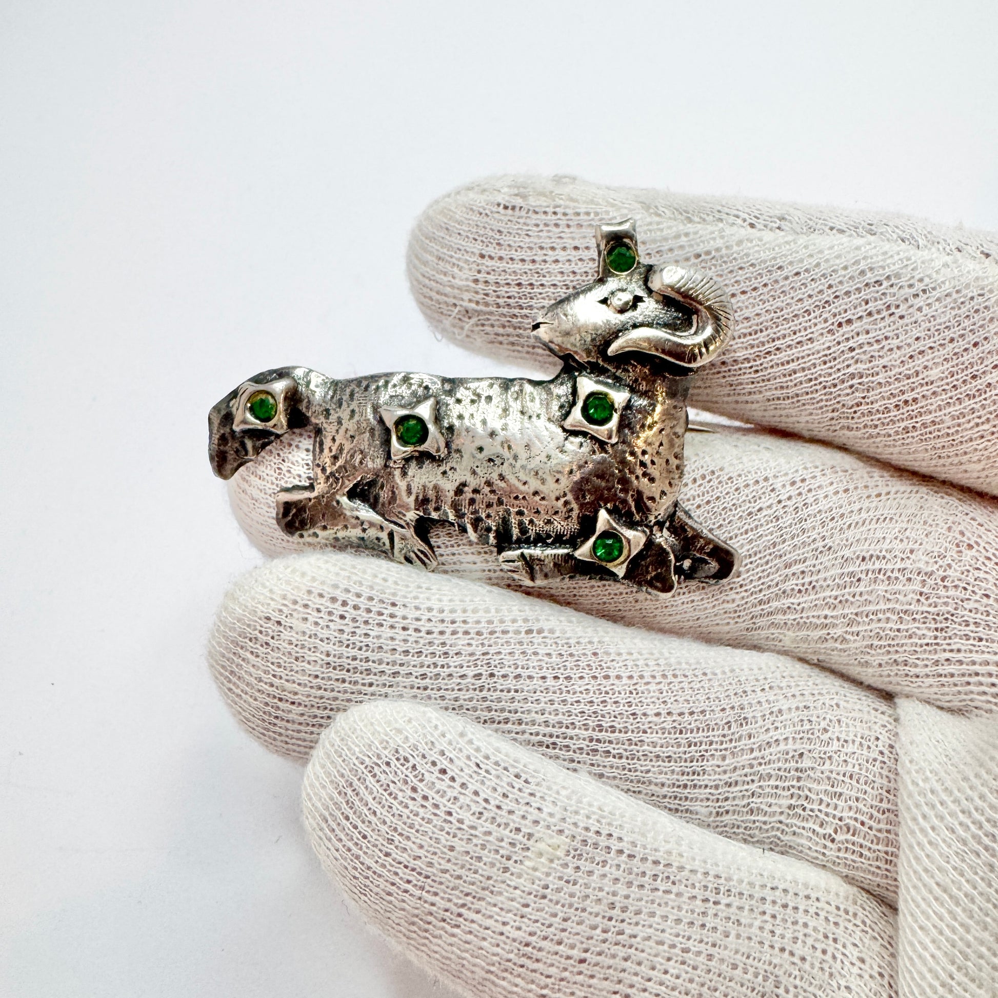 Vintage Aries Zodiac Sterling Silver Green Crystal Brooch. Prob. the USA