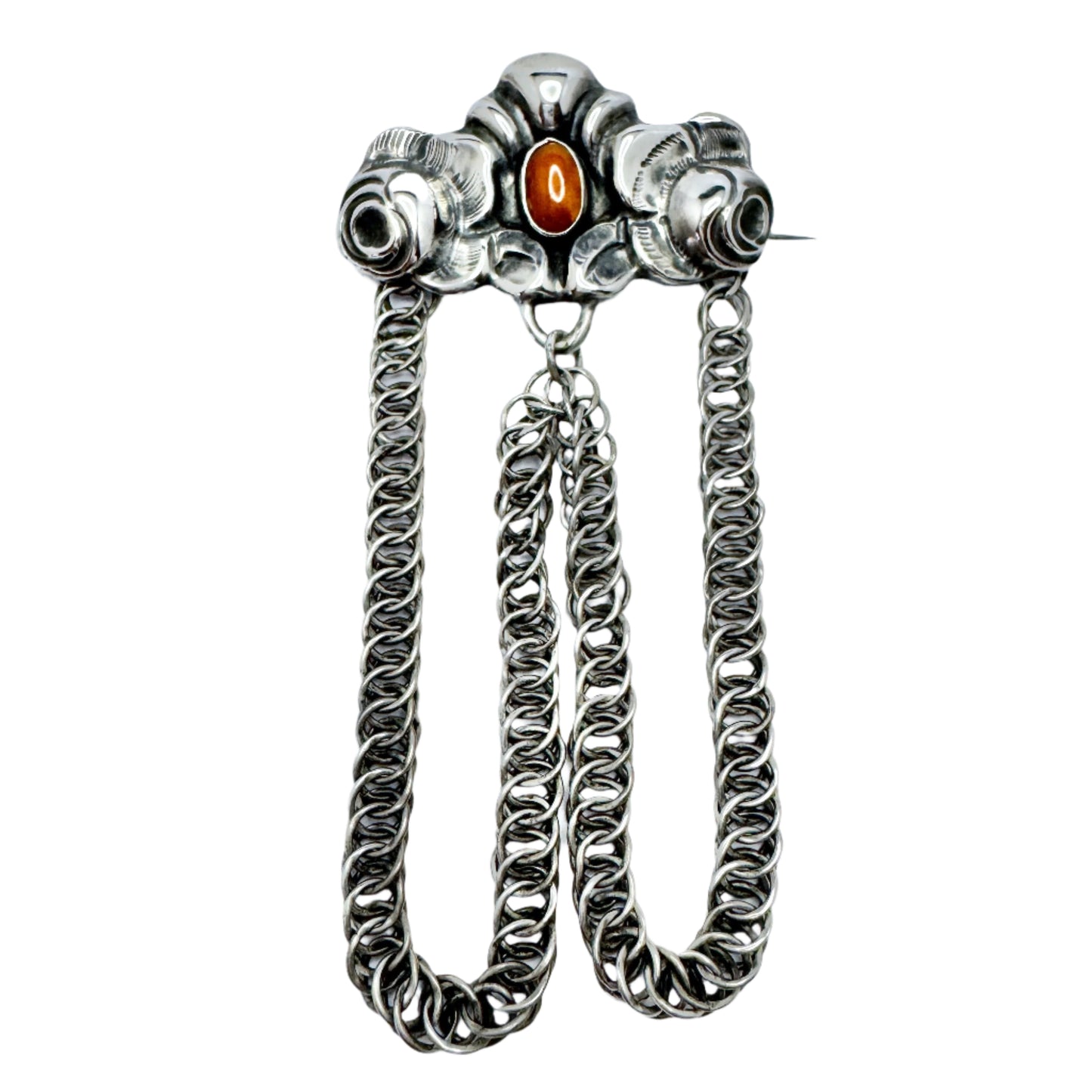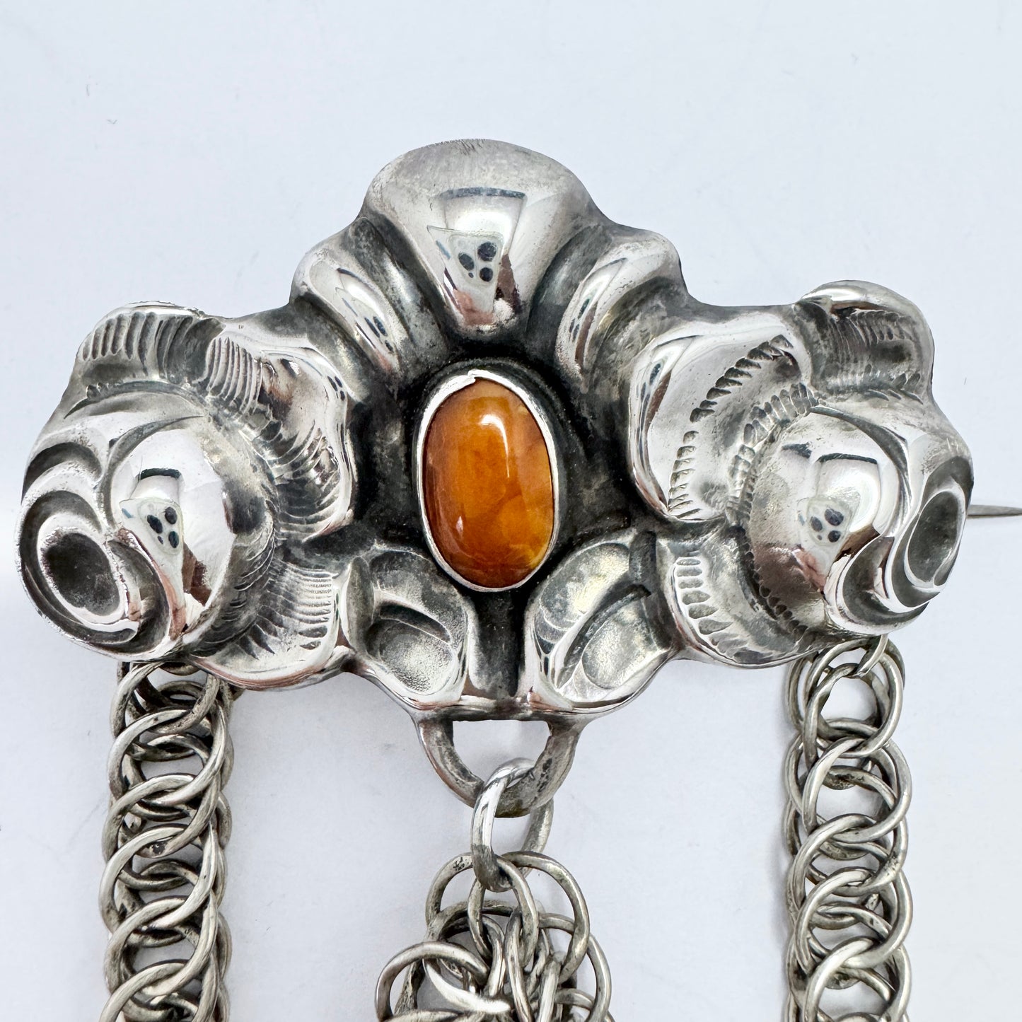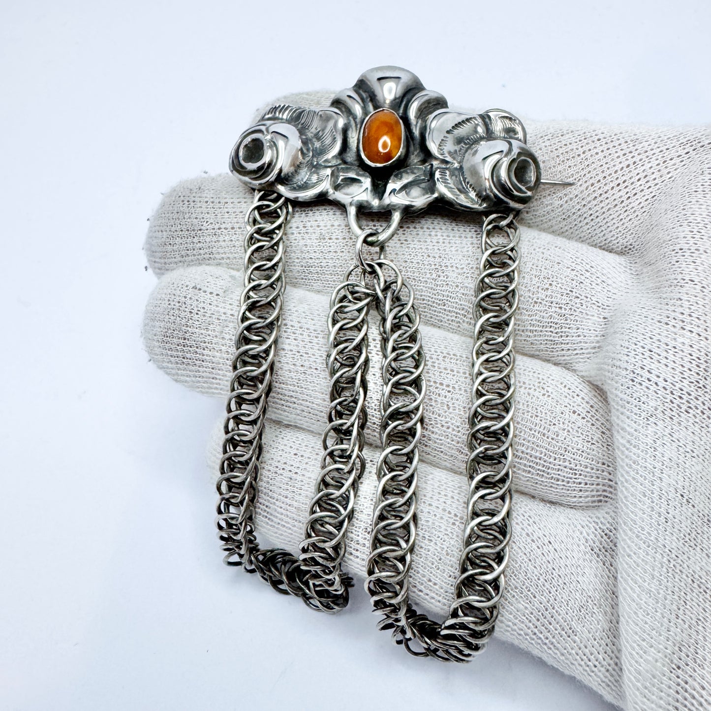 CV Carl Larsen, Denmark 1910s, Antique Solid Silver Amber Arts and Crafts Skonvirke Brooch