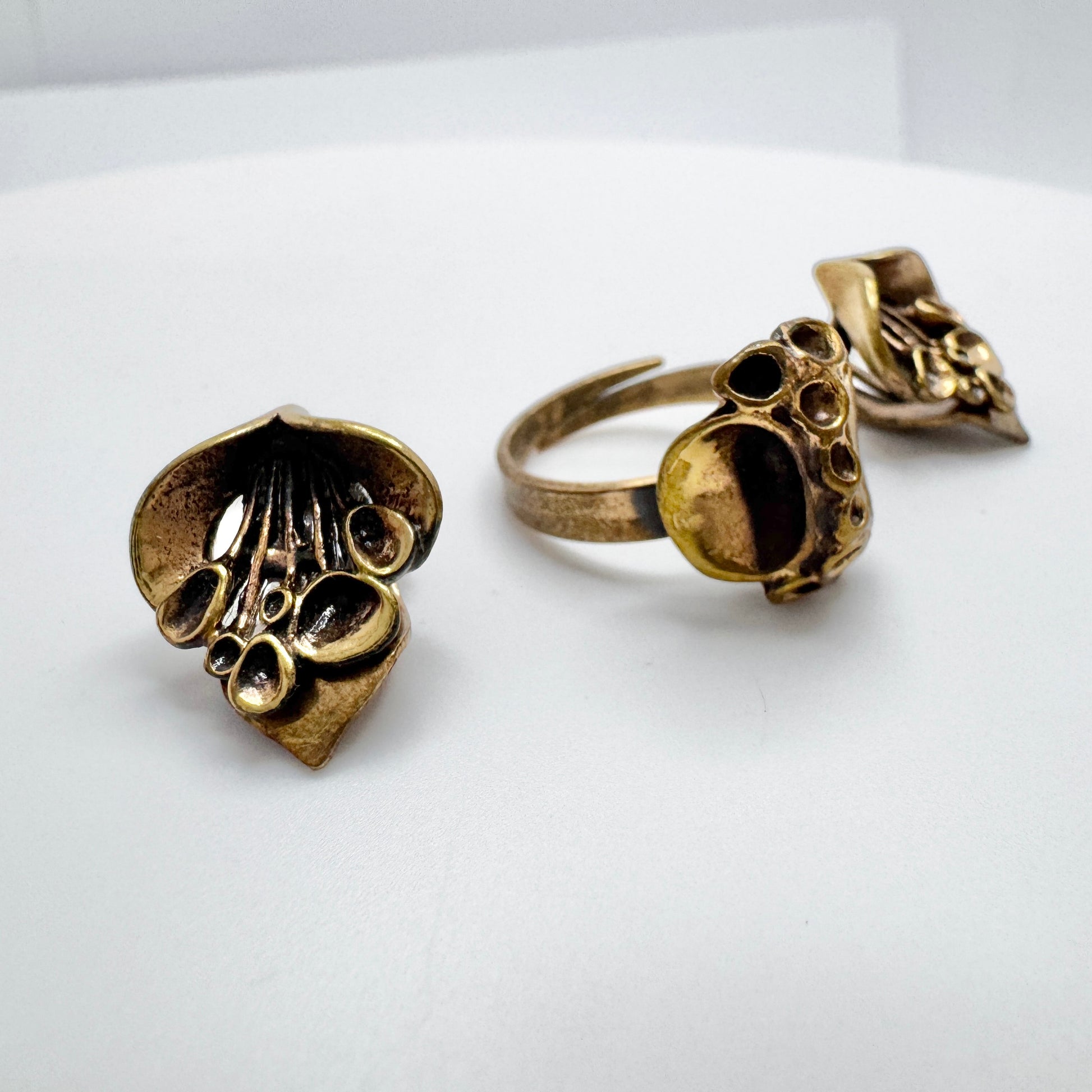 Very charming vintage bronze ring + clip-on earrings. Ring marked "Made in Finland" 1970s.