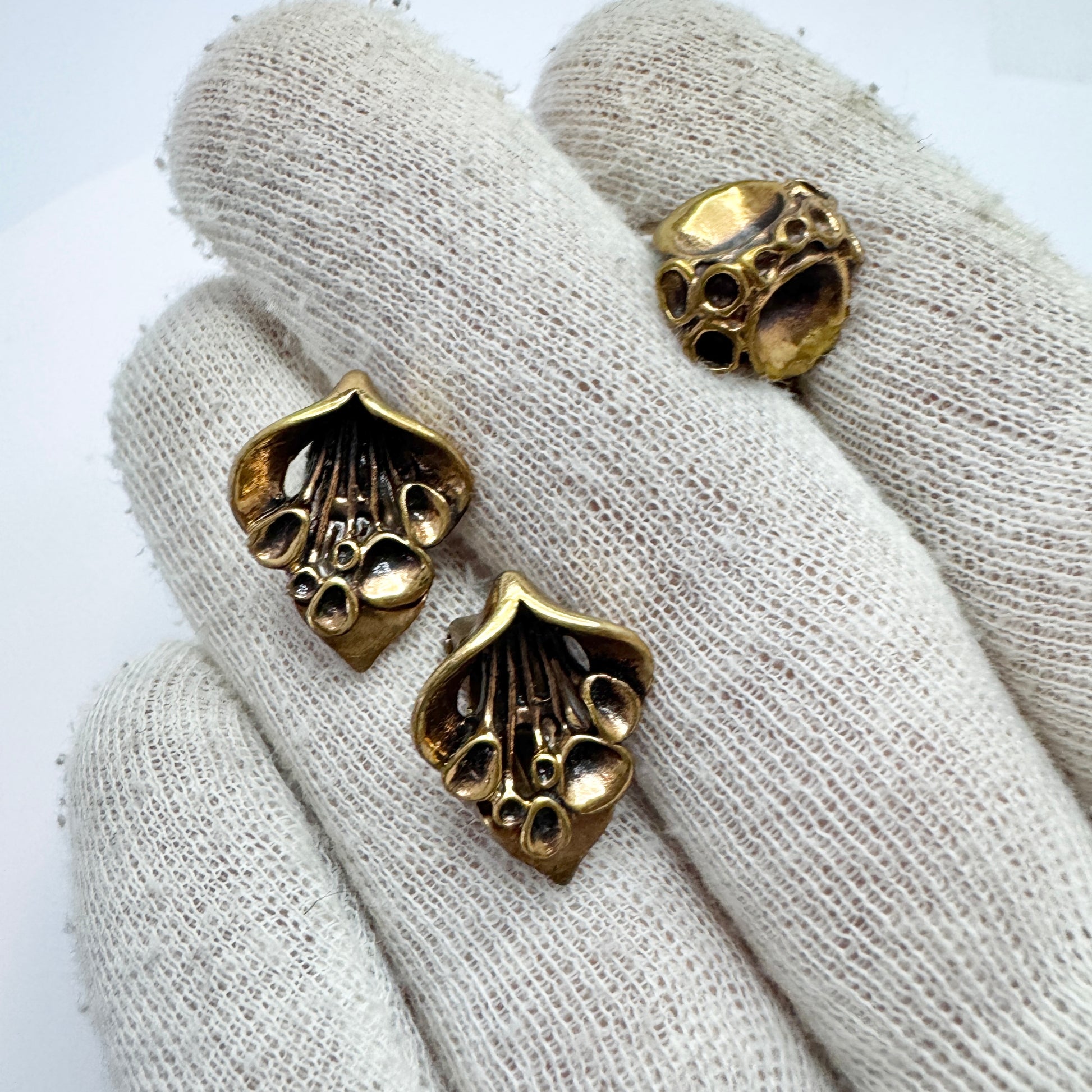 Finland 1970s. Vintage Reindeer Moss Design Bronze Ring + Earrings.