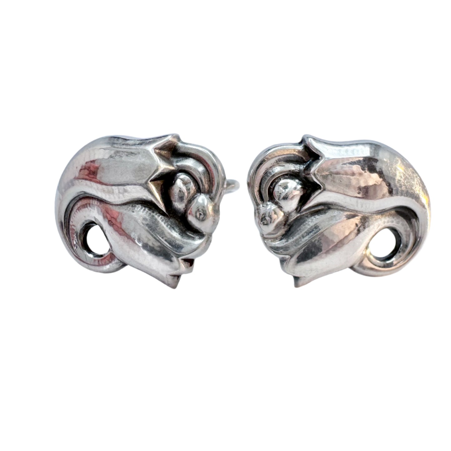 Wonderful vintage sterling silver designer earrings. Fully hallmarked for renowned Georg Jensen, Denmark 1950s. Tulip Design #100 by Georg Jensen.