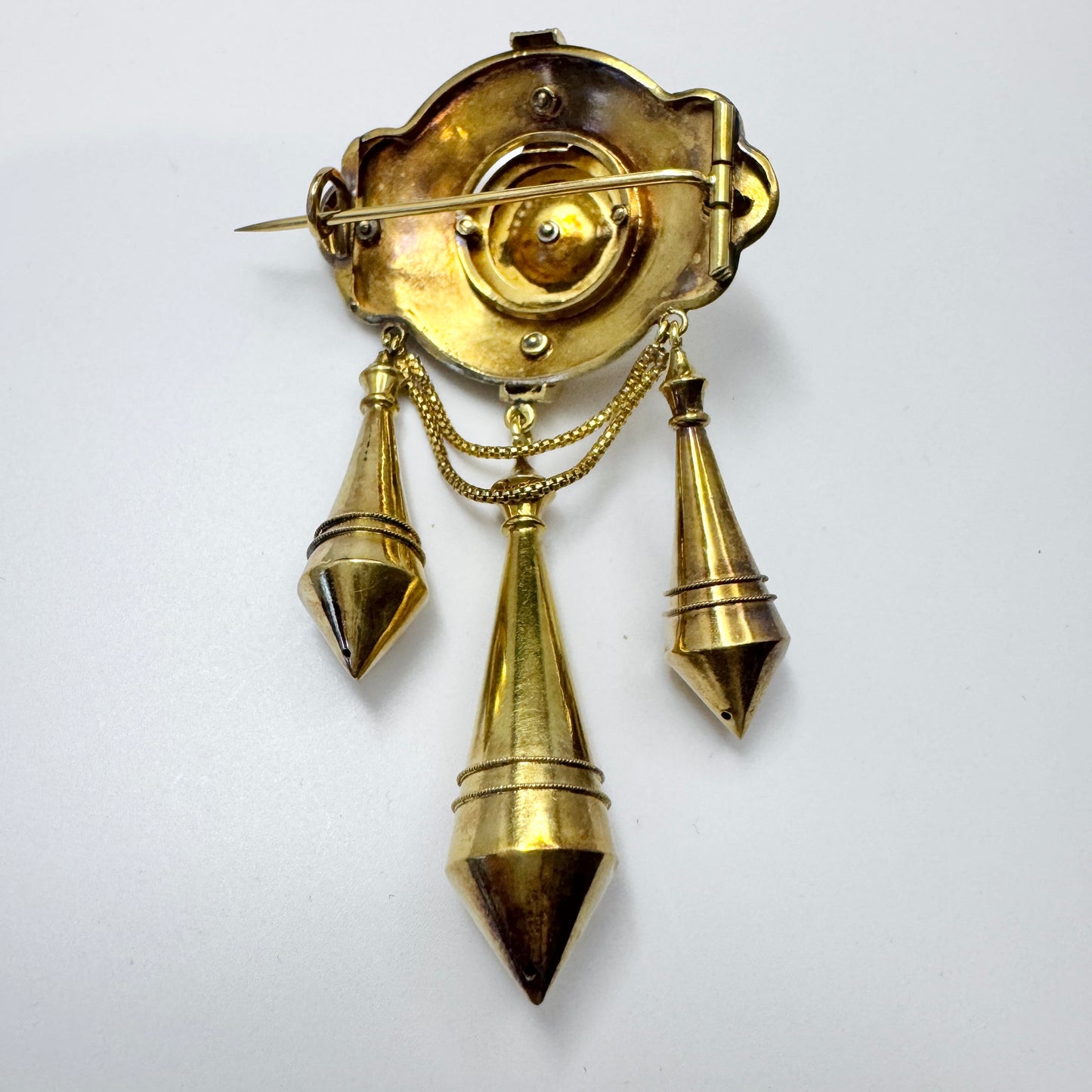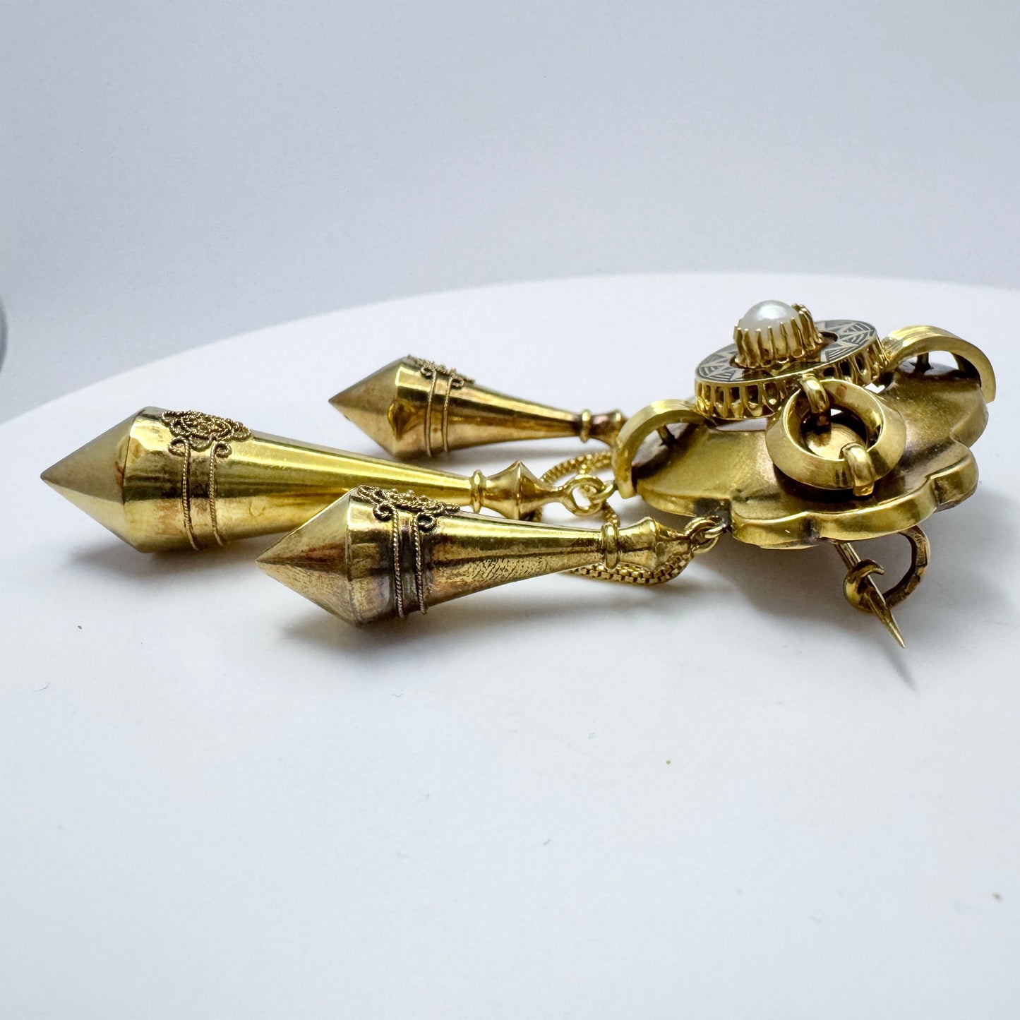 L Larsson, Sweden. Antique Victorian Etruscan Revival 18k Gold Enamel Pearl Large Brooch.