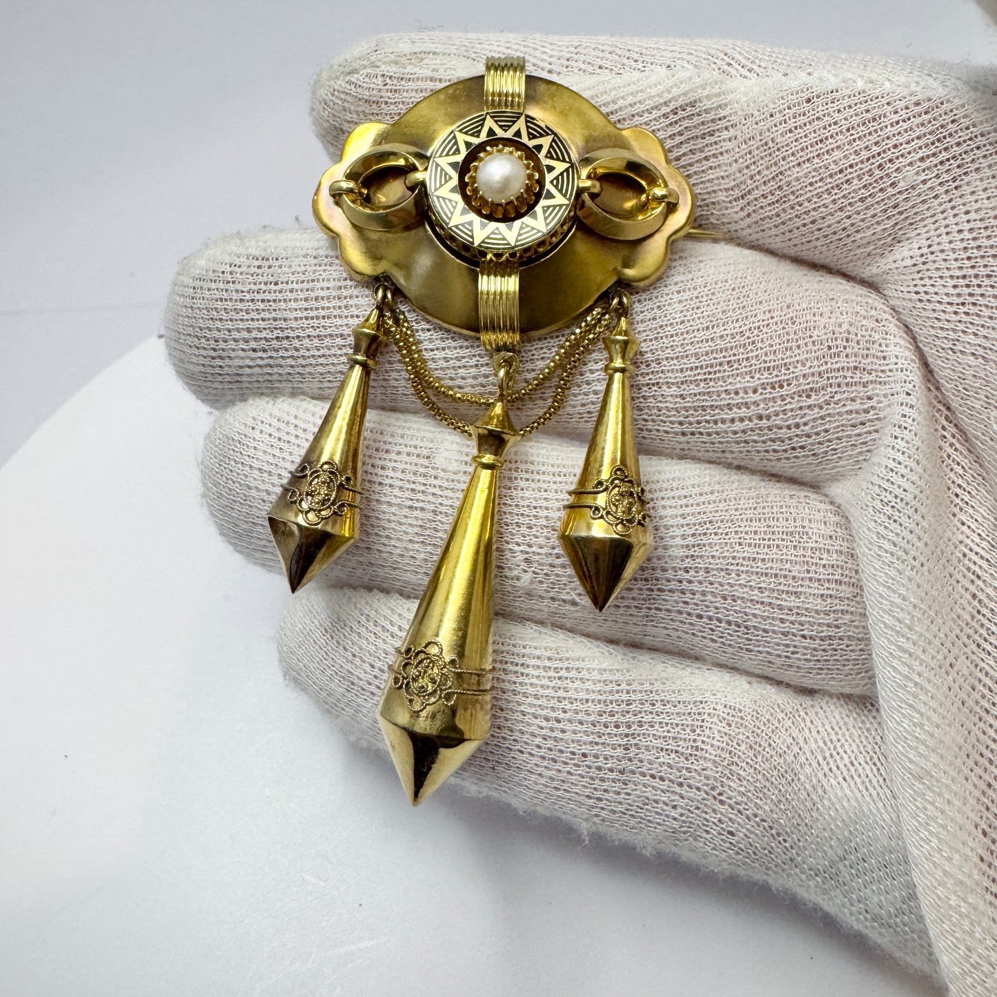 Wonderful antique Etruscan revival 18k gold enamel pearl brooch. Hallmarked for 18k gold, L Larsson, Sweden late 1800s.