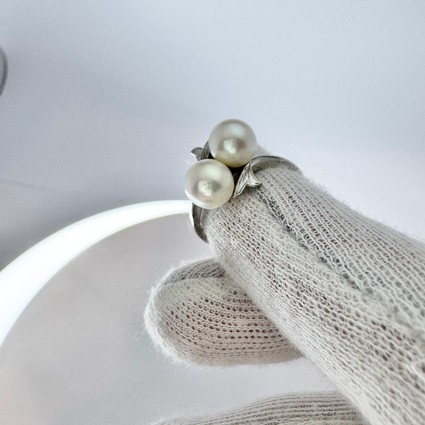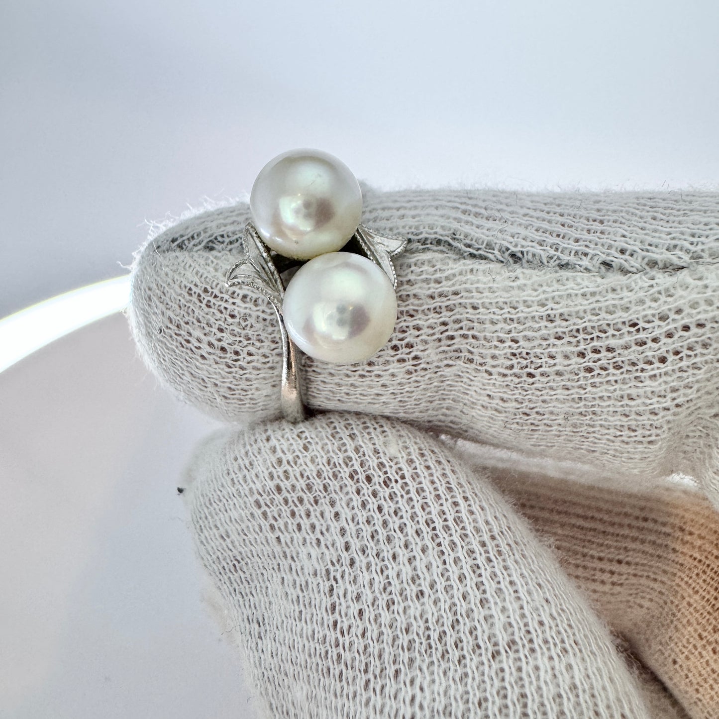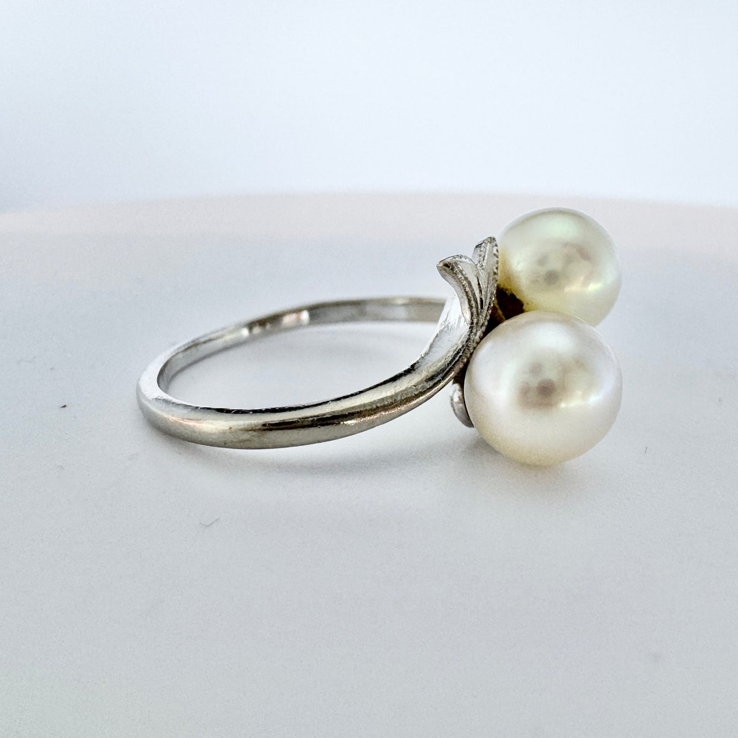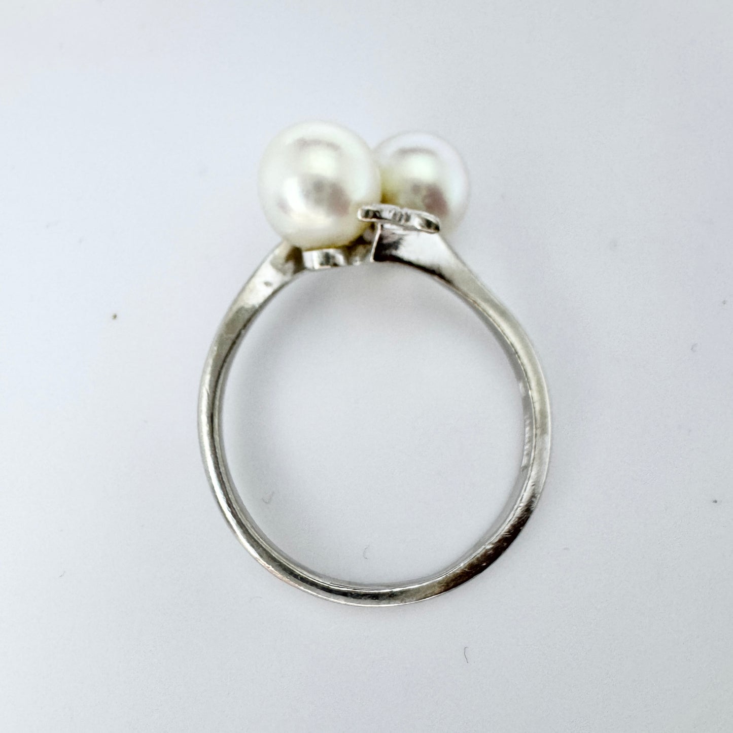 Very charming vintage 14k white gold cultured pearl ring. Hallmarked for 14k gold, Mikimoto, Japan.