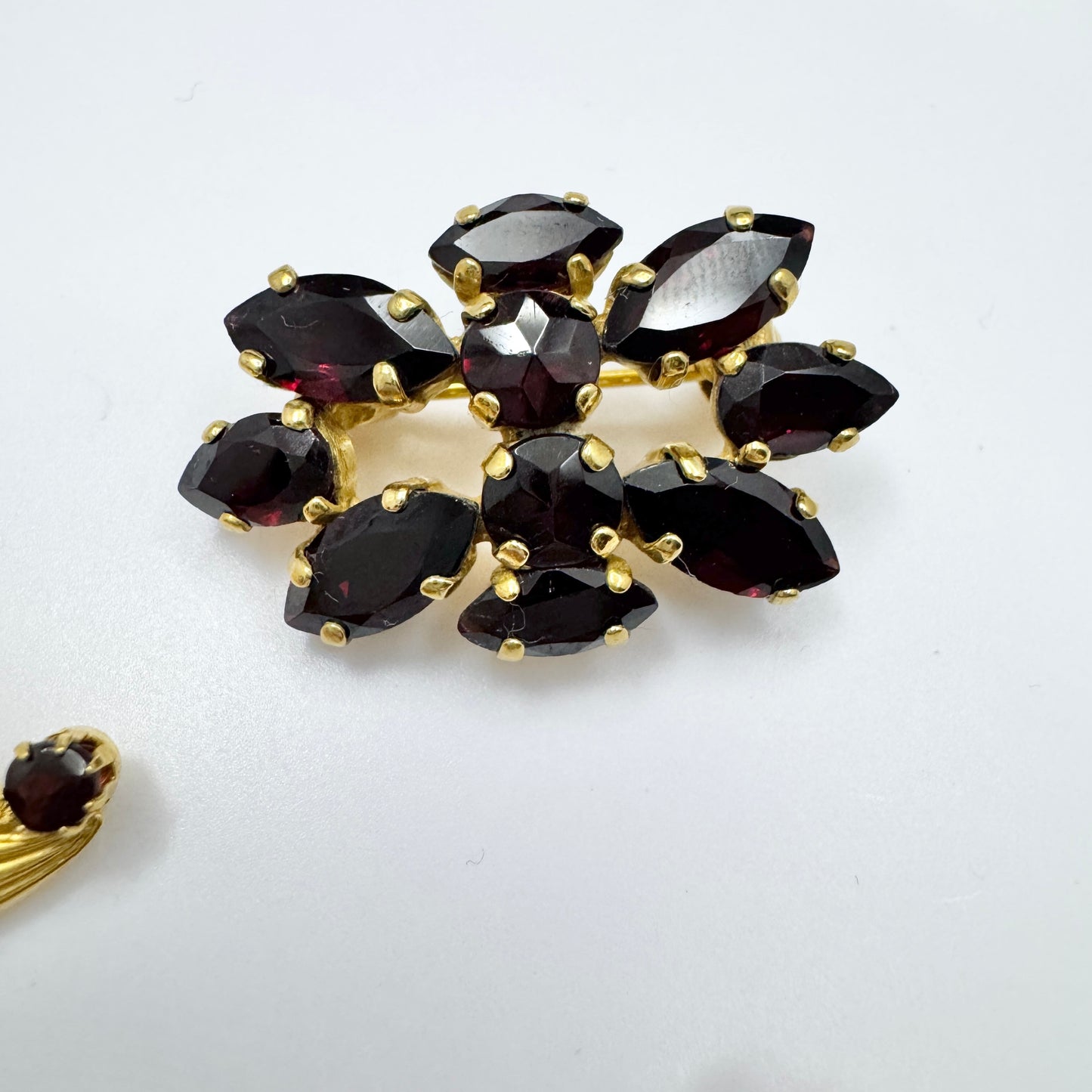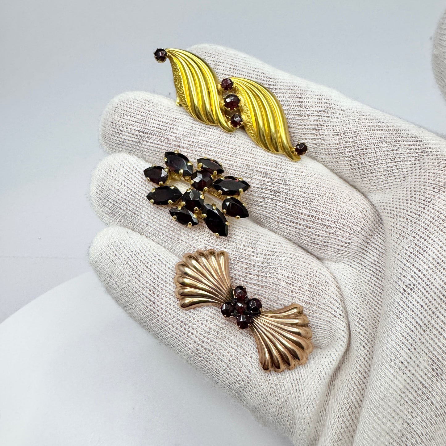Three beautiful vintage bohemian garnet gilt metal brooches. Continental Europe ca 1950s.