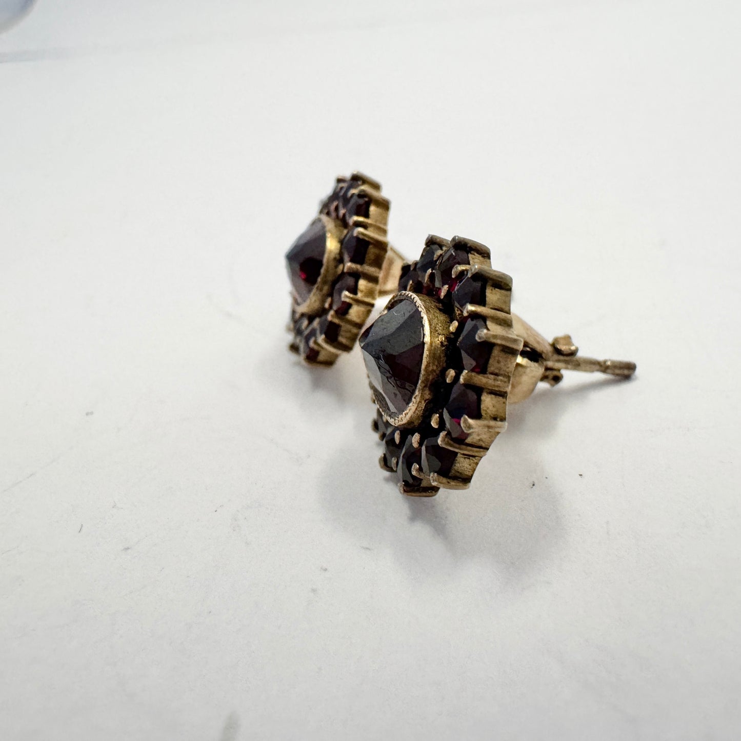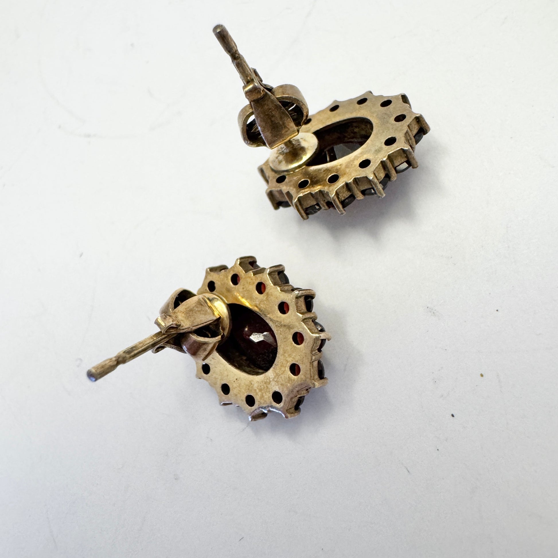 Wonderful vintage gilt silver bohemian garnet pair of earrings. Hallmarked for 830 silver and unidentified makers mark. Continental Europe c 1940s.