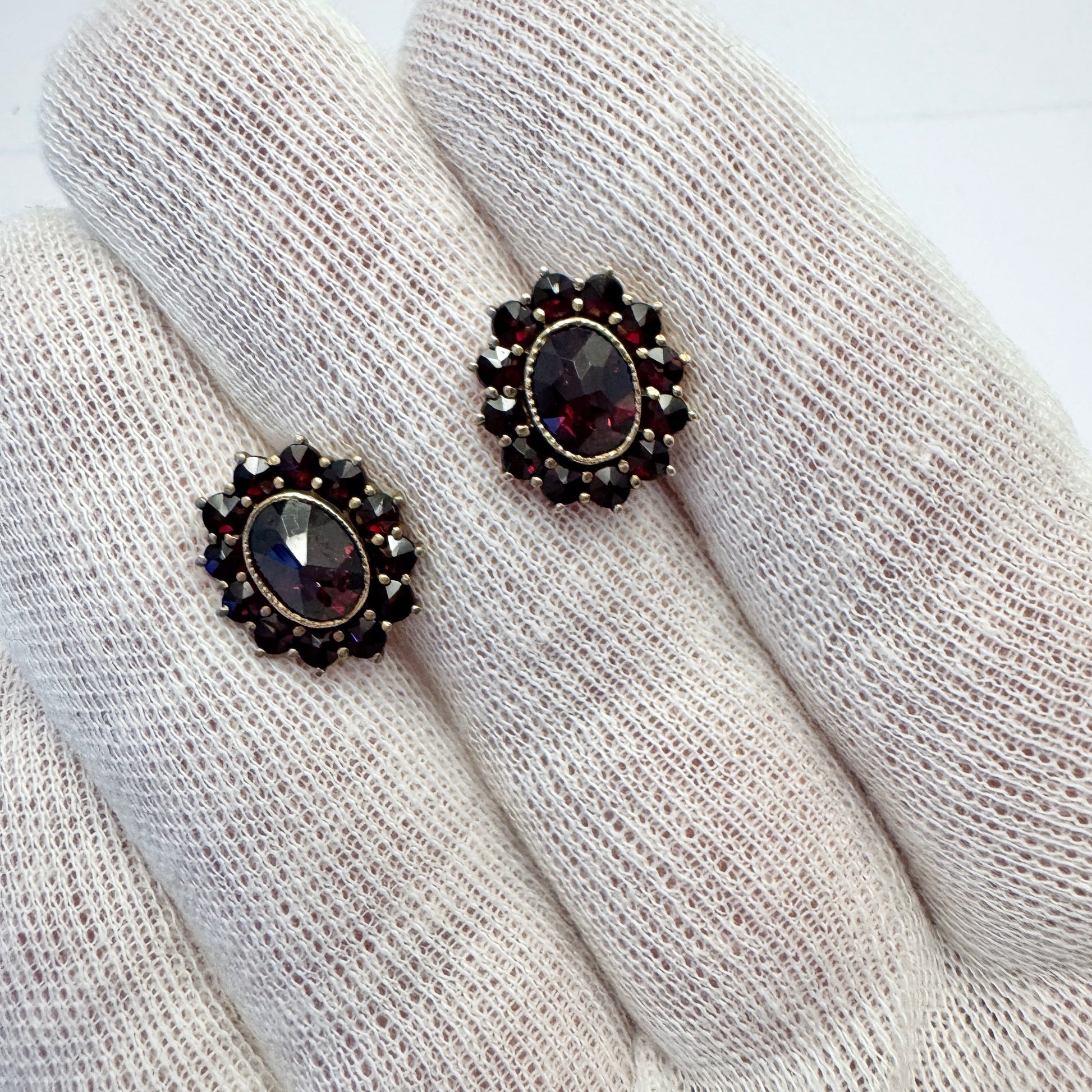 Vintage c 1940s. Gilt 830 Silver Bohemian Garnet Cluster Earrings.