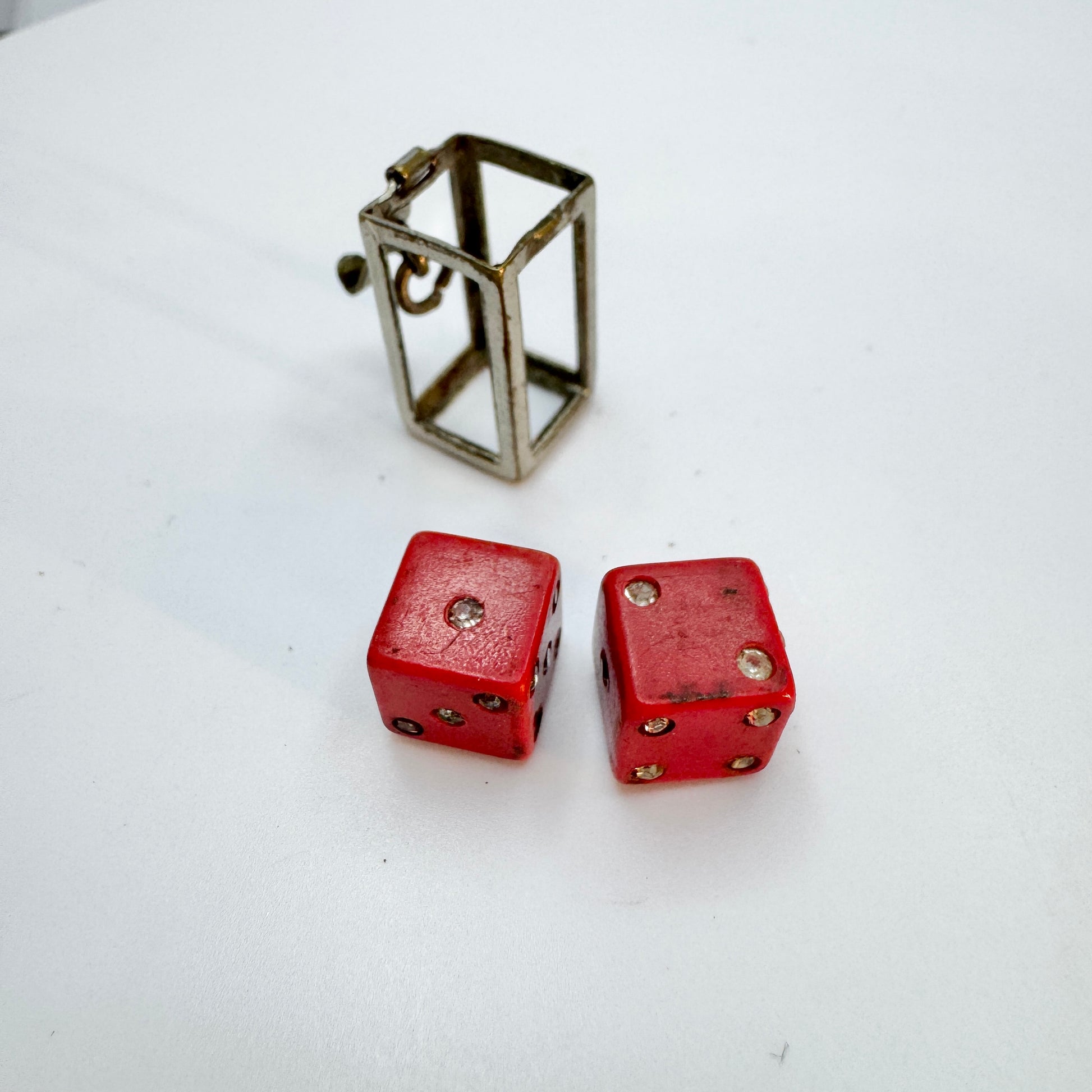Beautiful vintage silver-plated early plastic dice + box charm. Ca 1950s.