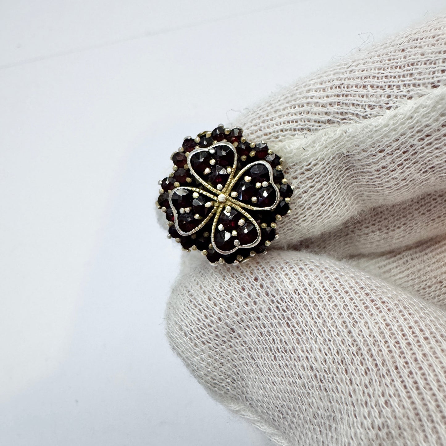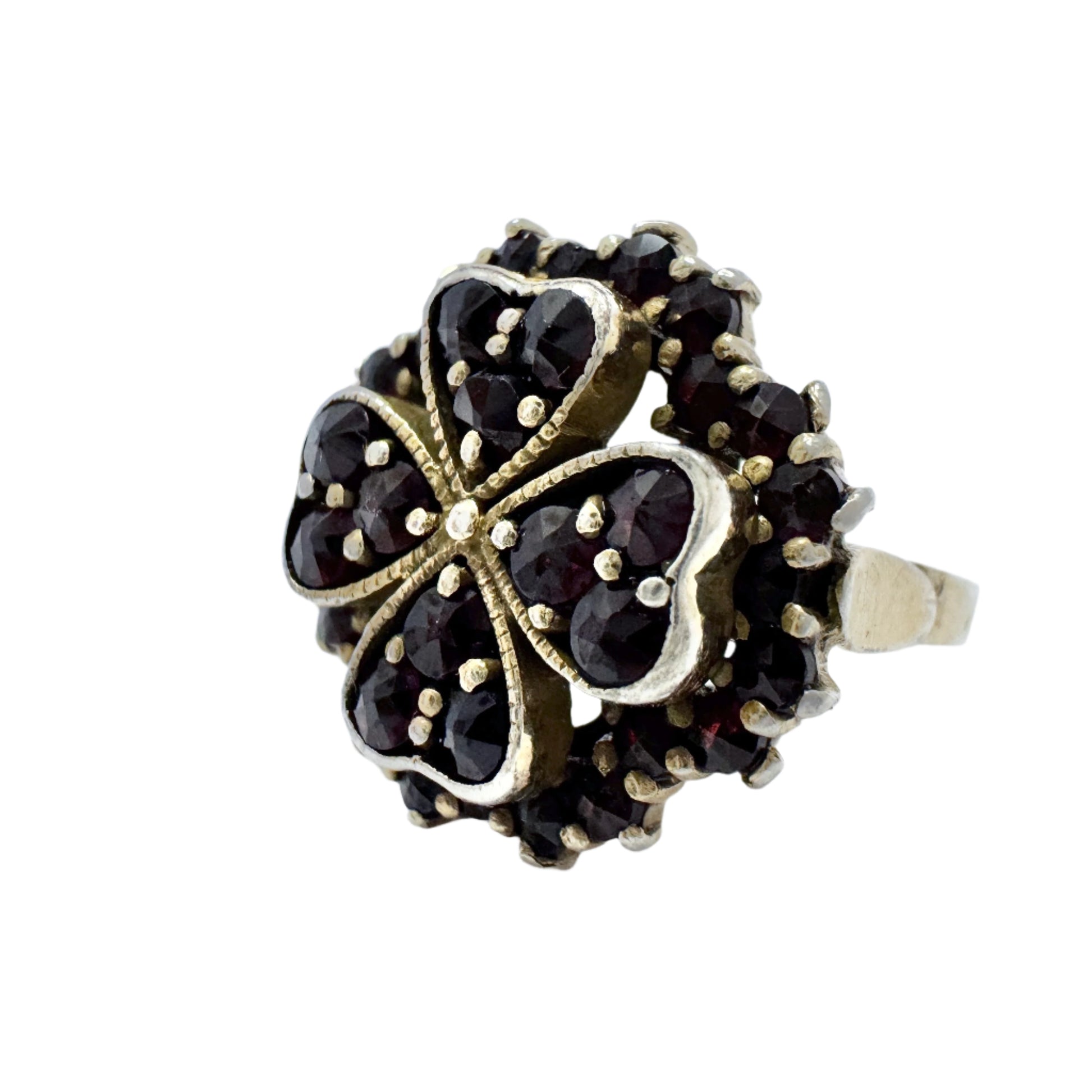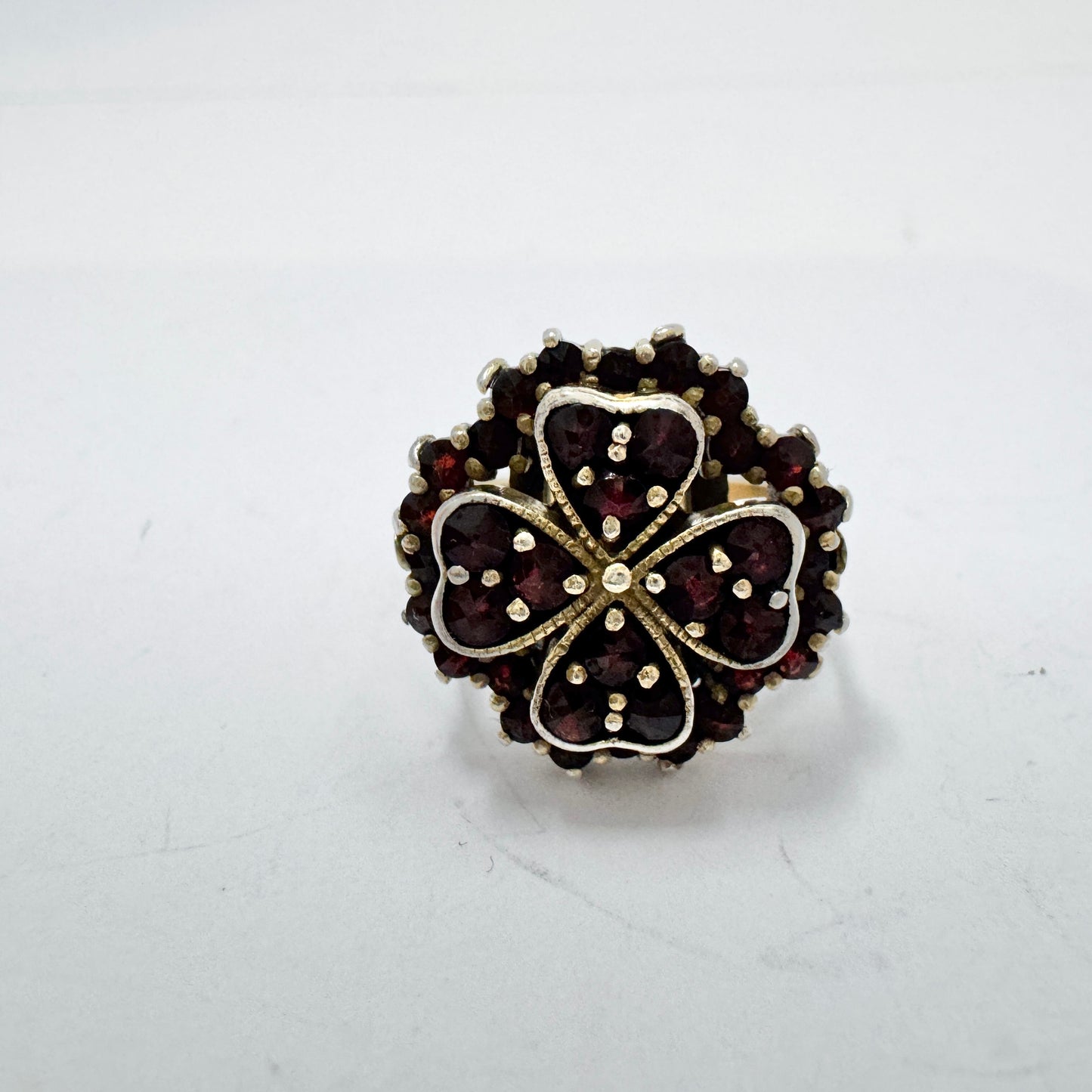 Vintage Solid Silver Bohemian Garnet Four-leaf Clover Ring.