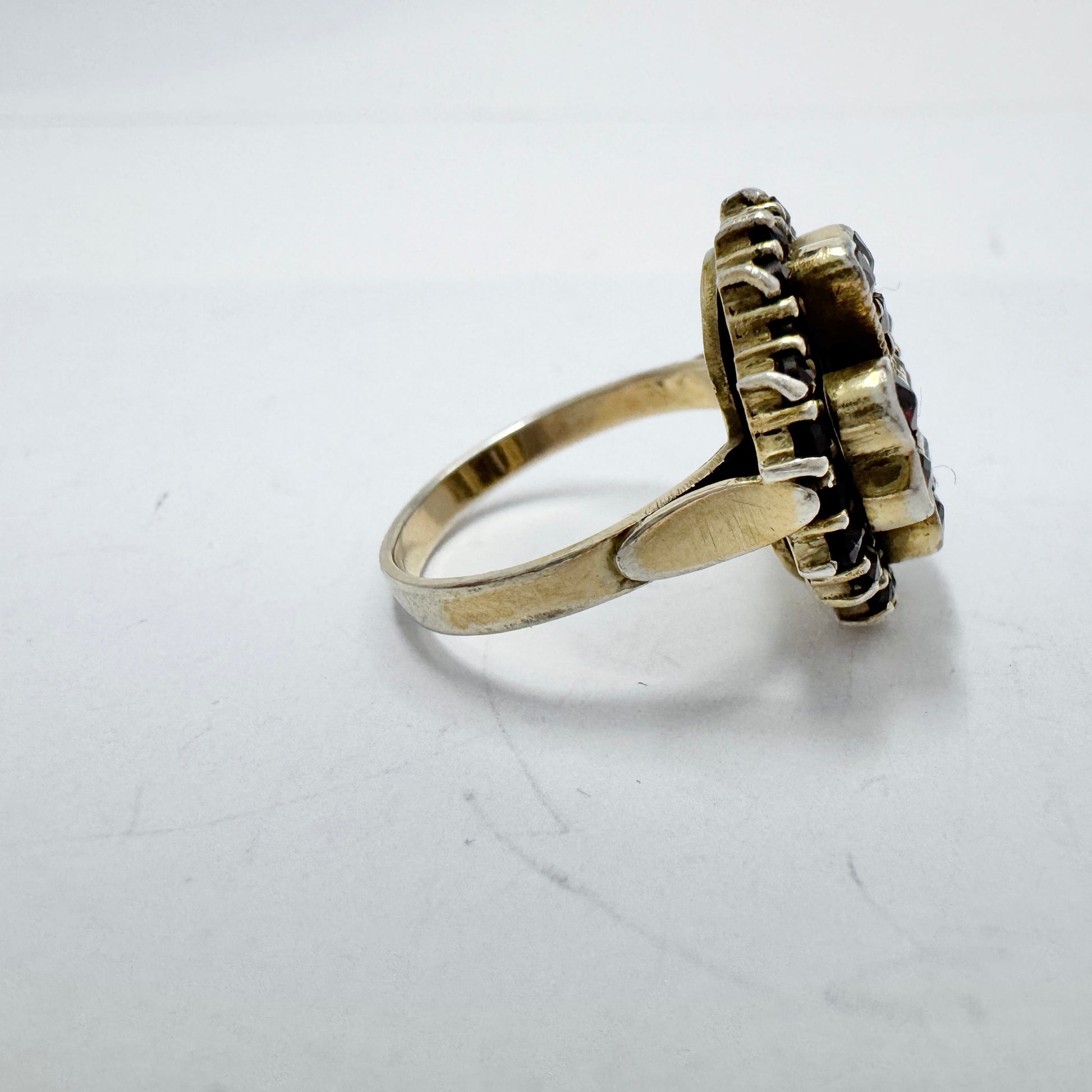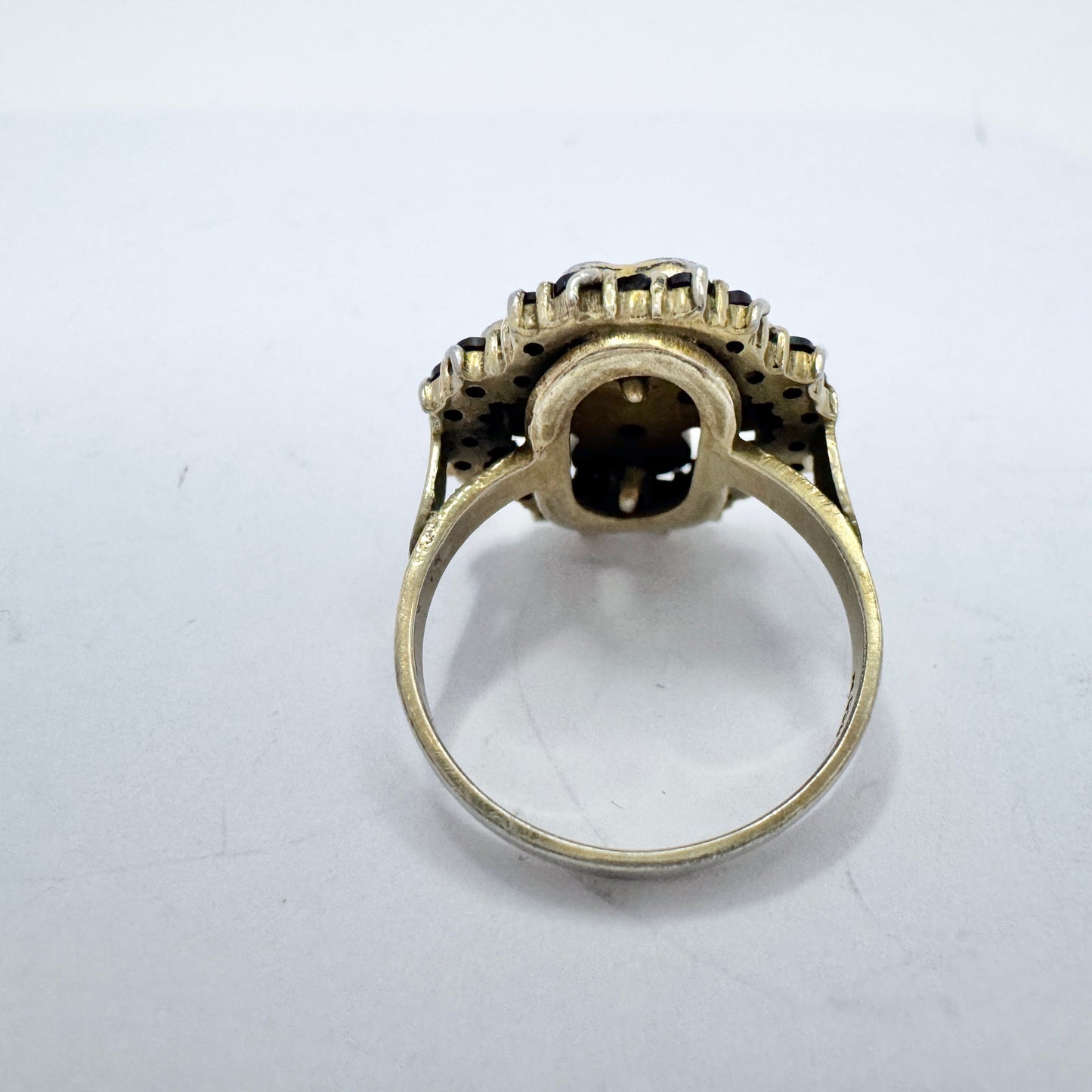 Very charming vintage gilt solid silver bohemian garnet ring. Hallmarked for 800 silver and an unidentified makers mark. Continental Europe c 1940-50s.