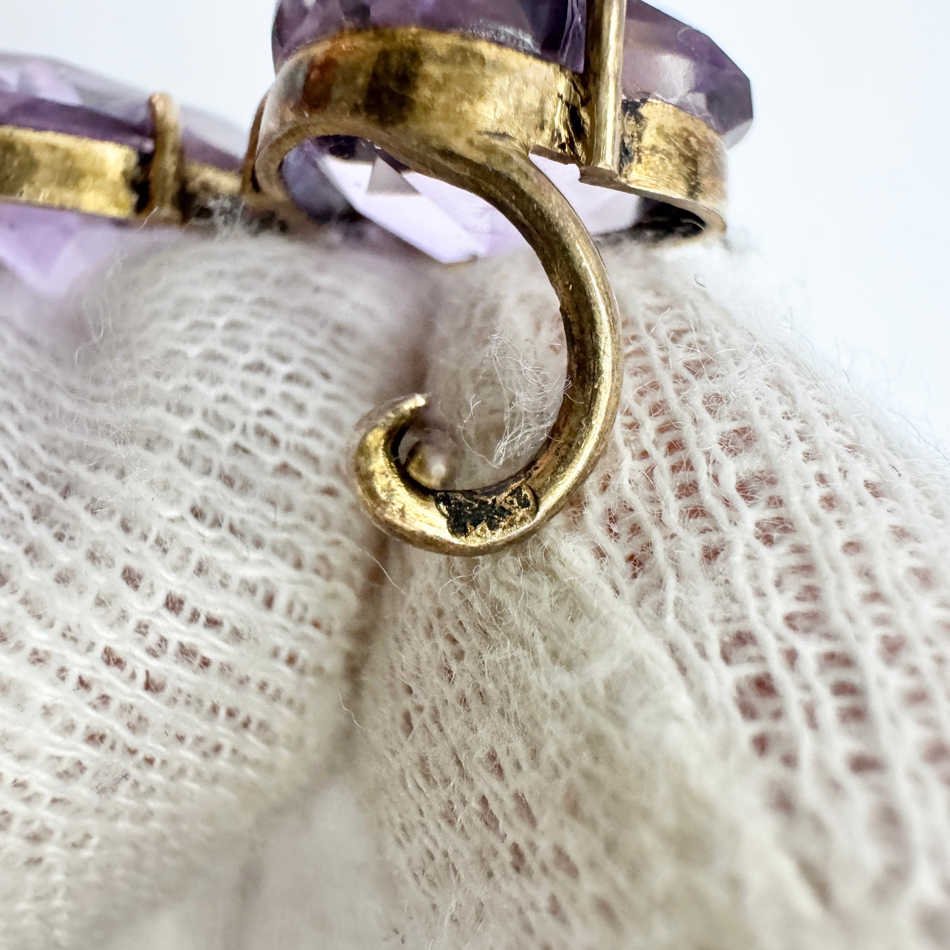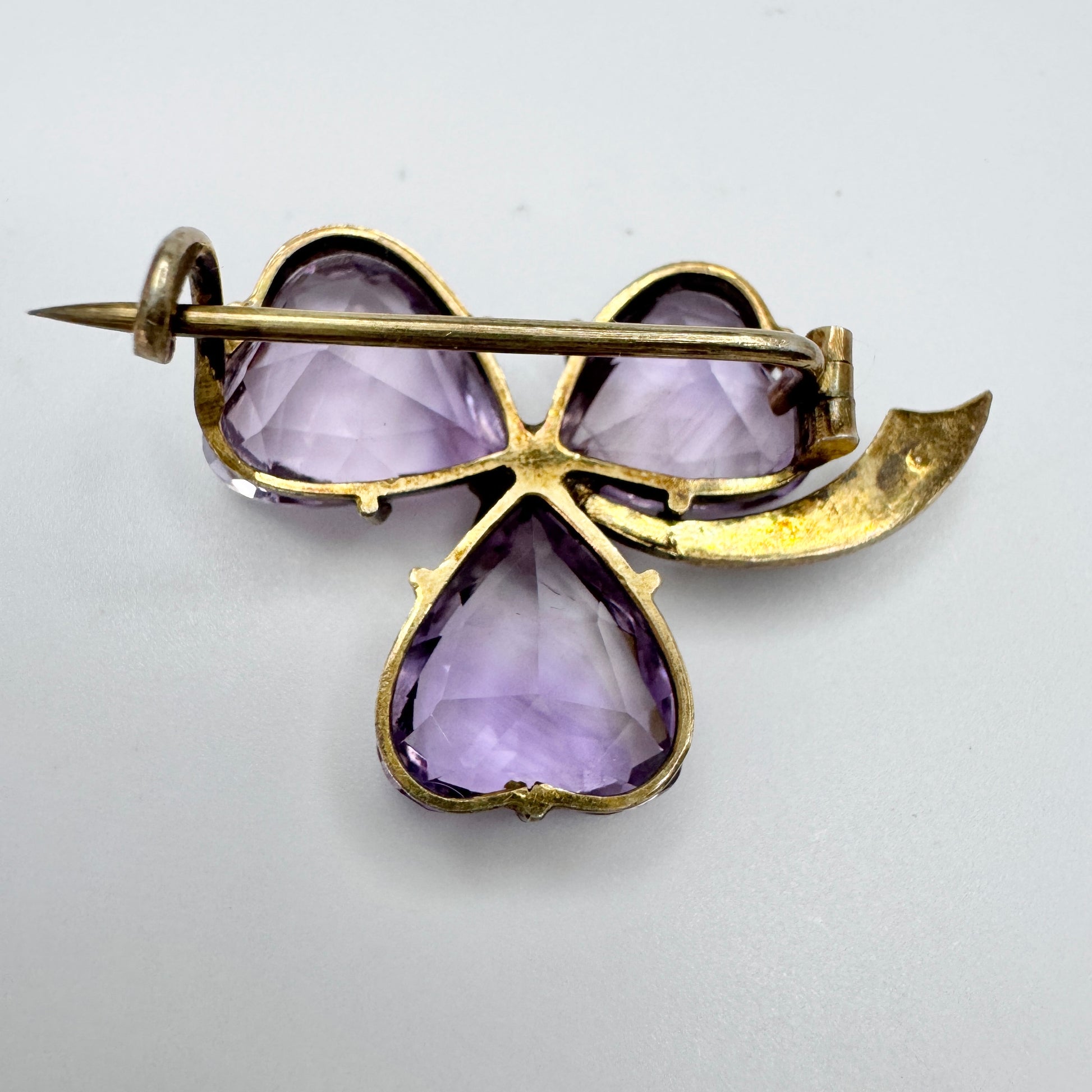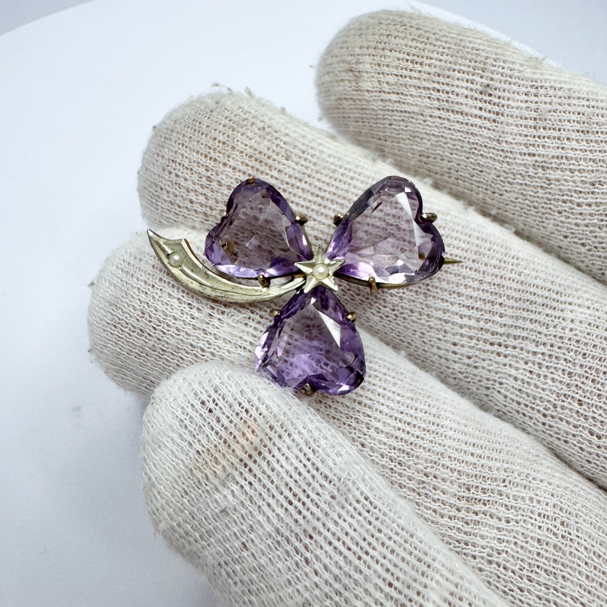 Very charming antique gilt solid silver amethyst seed pearl brooch. Hallmarked with a single indistinct hallmarks. ca 1920.