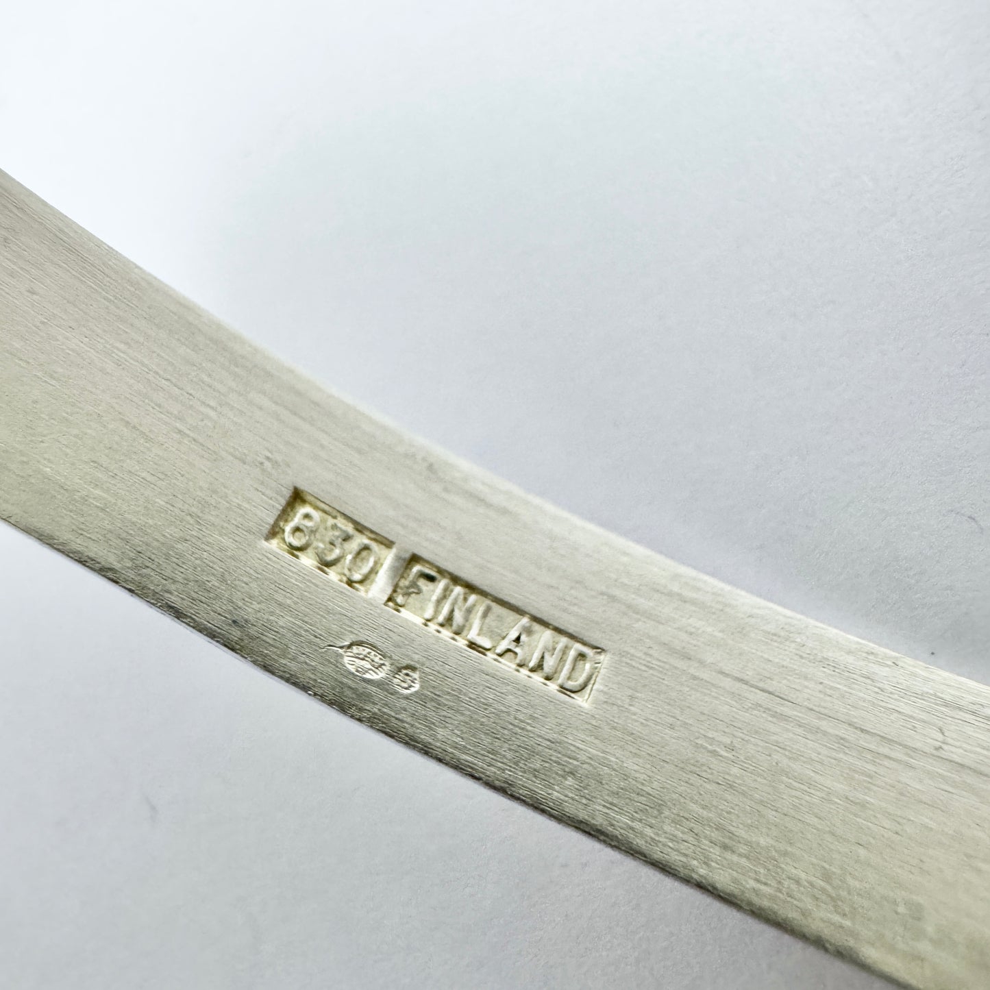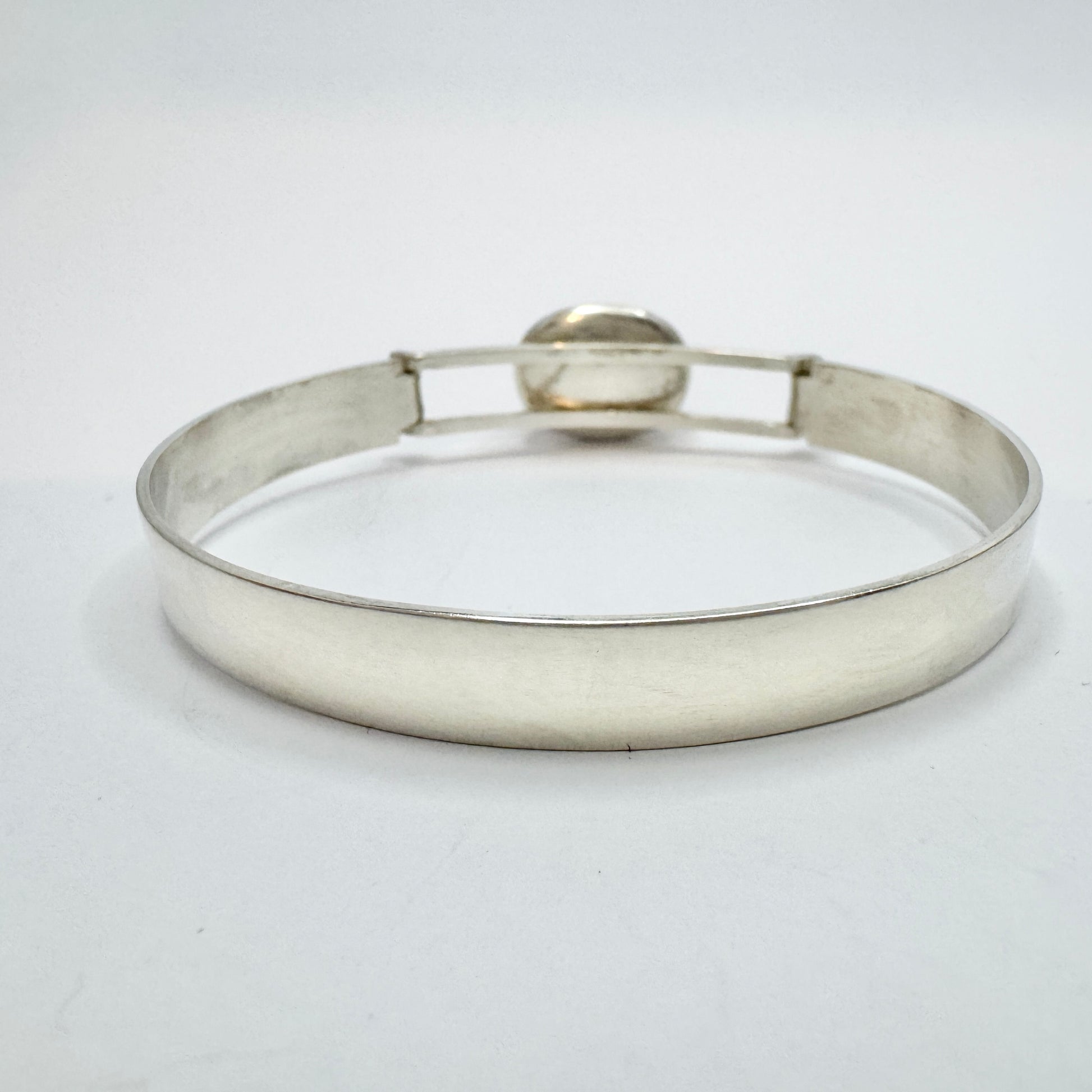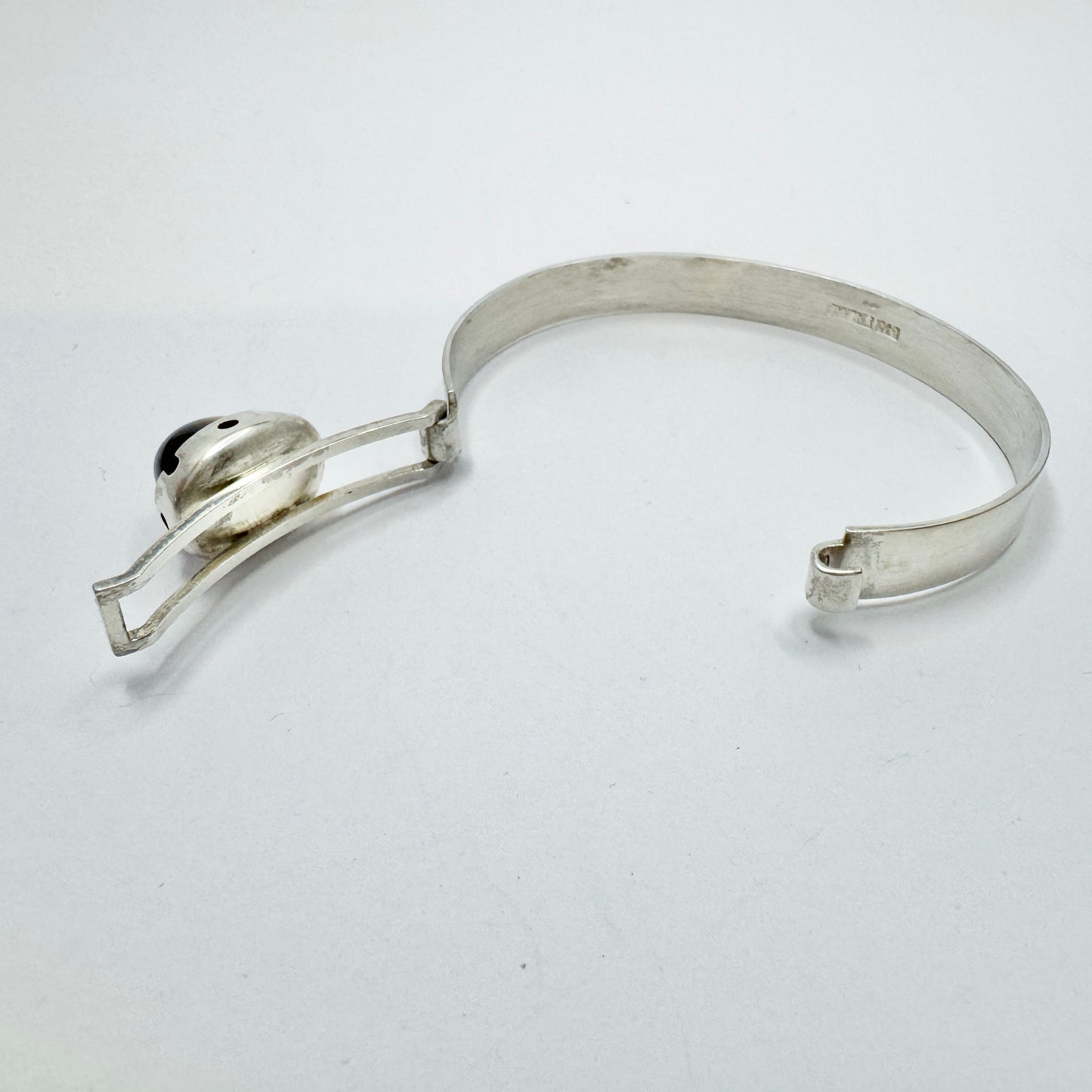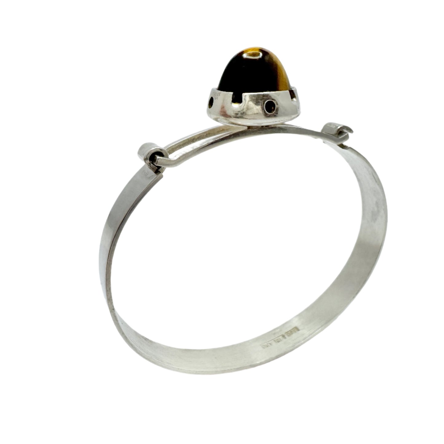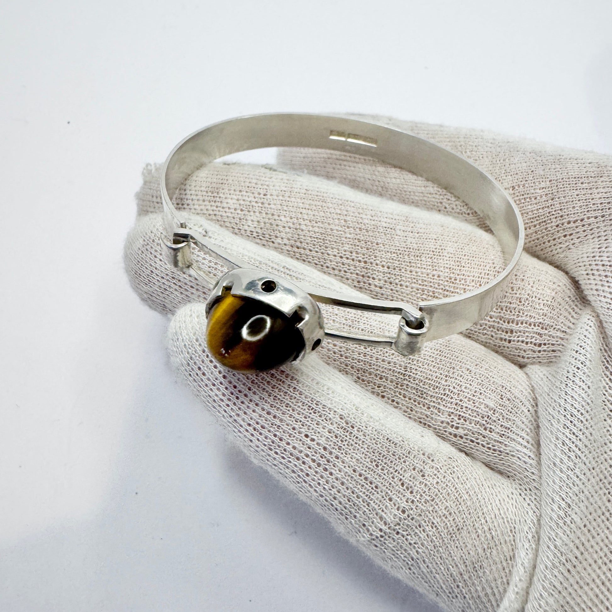 フィンランド、1960 年代頃。ヴィンテージのソリッド シルバー タイガーアイ ヒンジ バングル ブレスレット。