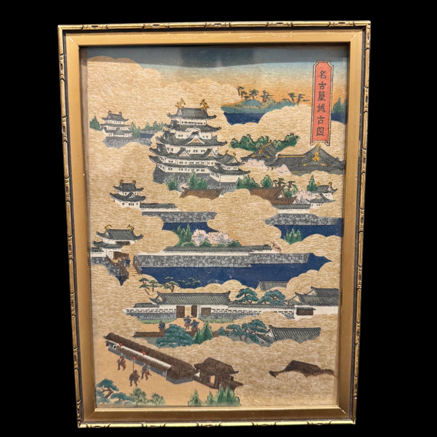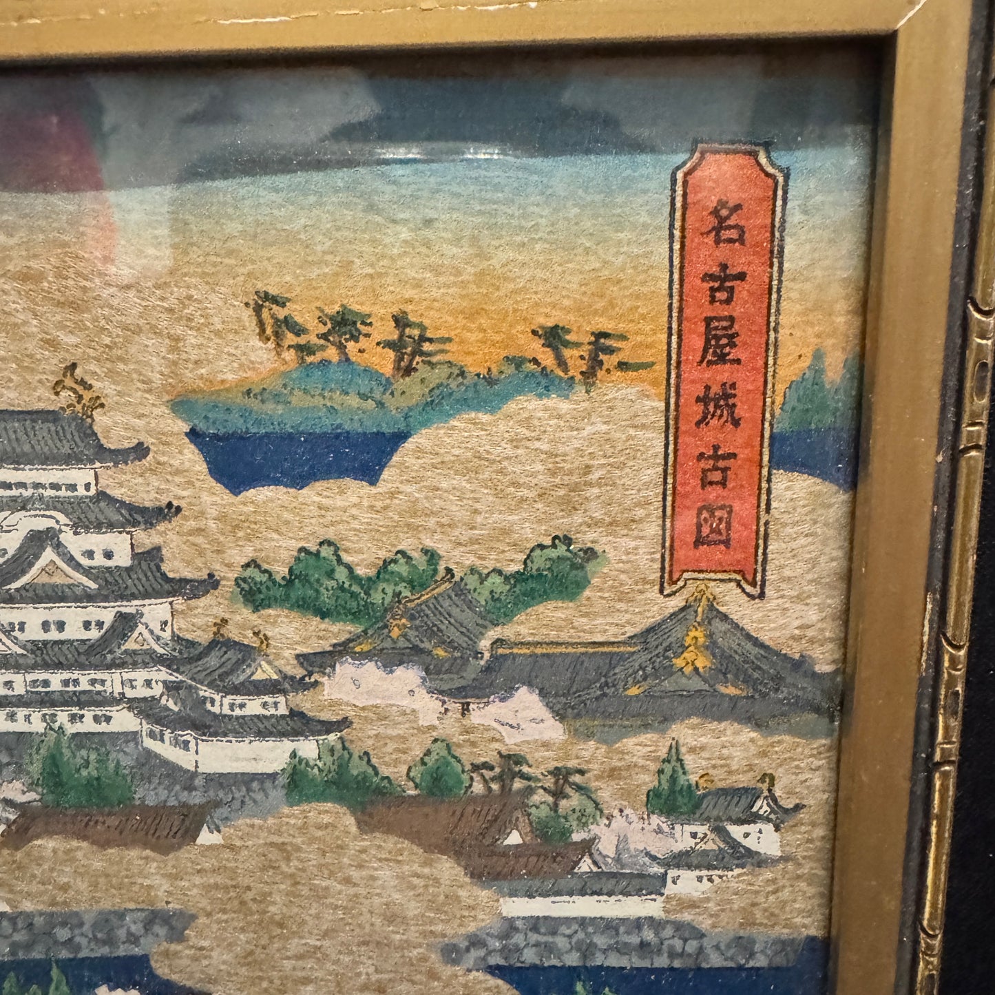 Very charming vintage or antique woodblock print. Depicting Nagoya castle and Shoguns. Behind glass.