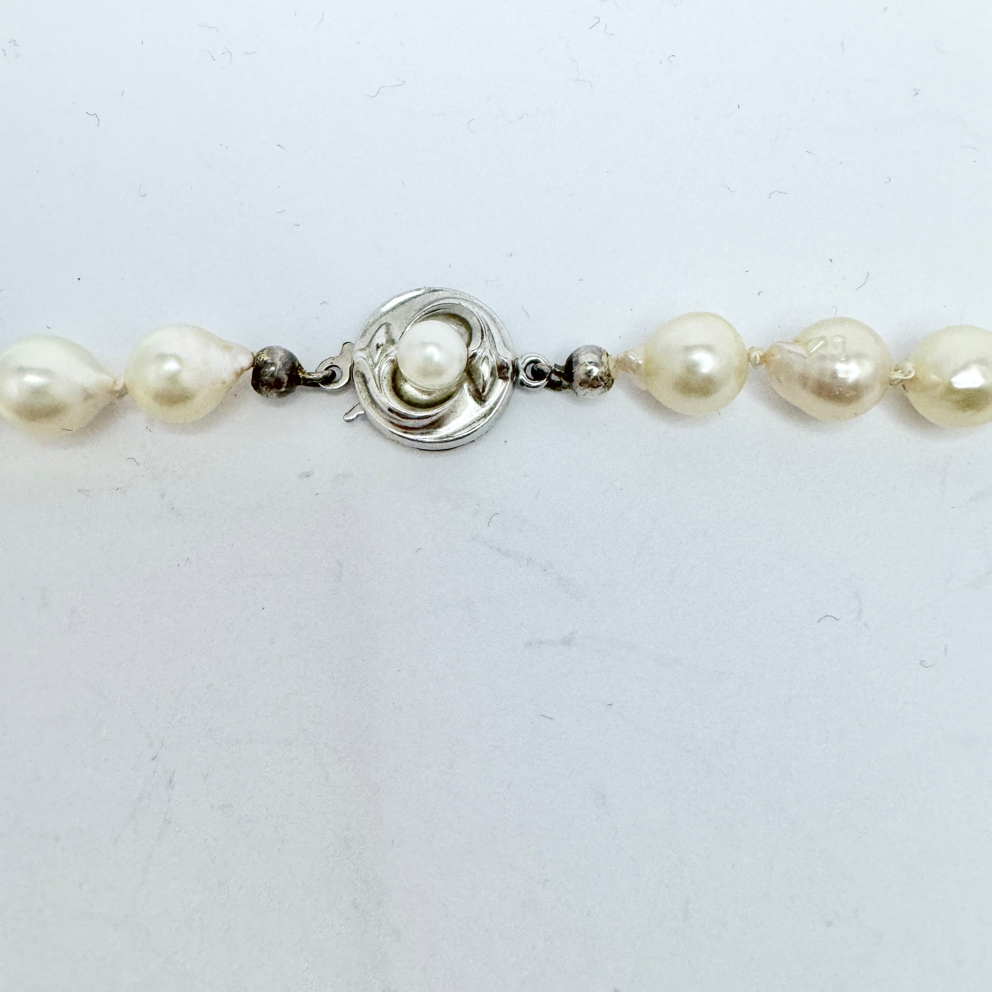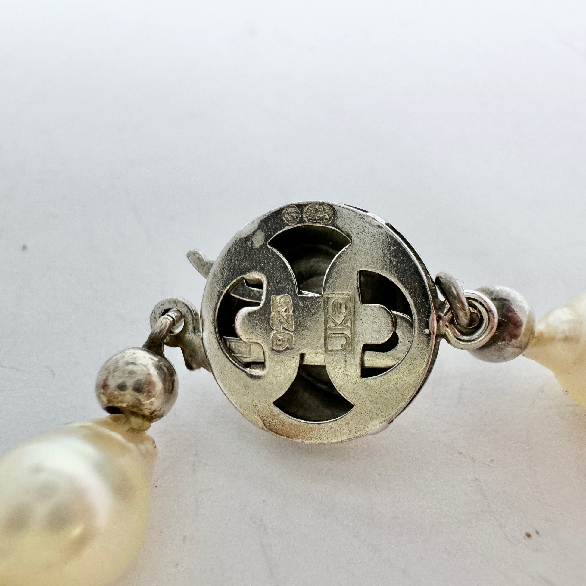 スターリングシルバーの留め金が付いた美しいヴィンテージのアコヤ真珠ネックレス。ドイツの JKa Kohle の刻印があり、スウェーデンの輸入マークも付いています。