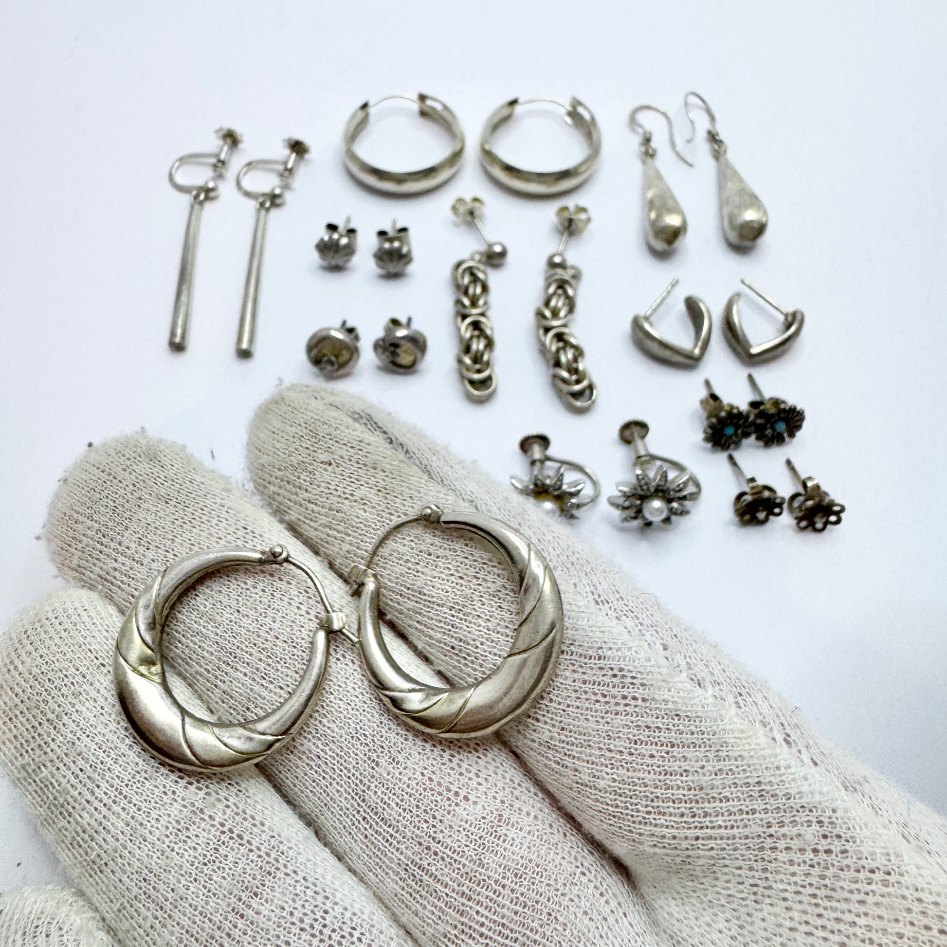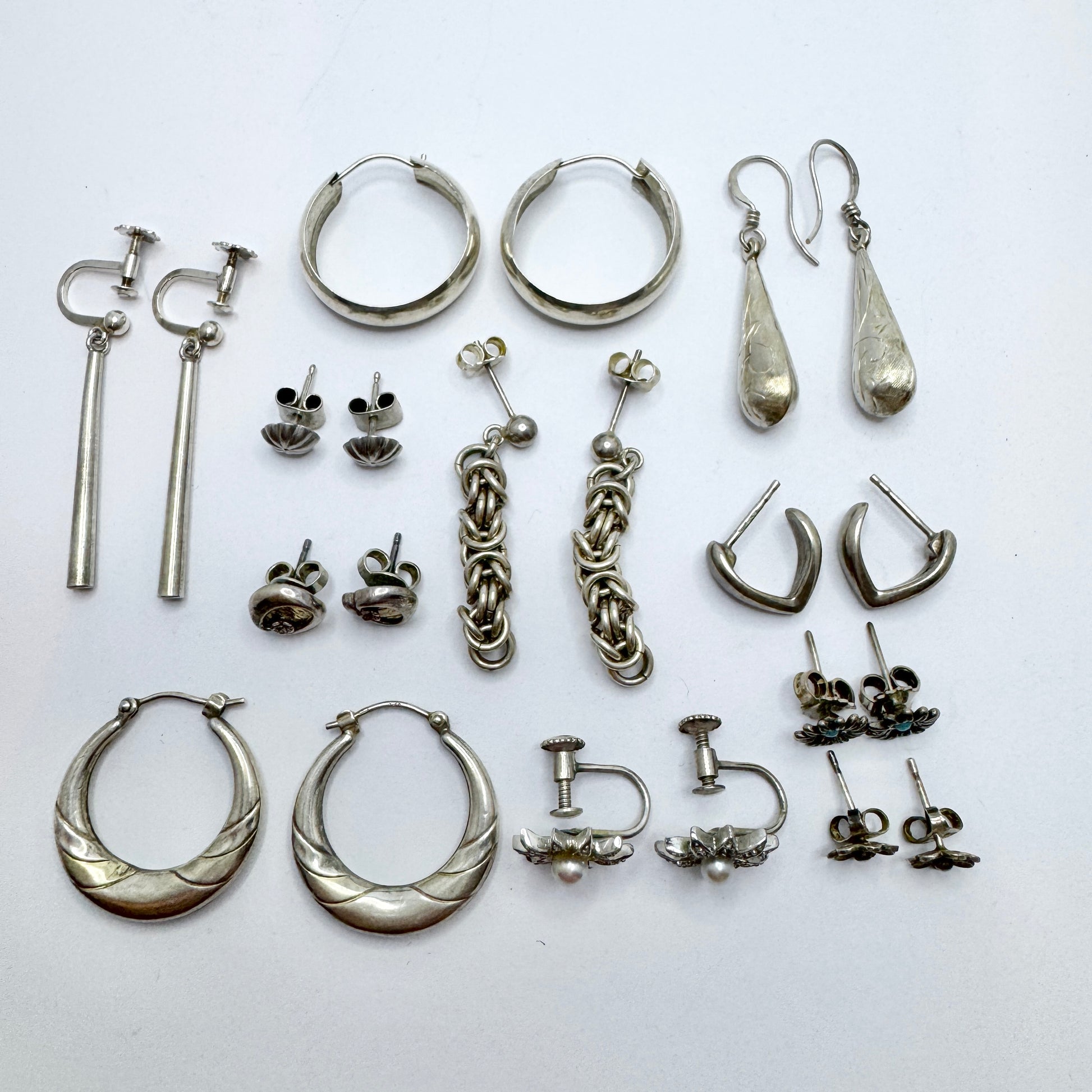 Beautiful job lot of vintage solid silver earrings. Ca 1950-1980s. 12 pair. Please note that this is a job lot, items are not polished and will not be shipped in separate gift / storage boxes.