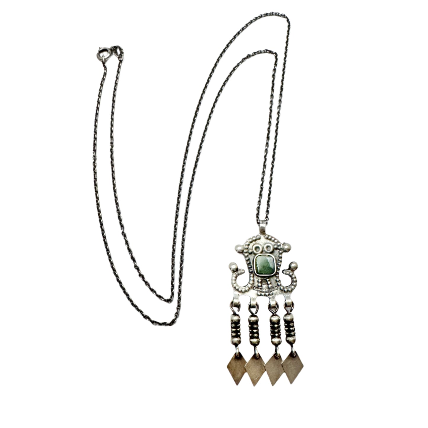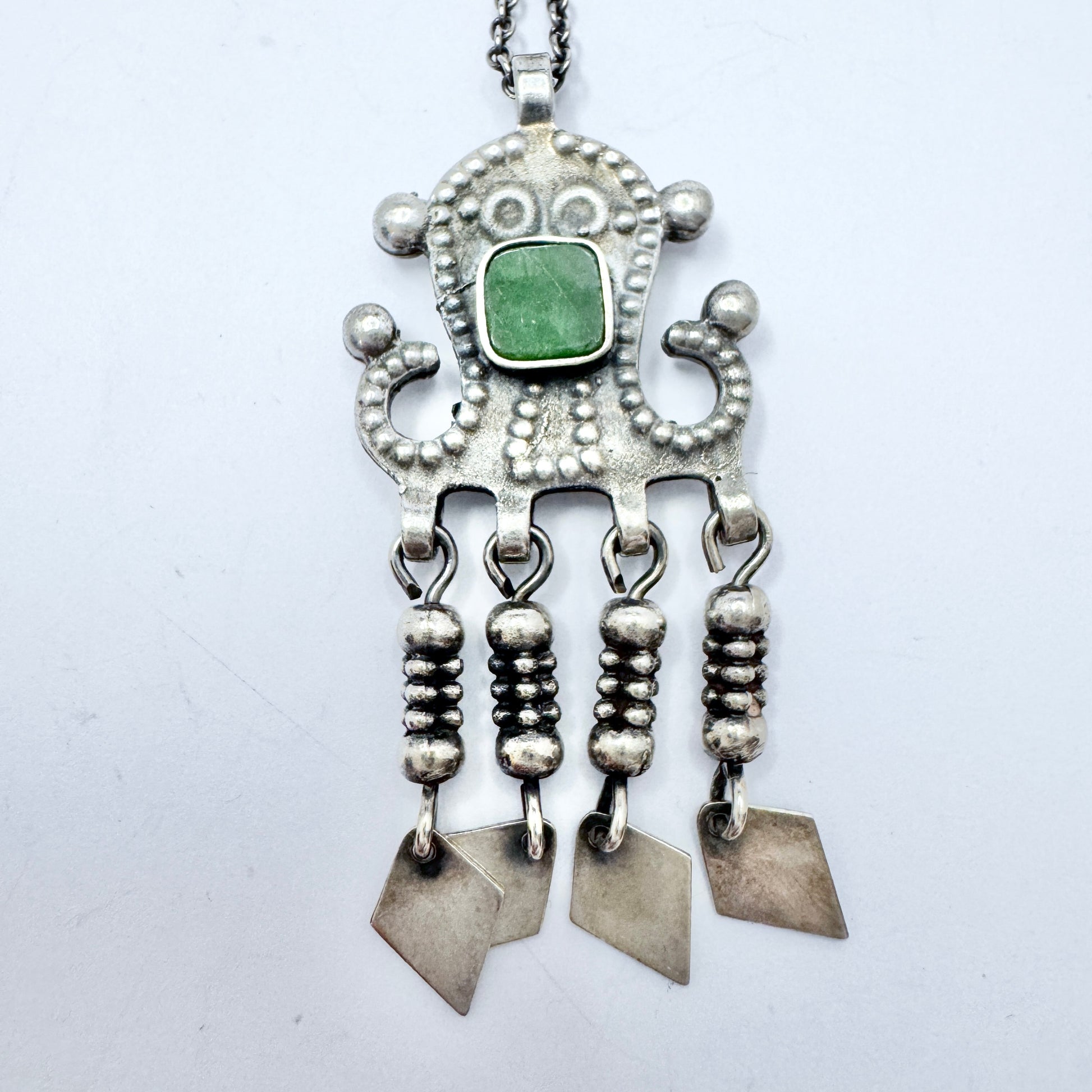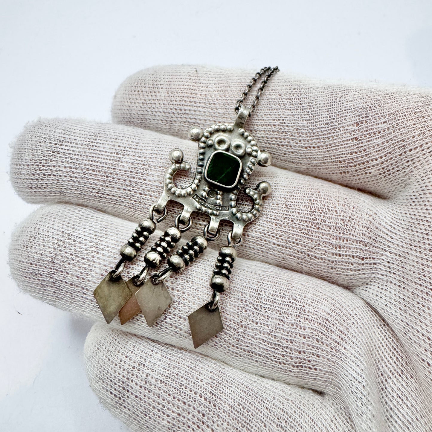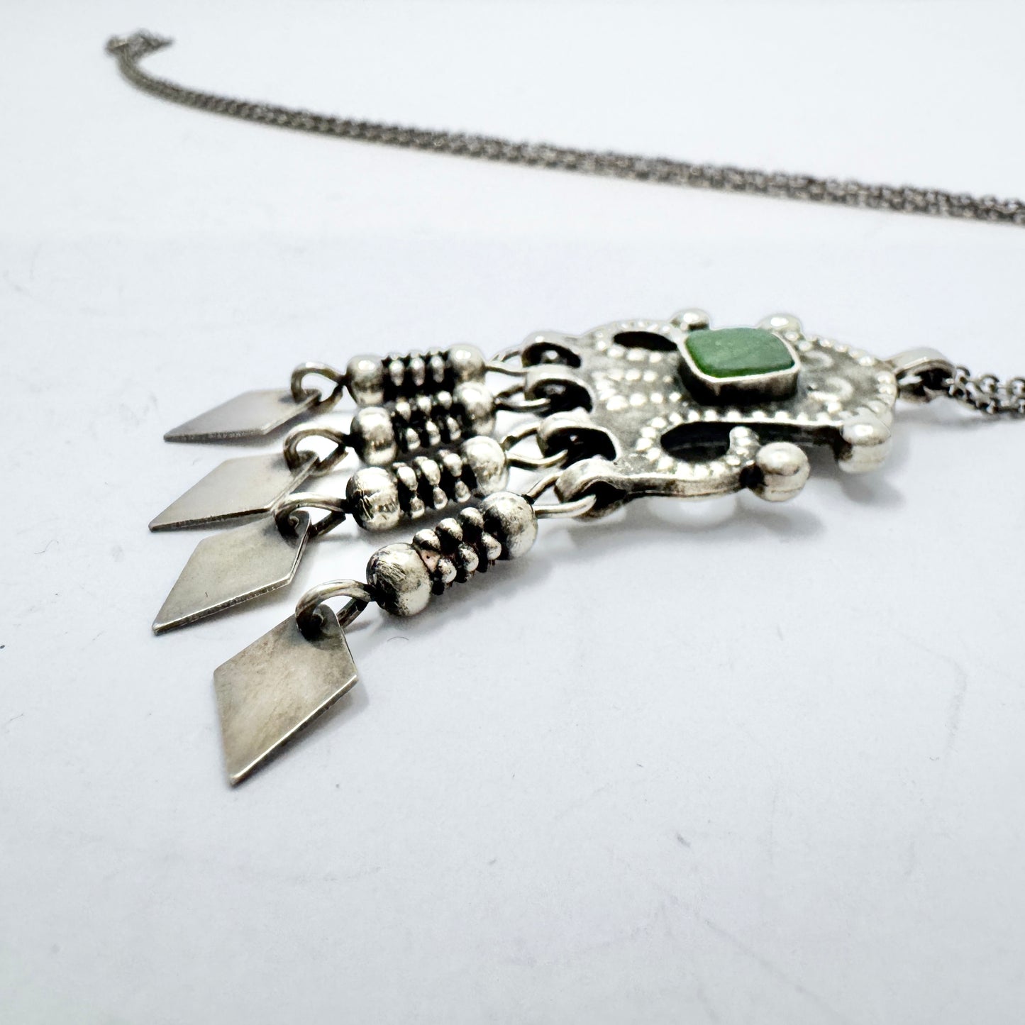 素晴らしいヴィンテージの純銀製グリーンの地元産ハードストーンペンダントネックレス。ペンダントとチェーンには、フィンランドのカレワラ コル、1969 年の刻印があります。