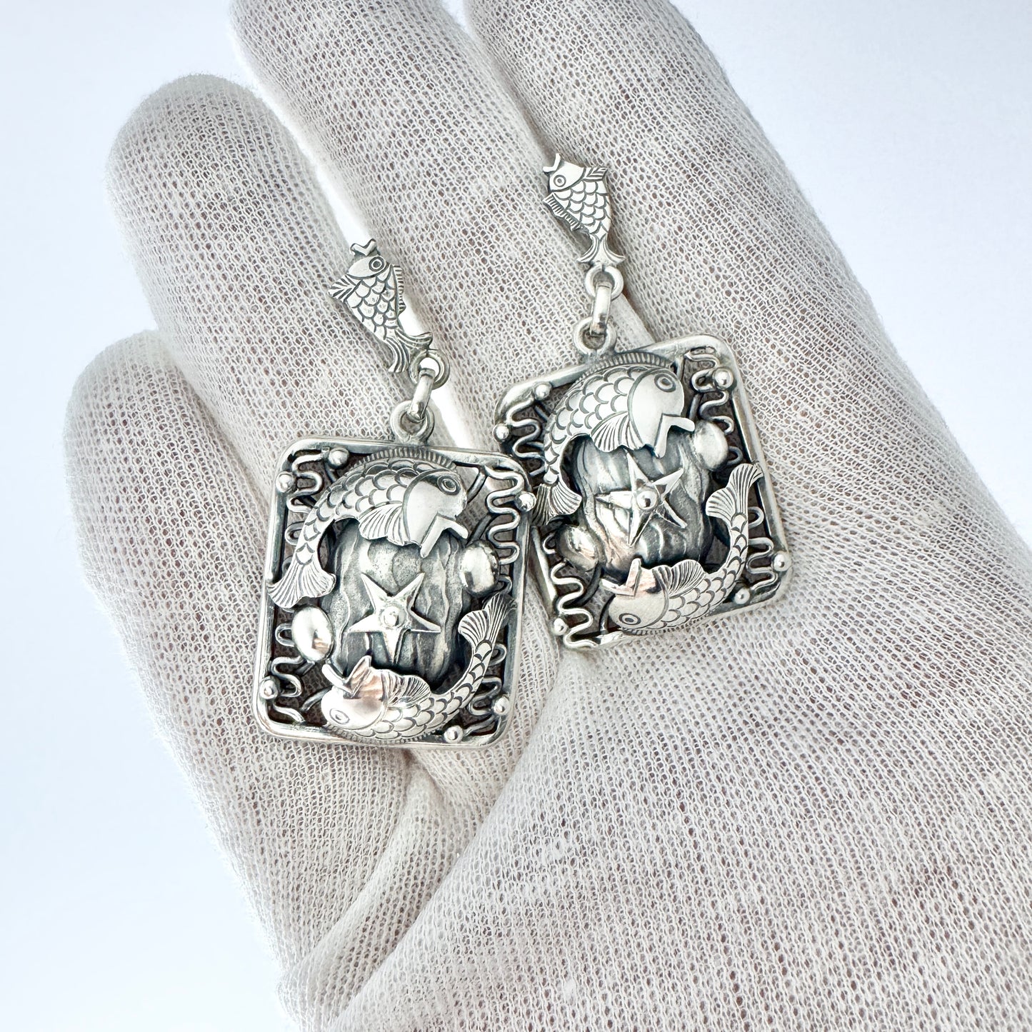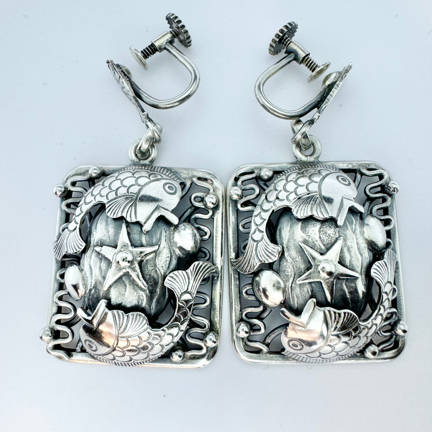 Leif Ulrich Daurup、デンマーク、1950 年代頃。ビンテージのスターリング シルバーの魚のイヤリング。