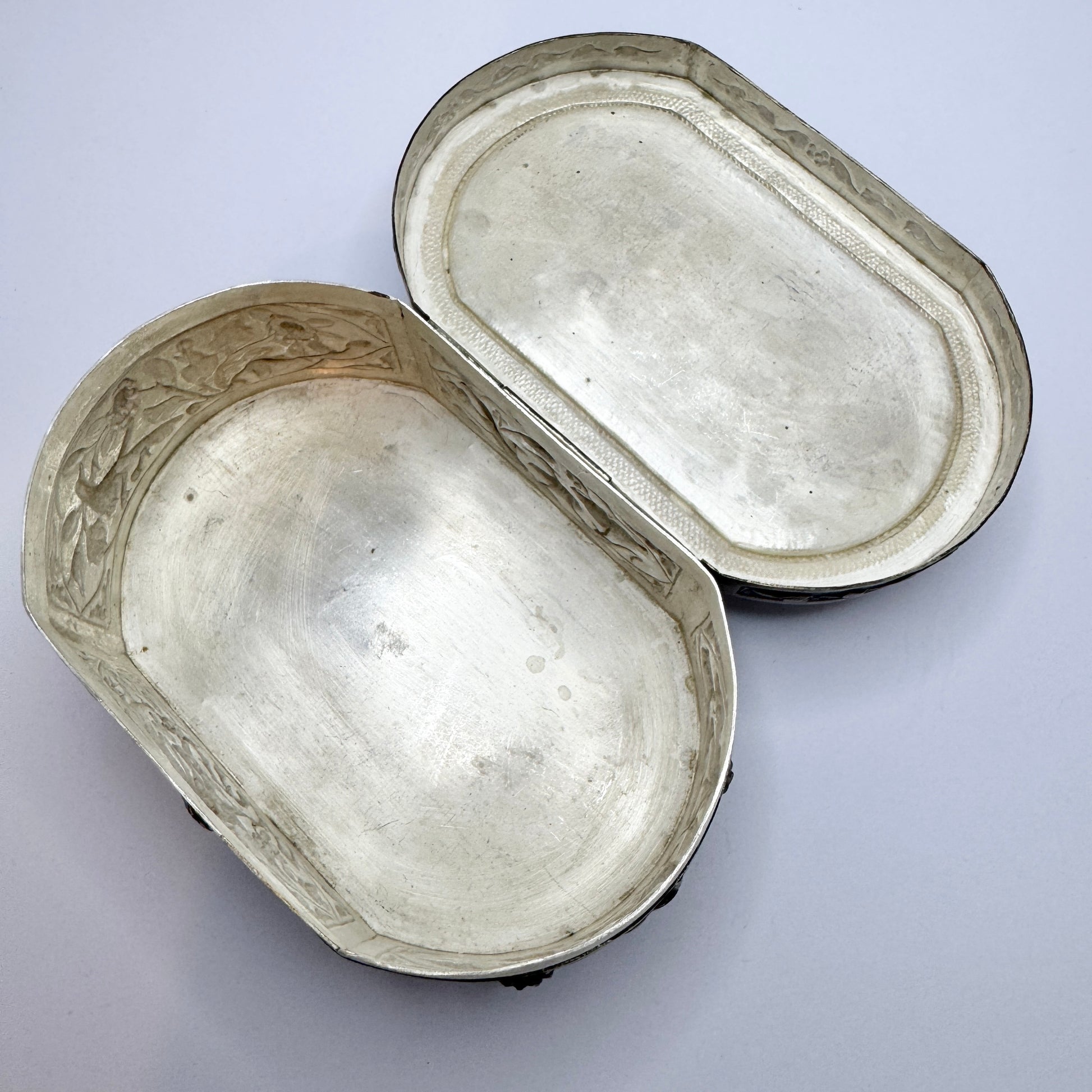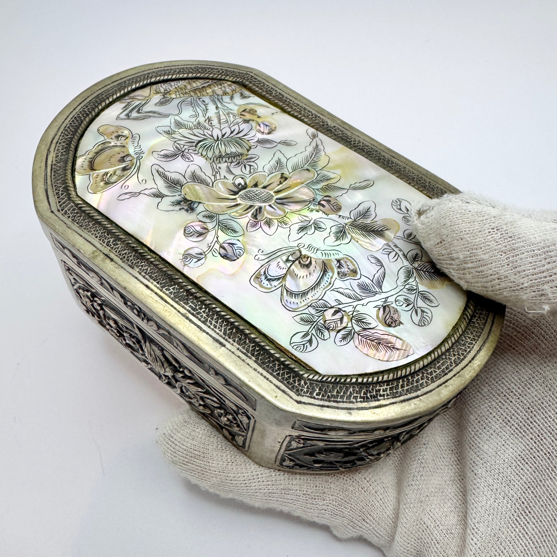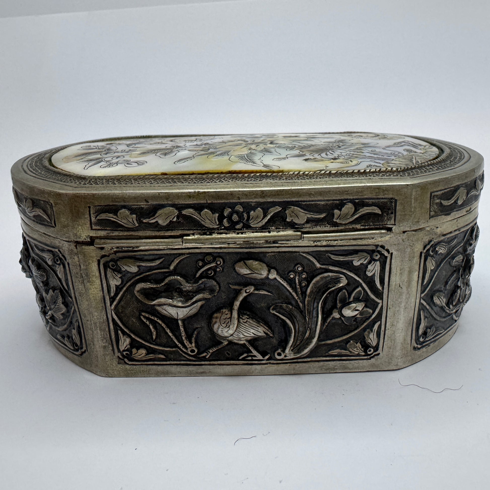 Oriental Antique / Vintage Solid Silver Carved MoP Inlay Jewlery Casket Trinket Box.