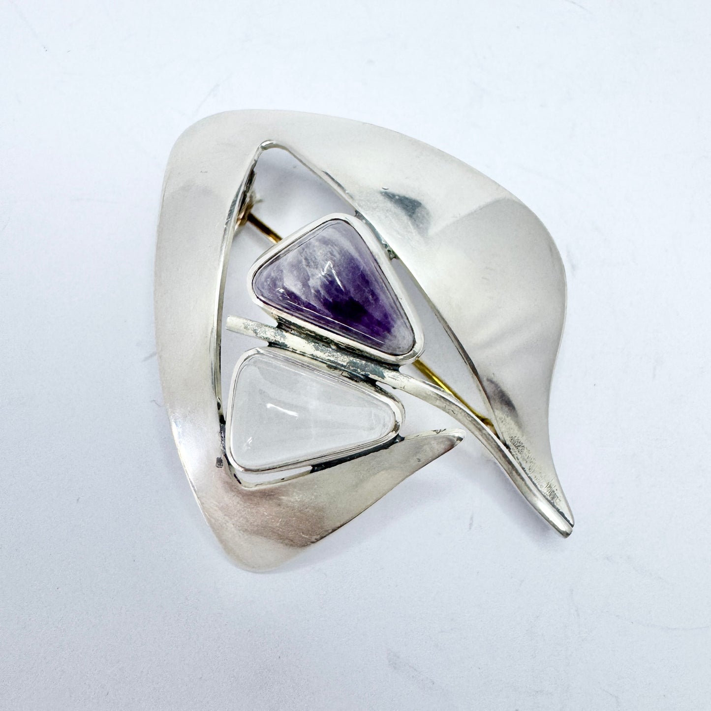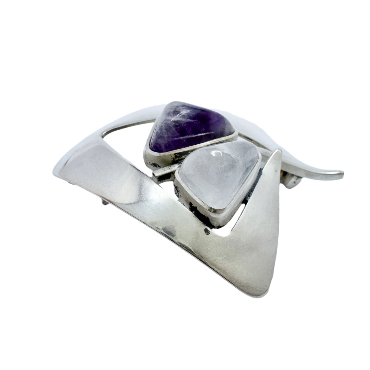 Charming vintage solid silver quartz (amethyst and milky quartz) brooch. Hallmarked for Pirkan Kulta, Finland year 1961.
