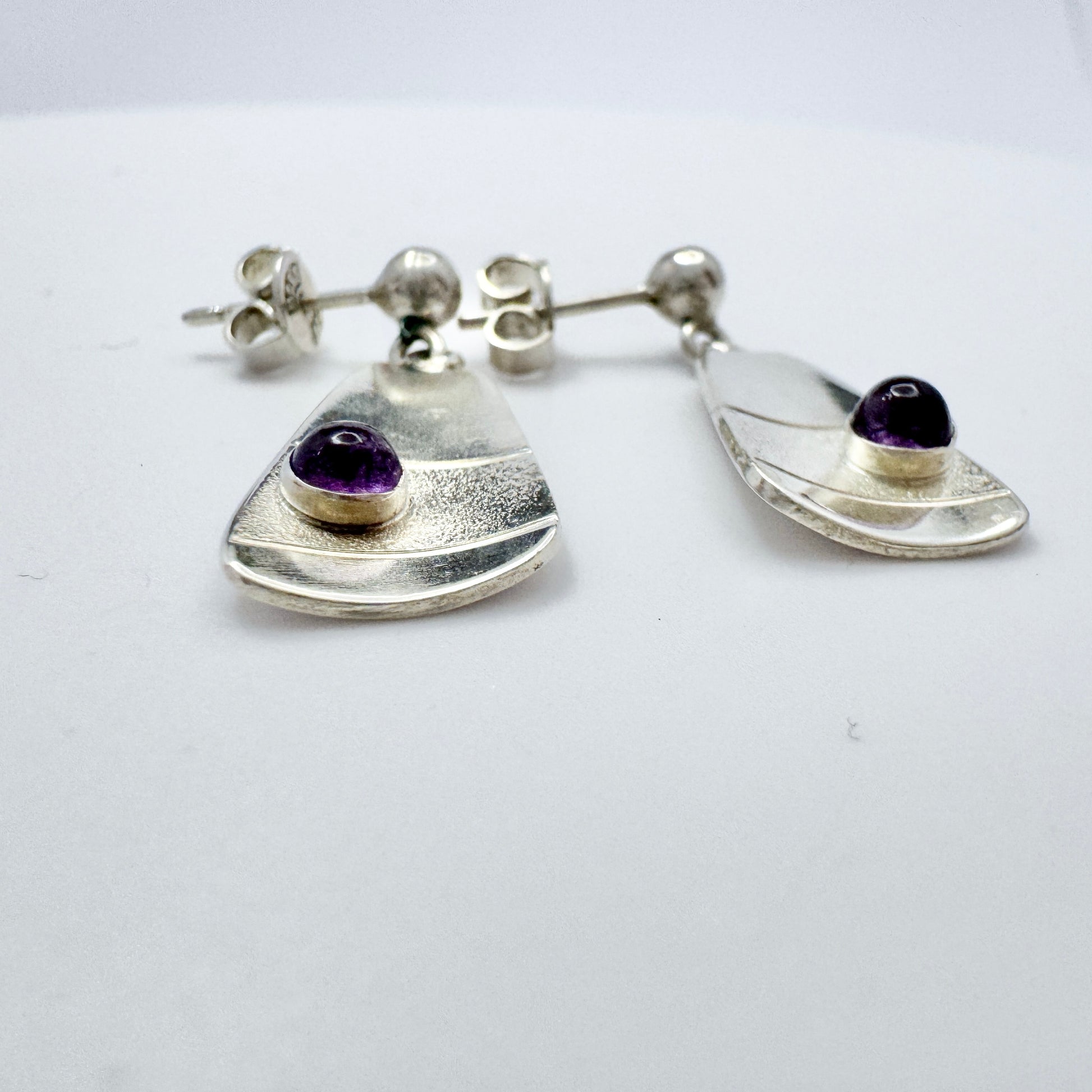 美しく、非常に人気のあるビンテージのスターリングシルバー製アメジストイヤリング。スウェーデンの R Tennesmed 社による 1959 年の刻印があります。