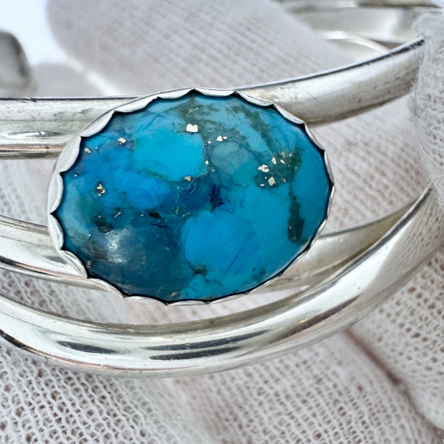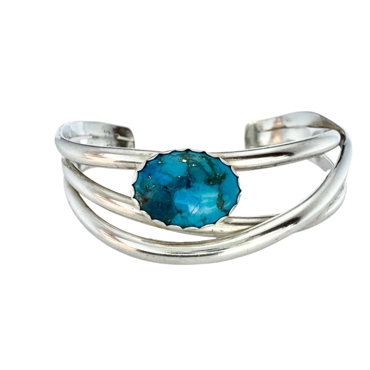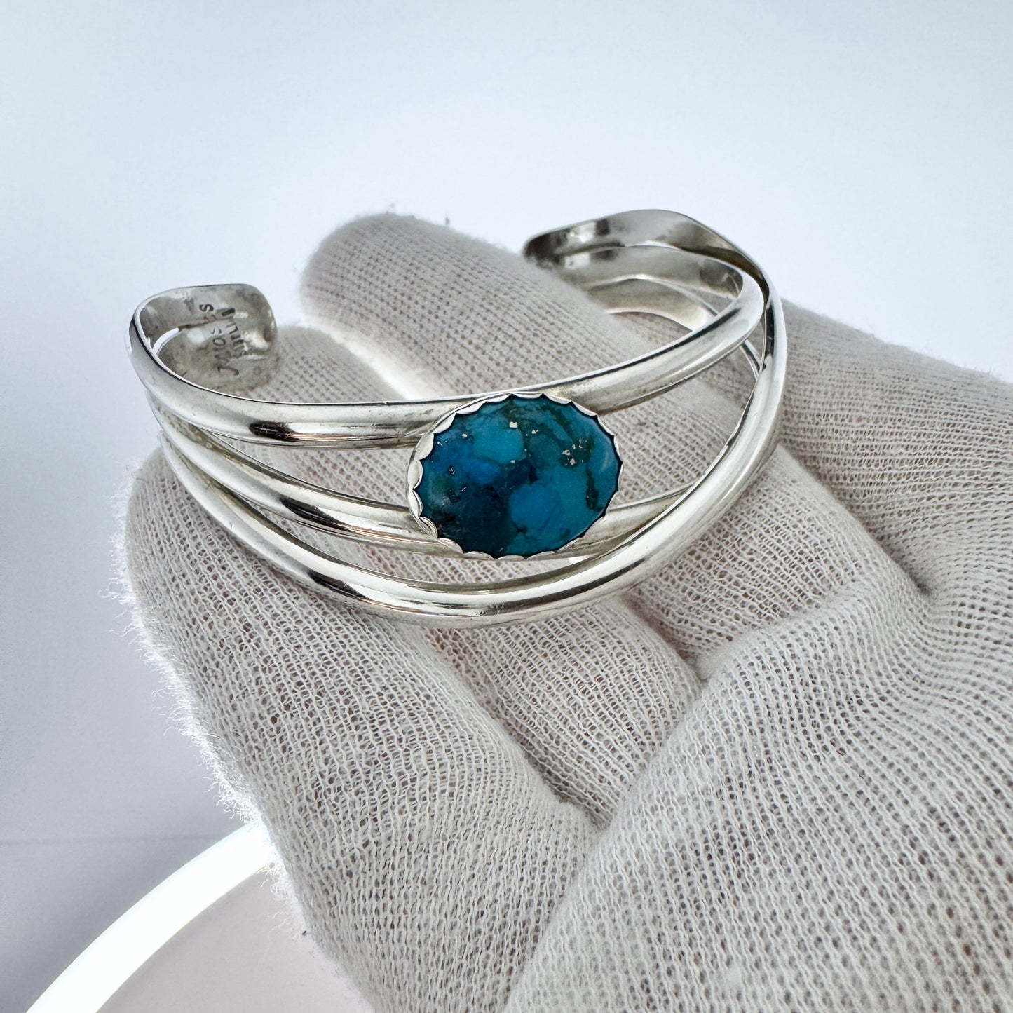 美しいビンテージのスターリング シルバー ターコイズ カフ ブレスレット。スターリング シルバーと「モーゼス」ネイティブ アメリカンの刻印があります。