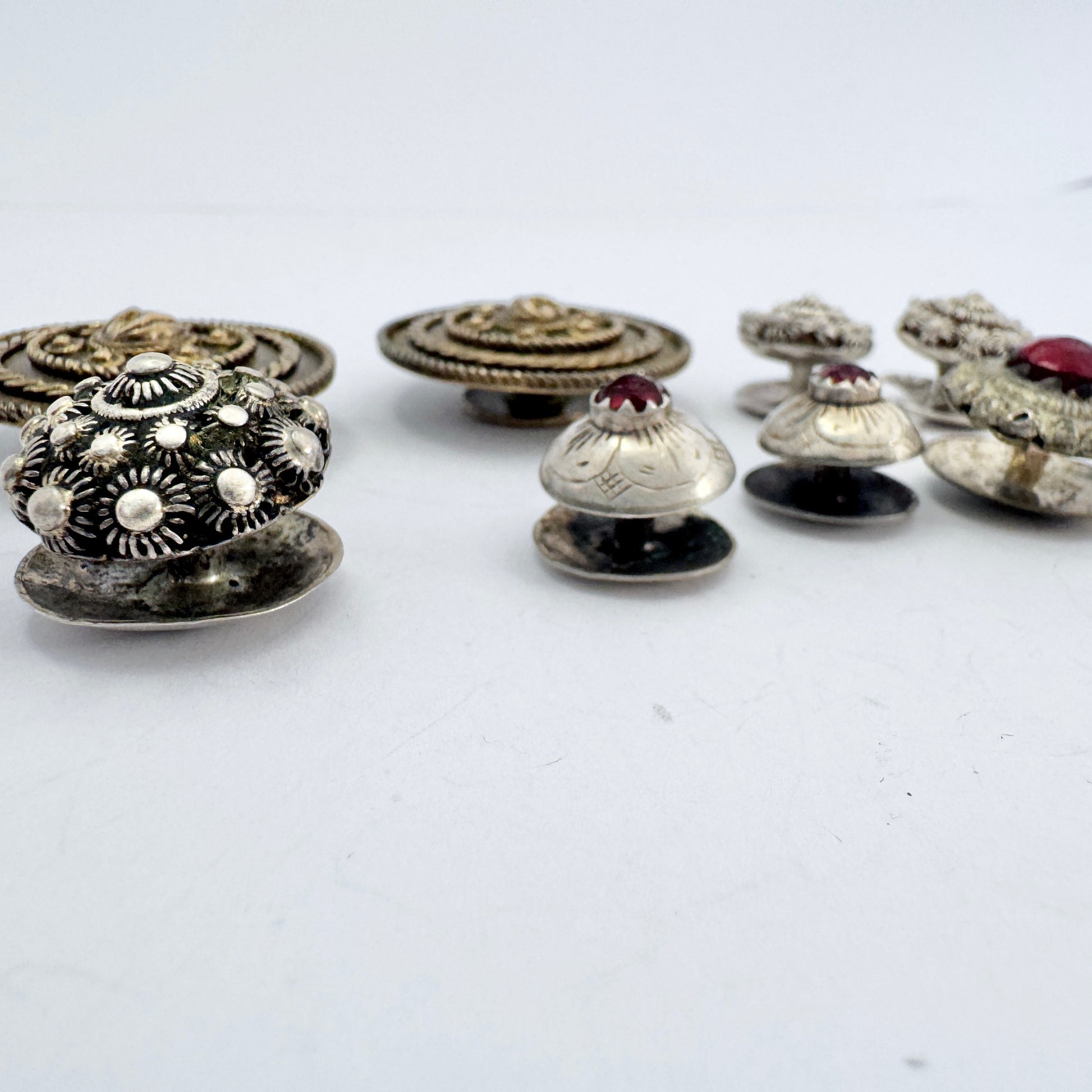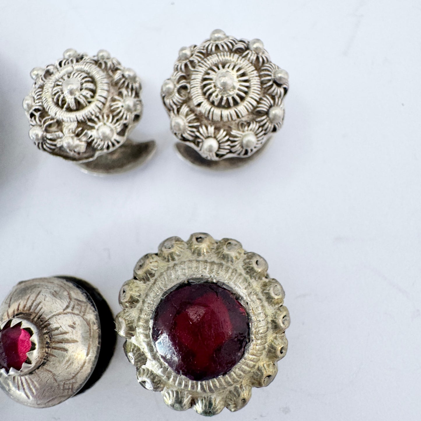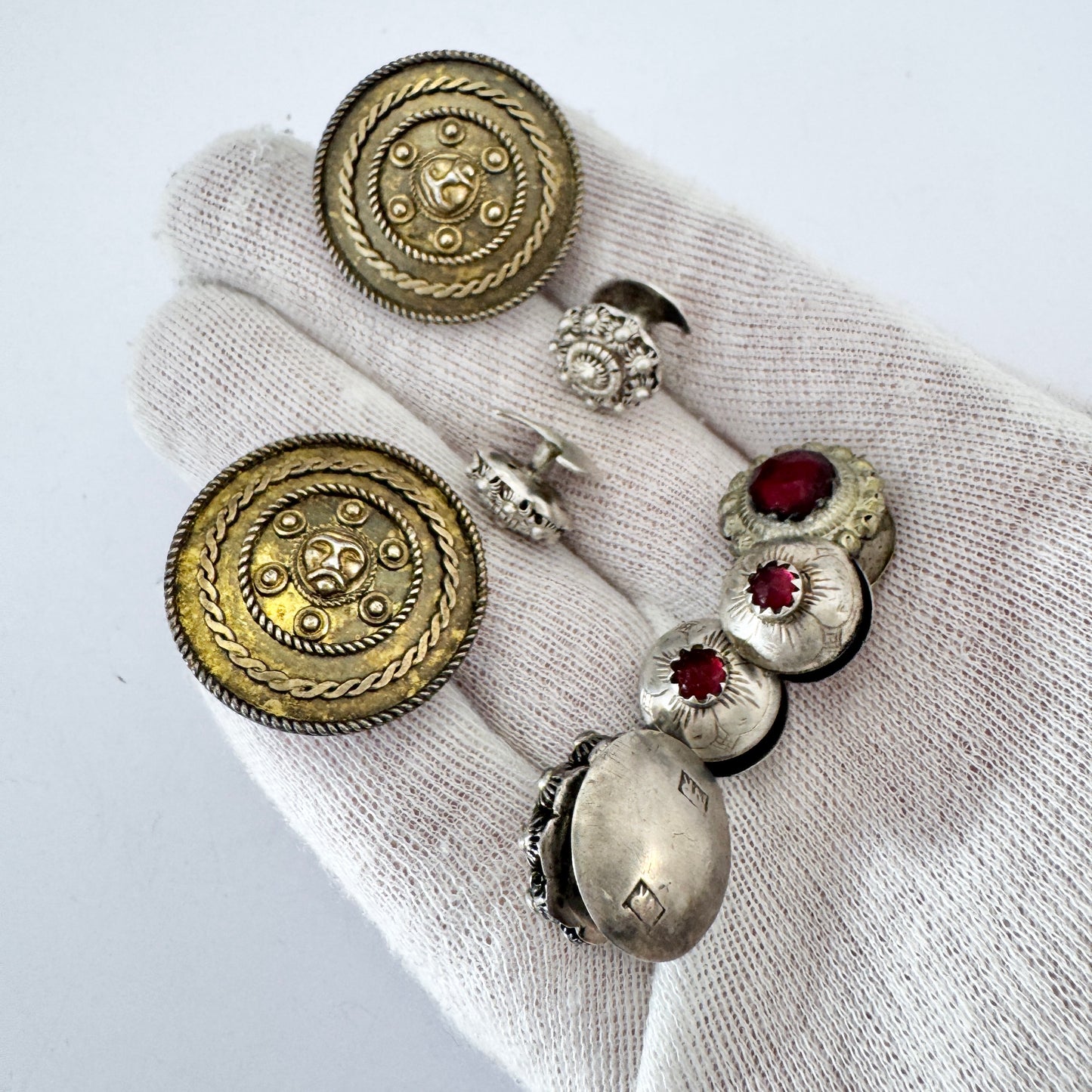 非常に魅力的なアンティークの純銀ボタン (一部にペースト ストーン付き) のコレクション。金メッキが施された 2 つの大きいボタンには、スウェーデンの JPH&Sn、1880 年の刻印があります。赤いペーストが施された 2 つの小さいボタンには、スウェーデンの V&S、1855 年の刻印があります。その他のボタンには、1860 ~ 1870 年代頃のスウェーデンのメーカーの刻印があります。