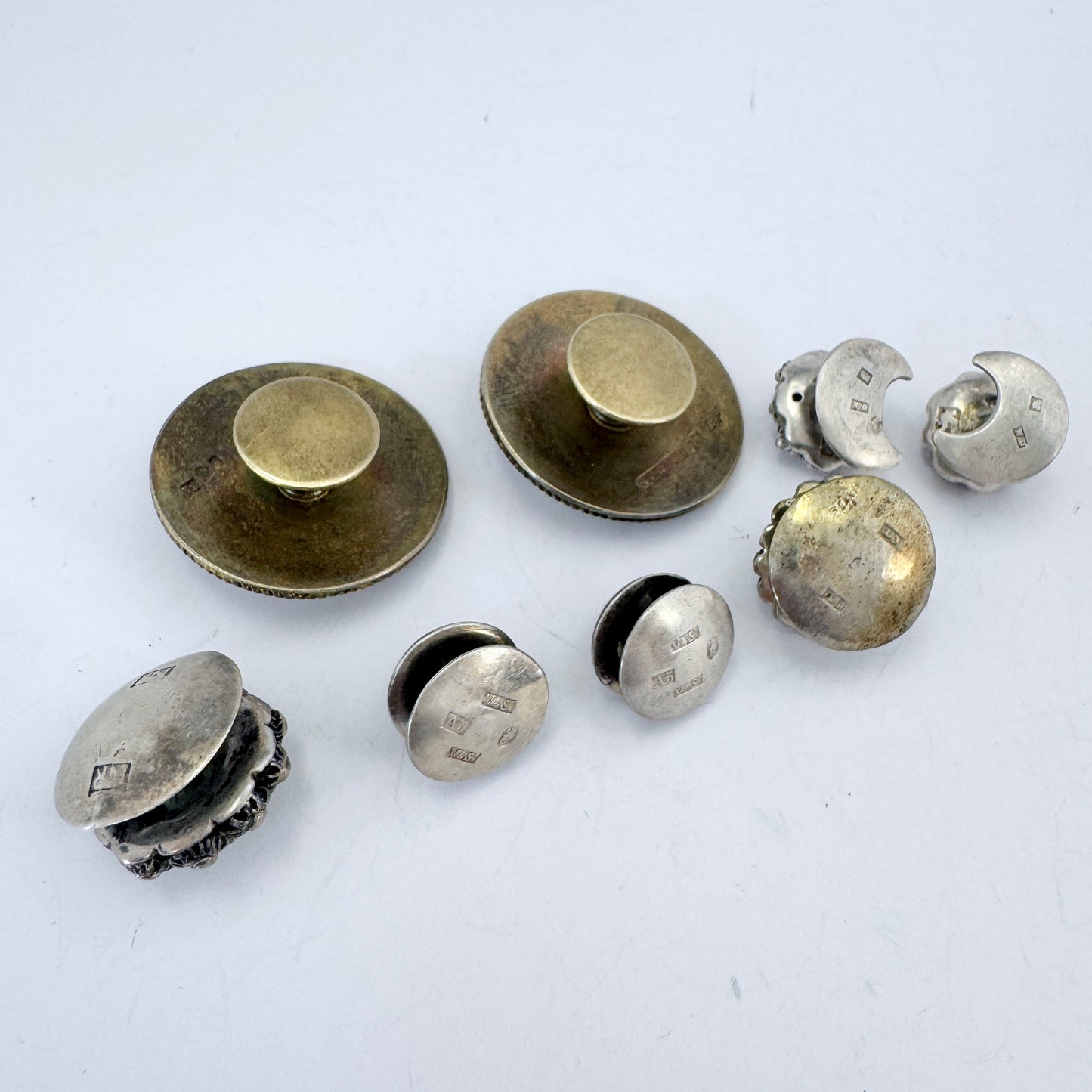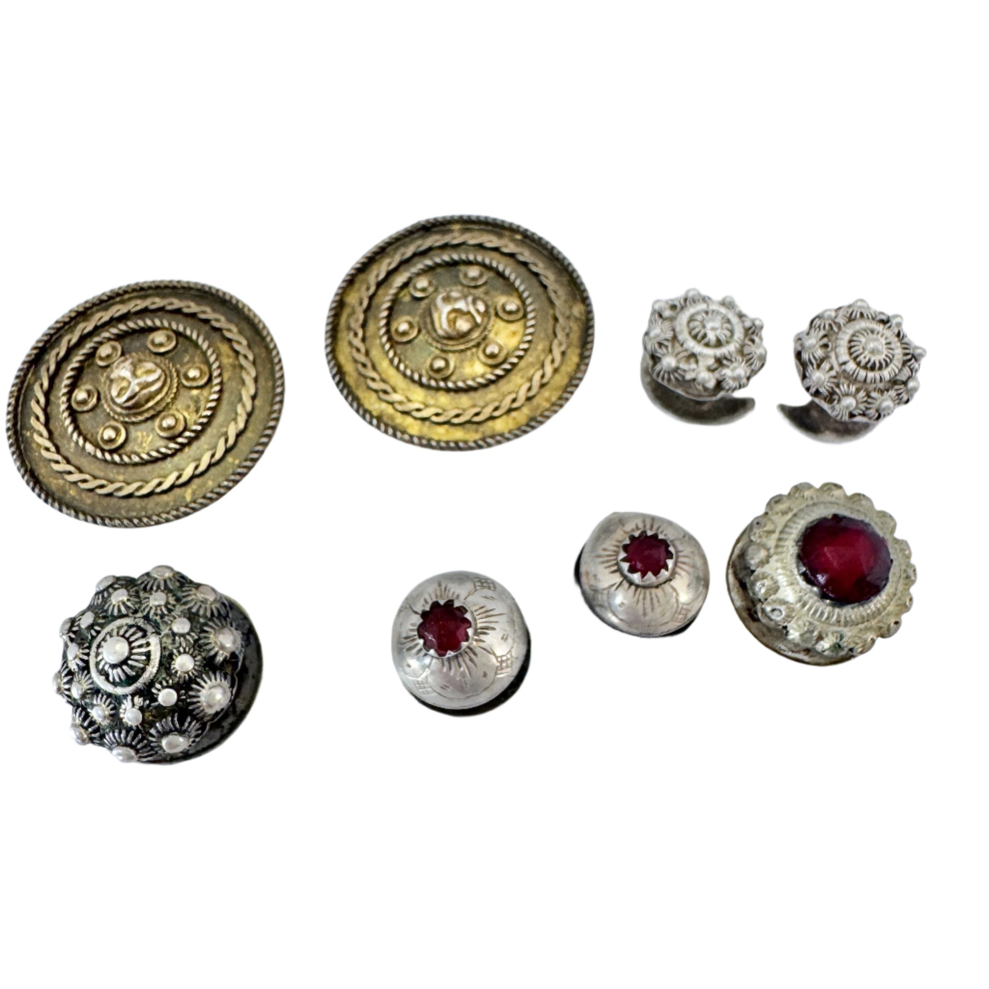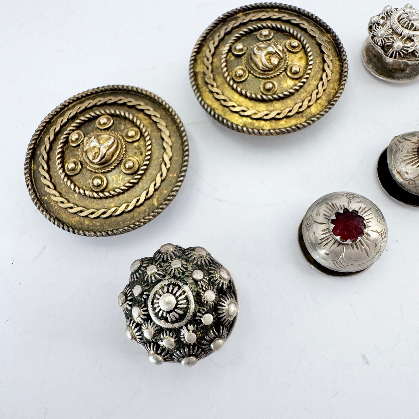 非常に魅力的なアンティークの純銀ボタン (一部にペースト ストーン付き) のコレクション。金メッキが施された 2 つの大きいボタンには、スウェーデンの JPH&Sn、1880 年の刻印があります。赤いペーストが施された 2 つの小さいボタンには、スウェーデンの V&S、1855 年の刻印があります。その他のボタンには、1860 ~ 1870 年代頃のスウェーデンのメーカーの刻印があります。