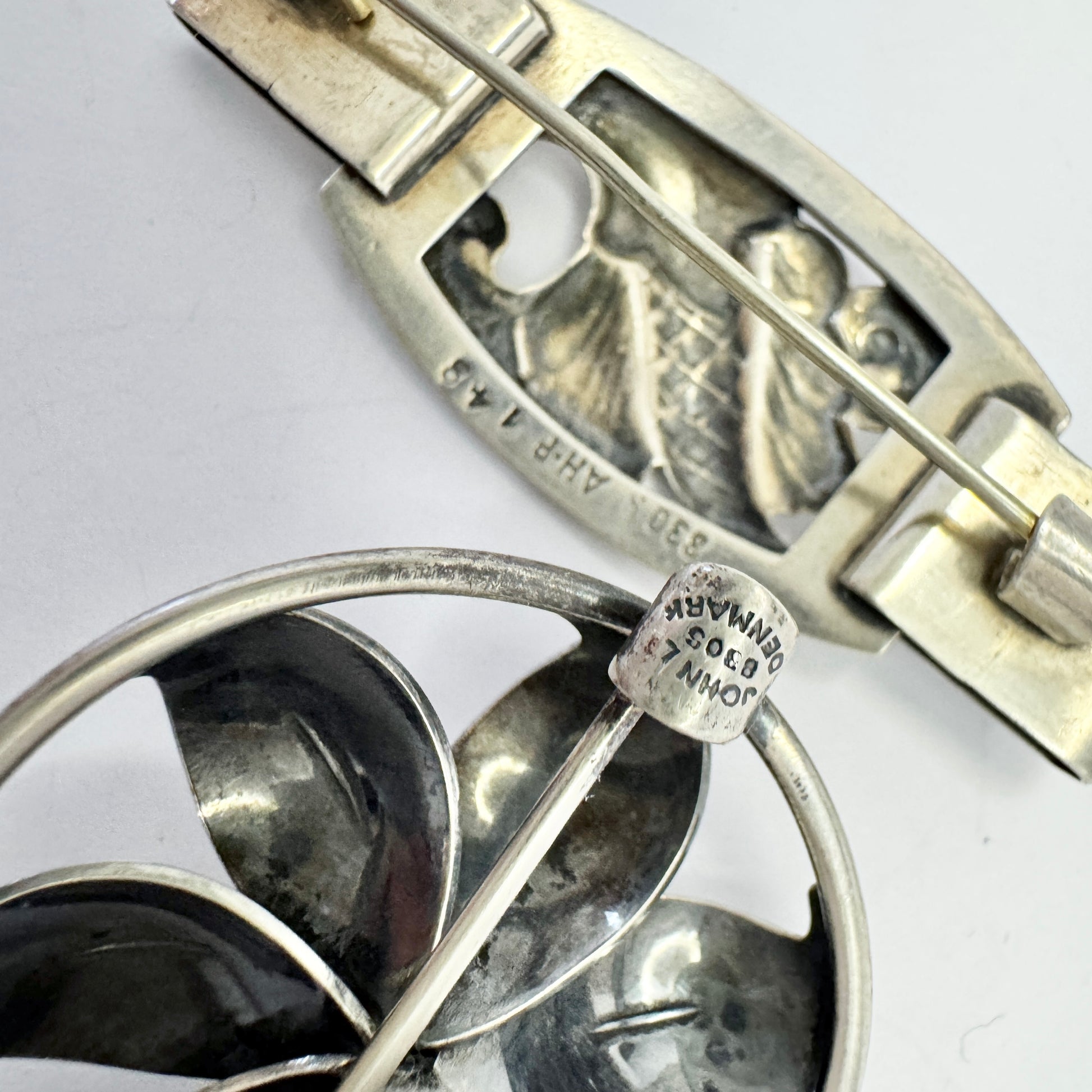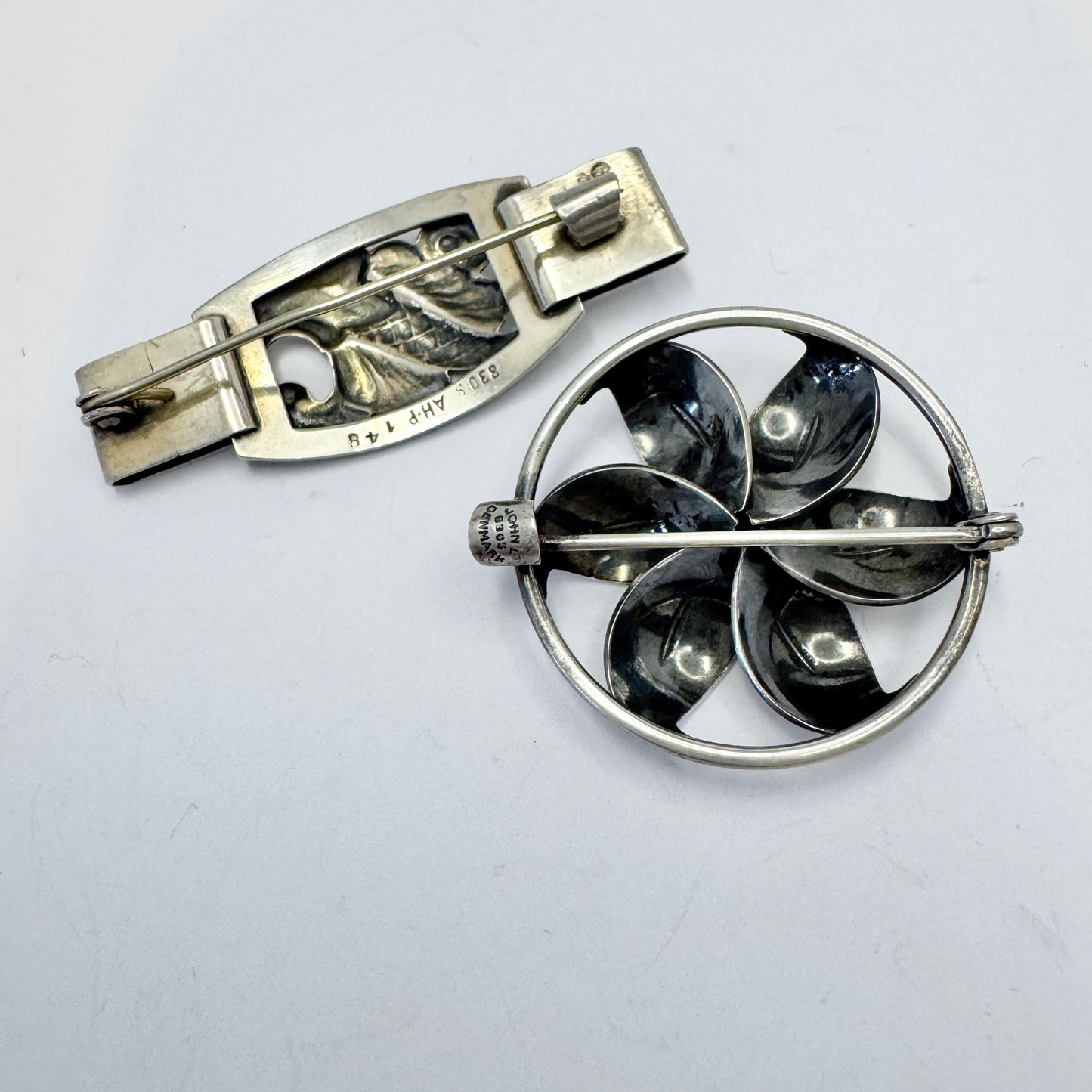 美しいヴィンテージの純銀製ブローチ 2 個。830 シルバーの刻印があり、メーカーは AHP と John L. Denmark です。