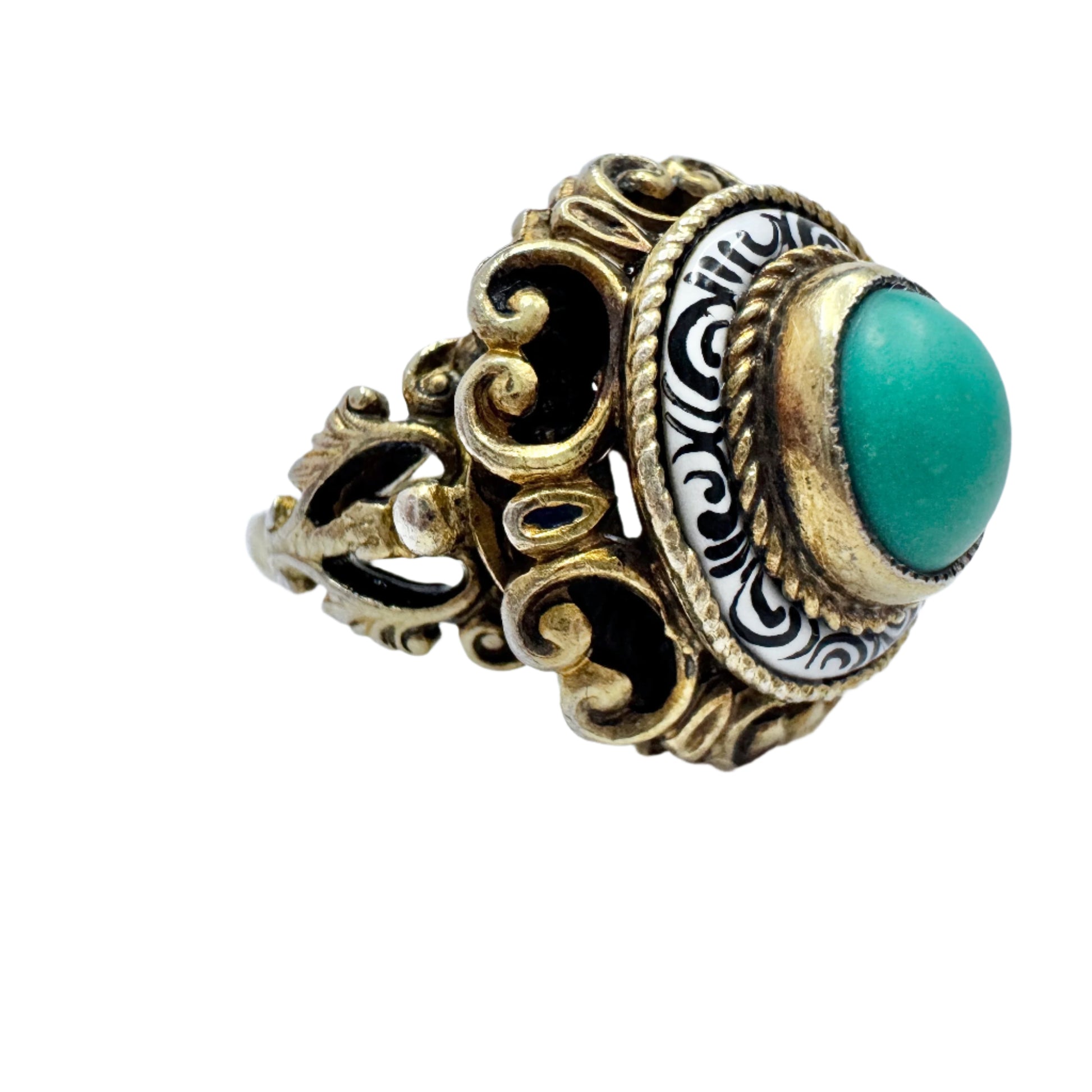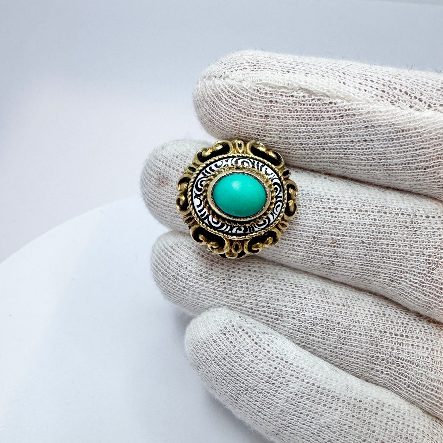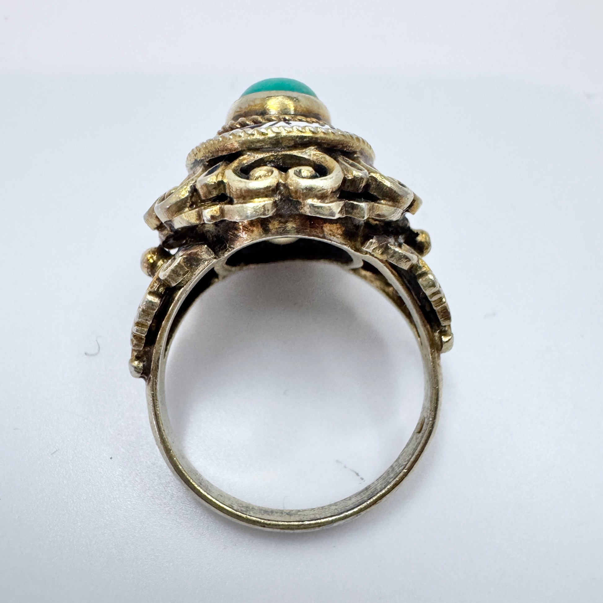 素晴らしく、人気の高いビンテージの金メッキ純銀製ターコイズエナメルリング。刻印は不明瞭。ヨーロッパ大陸、おそらくハンガリー製、1930~40年代。