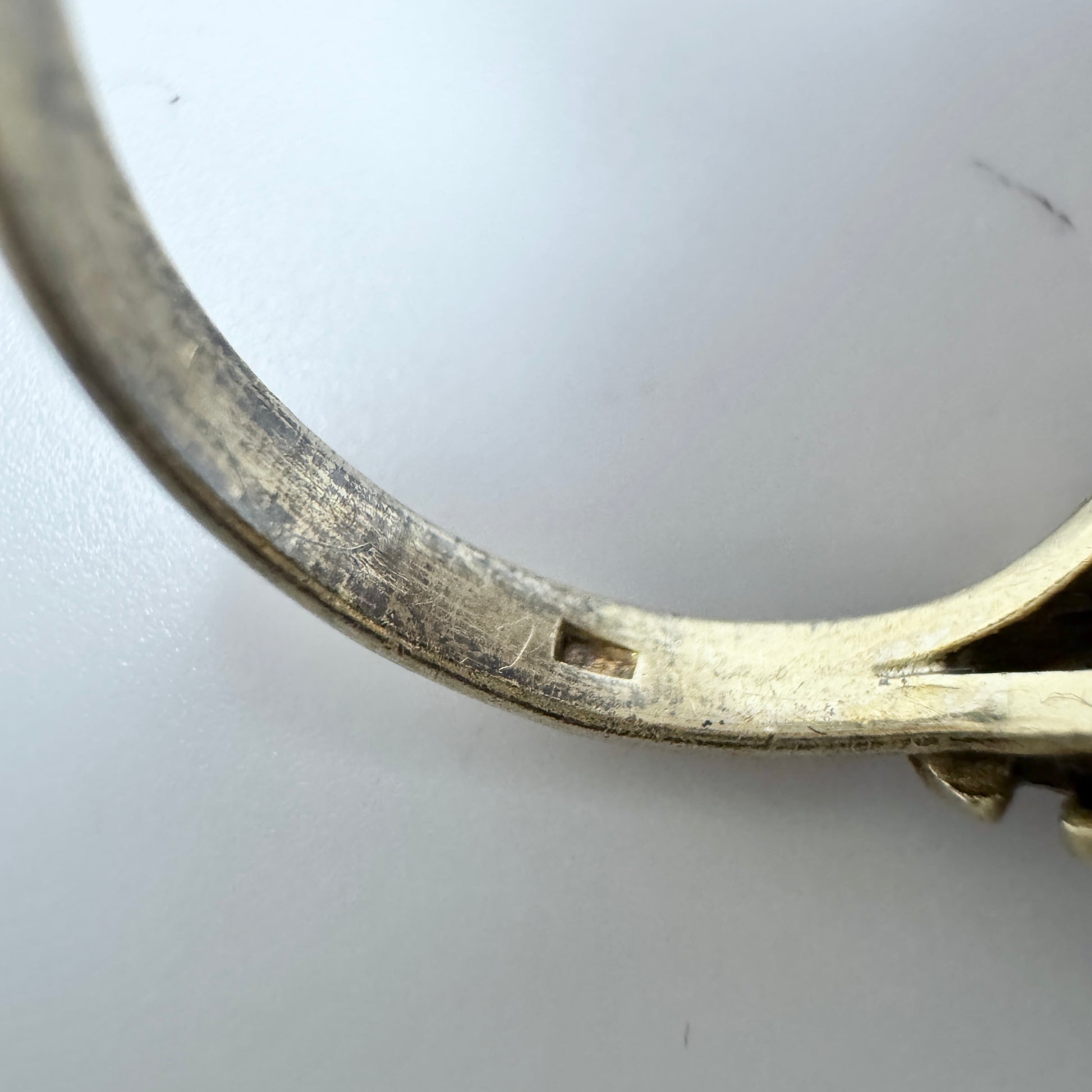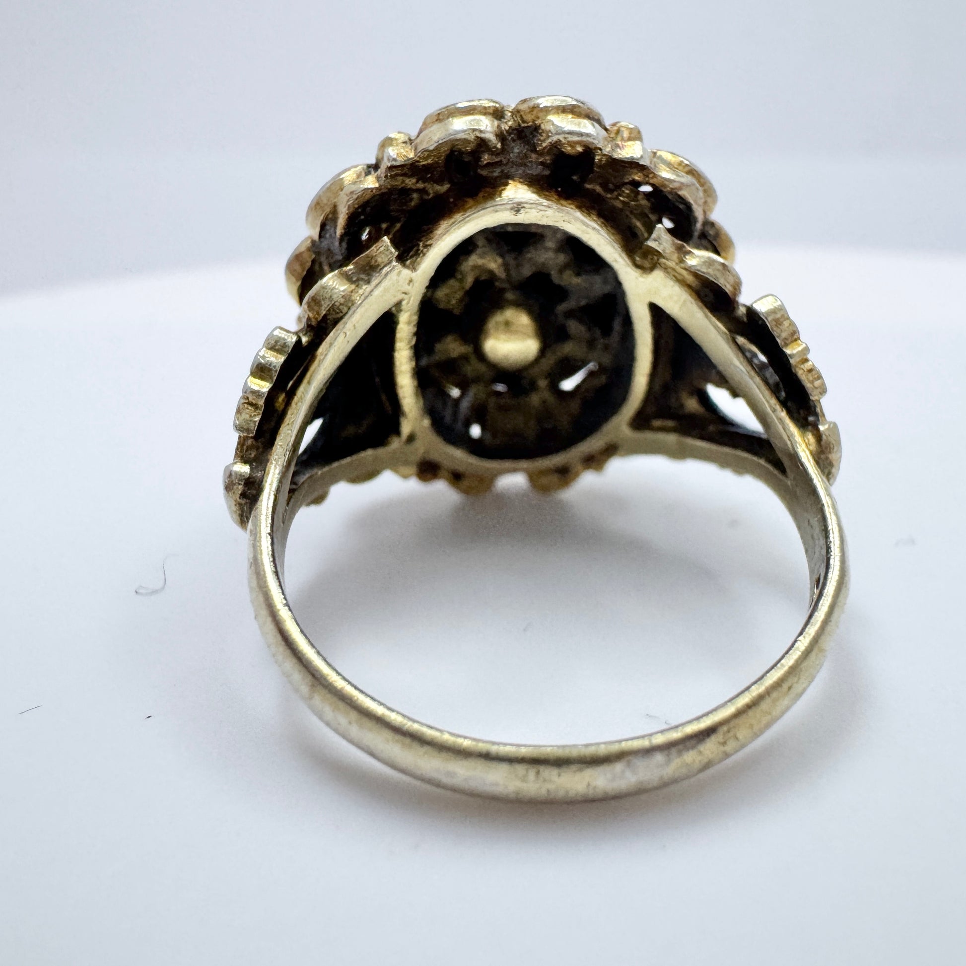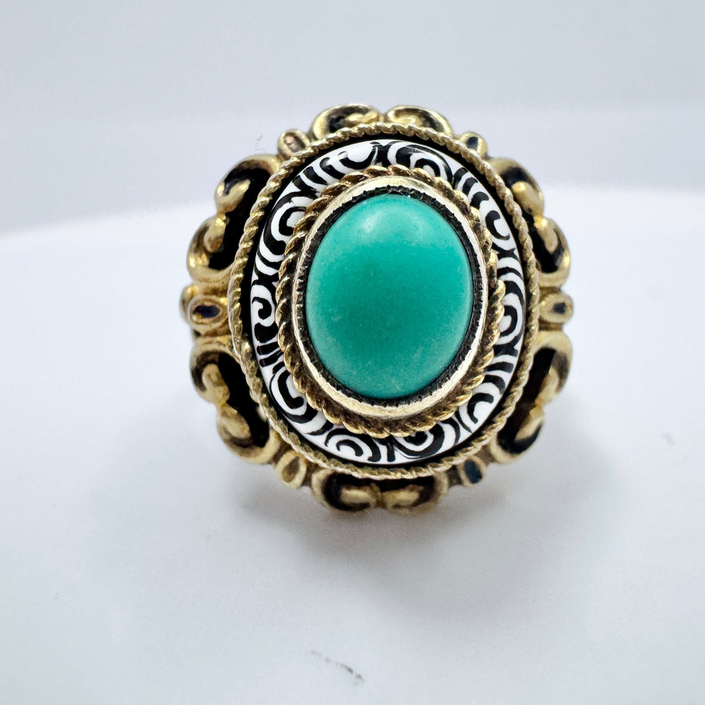素晴らしく、人気の高いビンテージの金メッキ純銀製ターコイズエナメルリング。刻印は不明瞭。ヨーロッパ大陸、おそらくハンガリー製、1930~40年代。