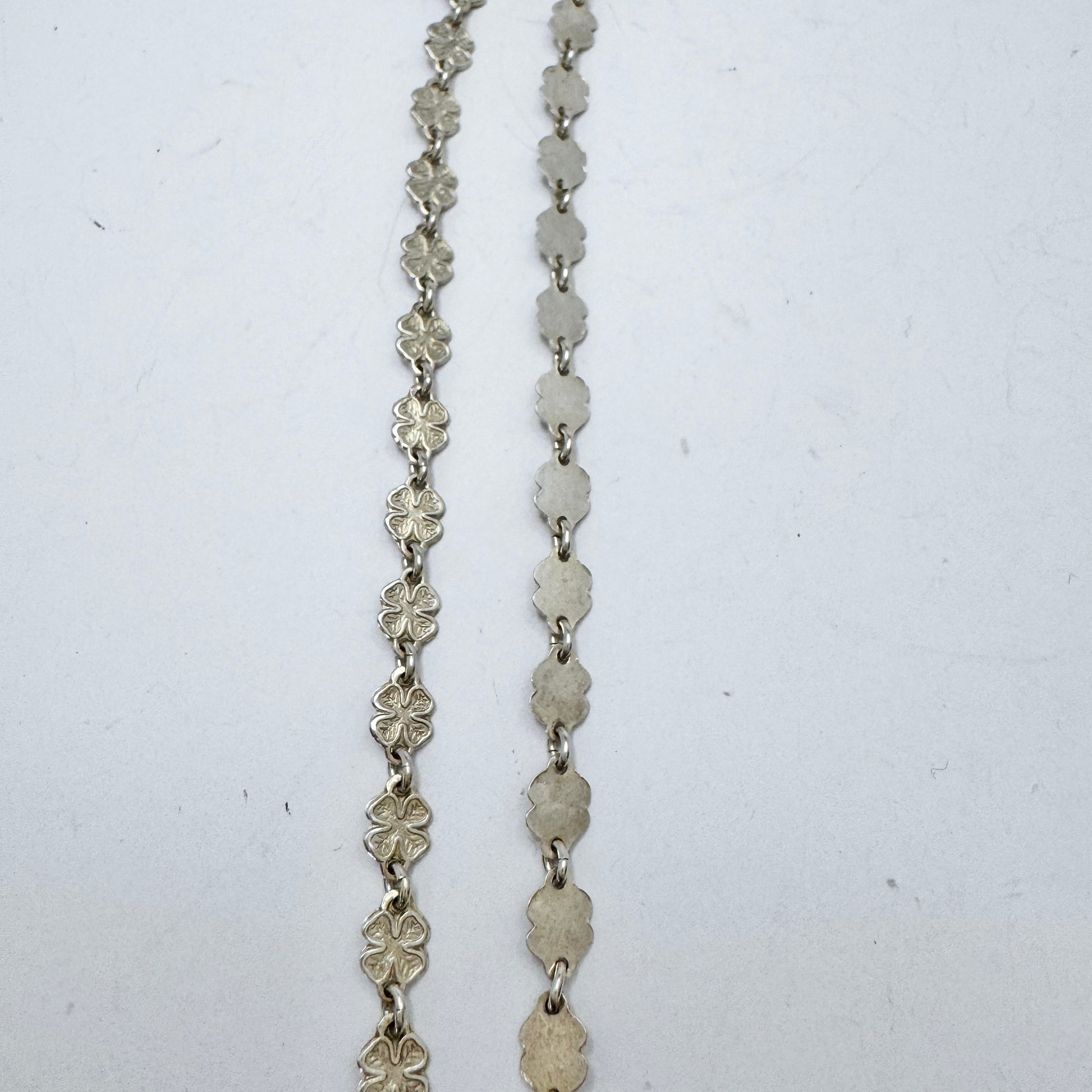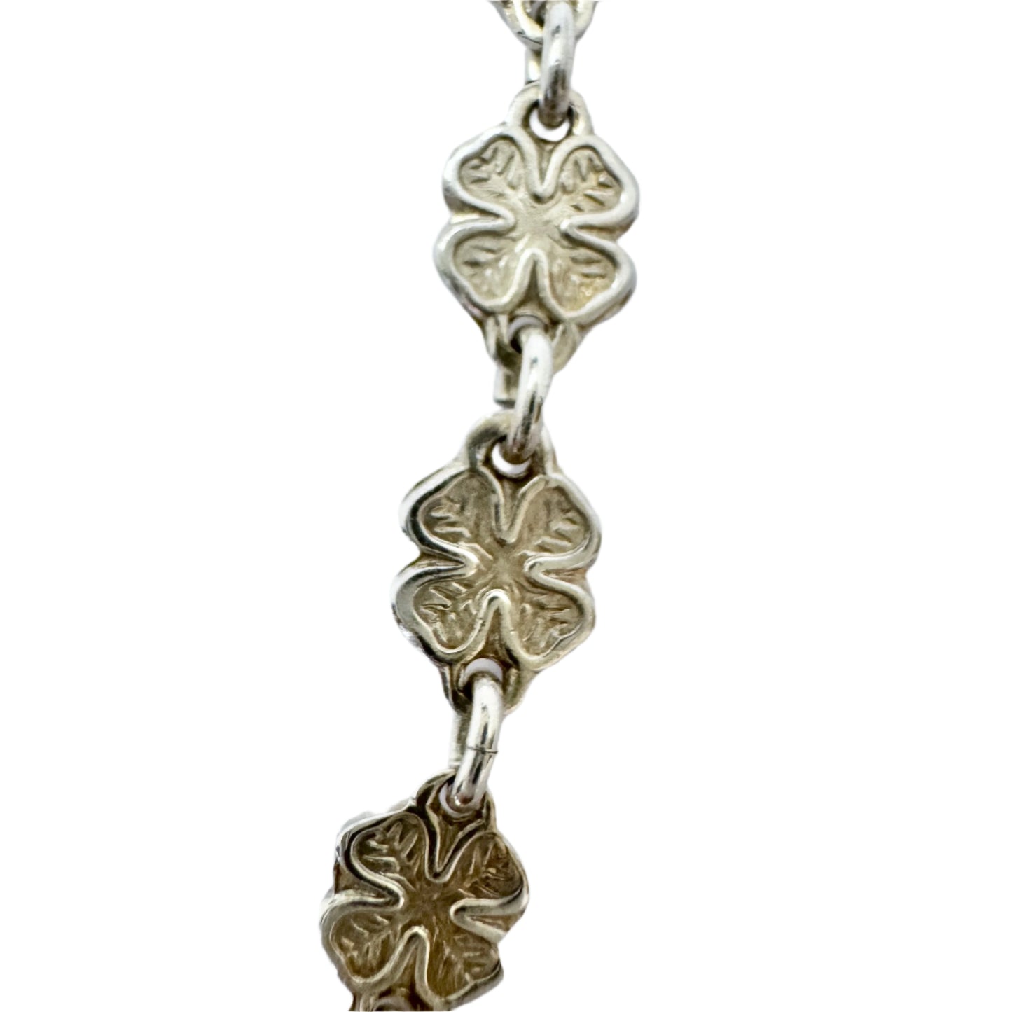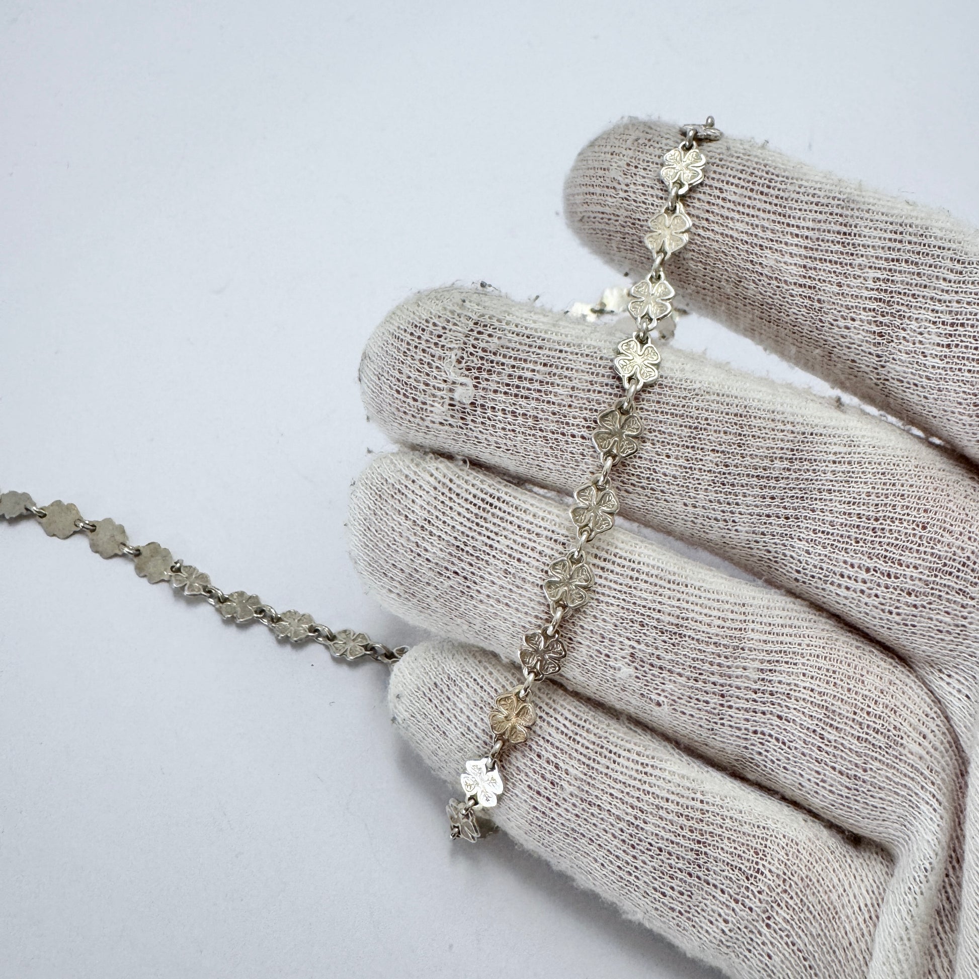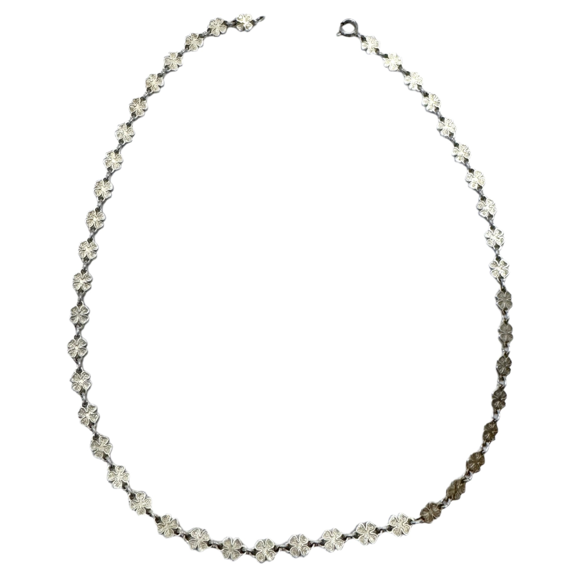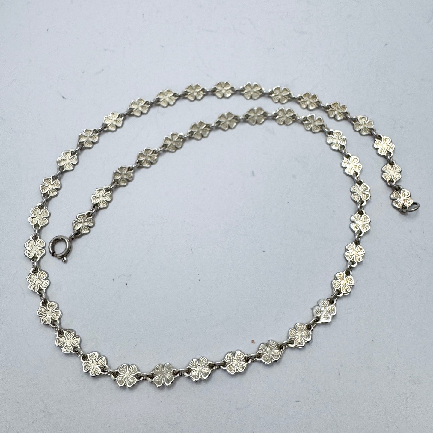 非常に魅力的で繊細なヴィンテージの純銀製四つ葉のクローバーネックレス。刻印 830S、おそらく 1950 年代のデンマーク製。